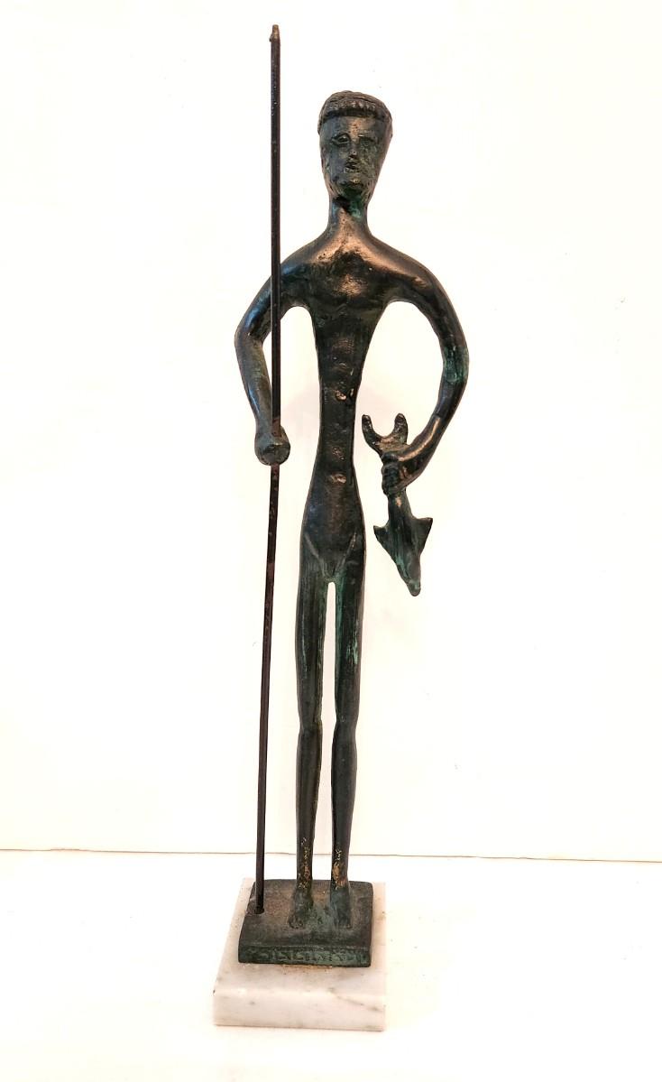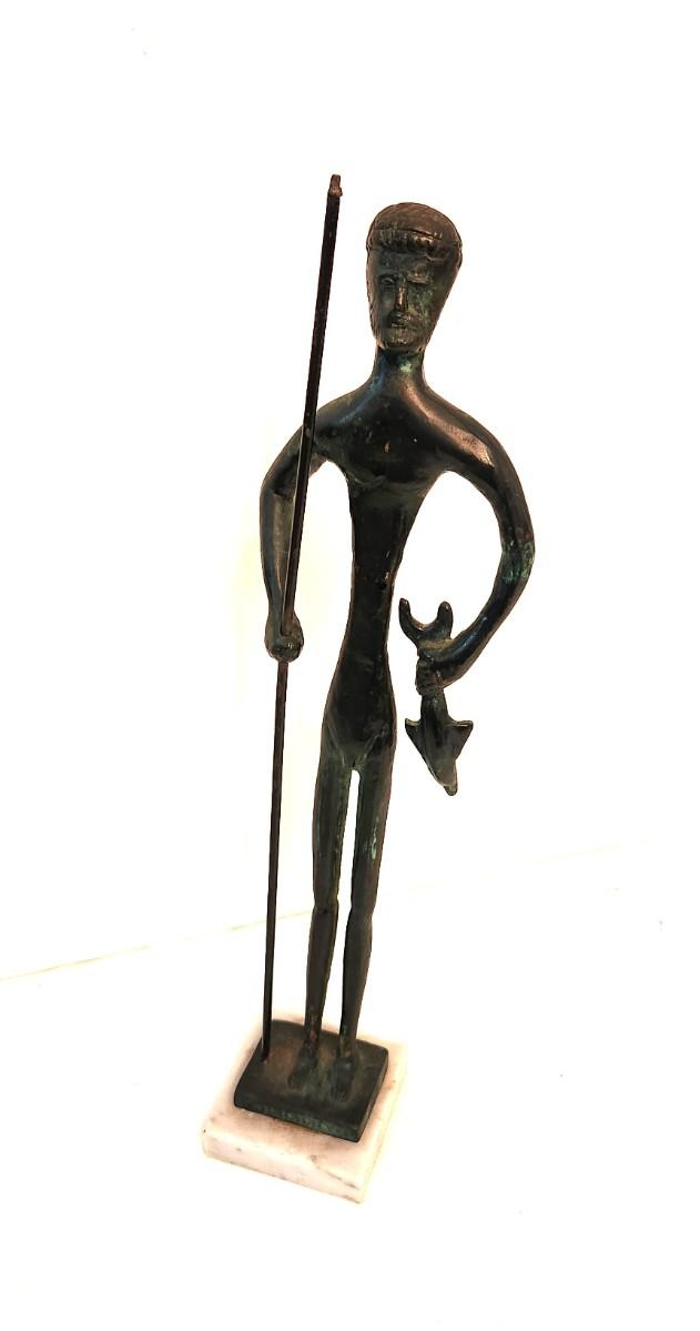 Metal Sculpture on marble base - Warrior with Fish and Spear. 16" tall. Good condition.
