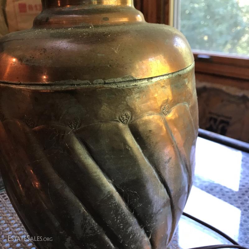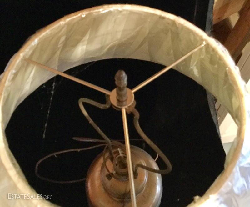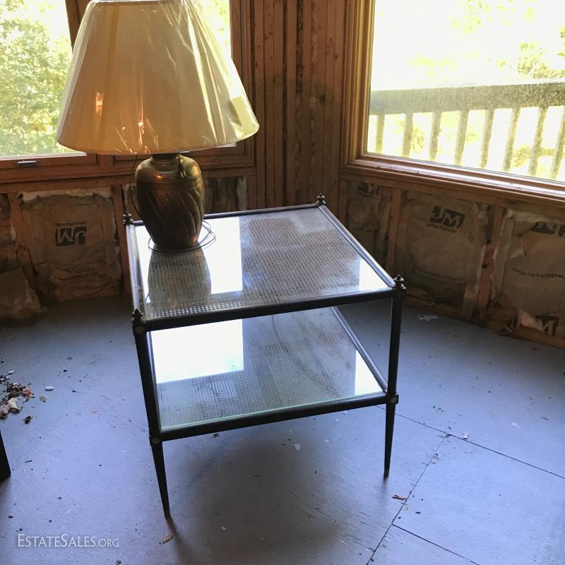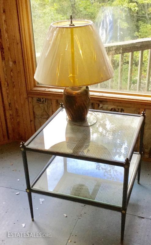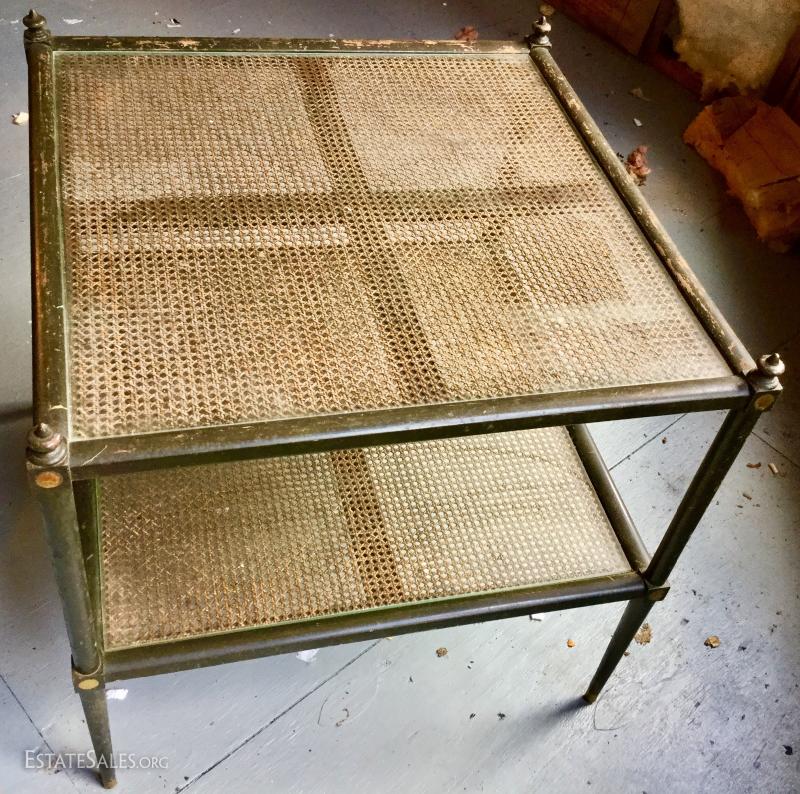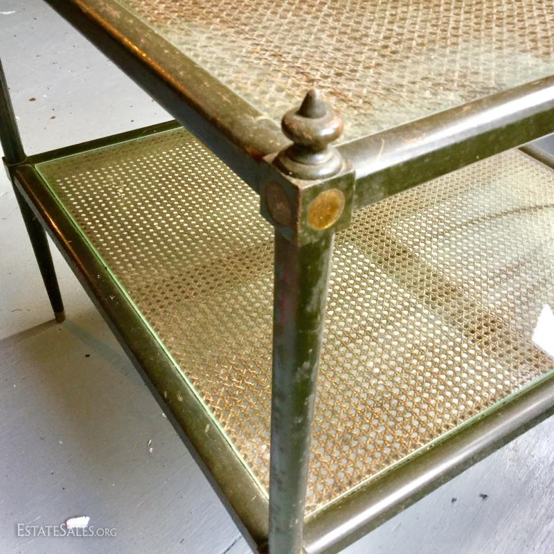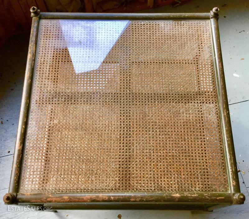 Gorgeous cane table with cane on both upper and bottom shelf. Glass insert protects the cane and has kept it in good condition all these years. Wood has great detail. Very sturdy with some scratches. Measures 26"square by 24.5h. Lot also includes copper lamp with new shade. Base is 7" wide and 13" high. Shade makes it 26"high. See photos. No Shipping. Only local pick up in Flat Rock, NC.