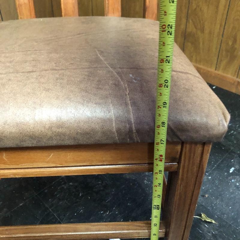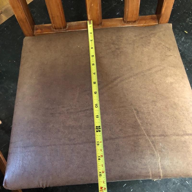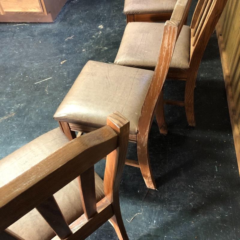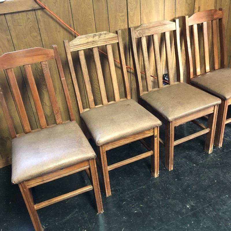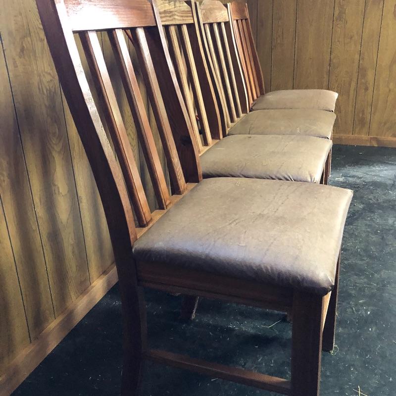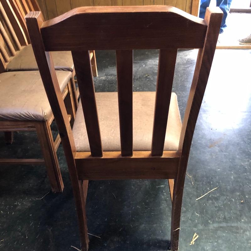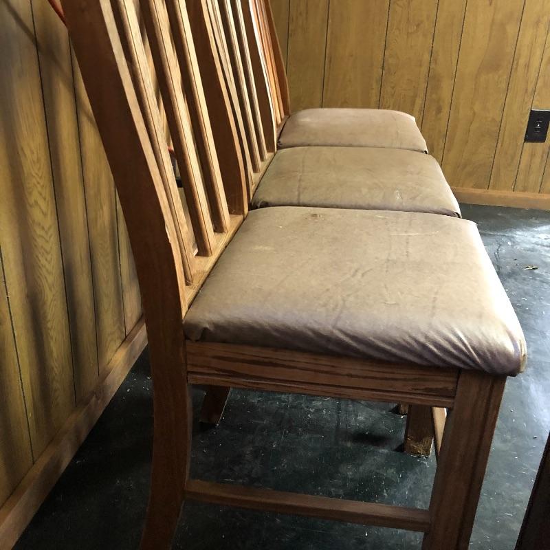 This lot includes a wooden table and four chairs. The table does not open nor include leaves. The dimensions are approximately 42” X 42”. It would be perfect for a smaller dining space. Chairs seats are upholstered with vinyl. Chair seat height is approximately 18.5”. Local pick up only.