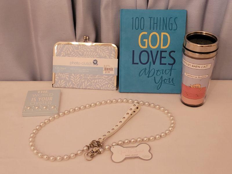 Lot 170: NEW Travel Cup, Book, Notepad, Dog Leash, Photo Clutch