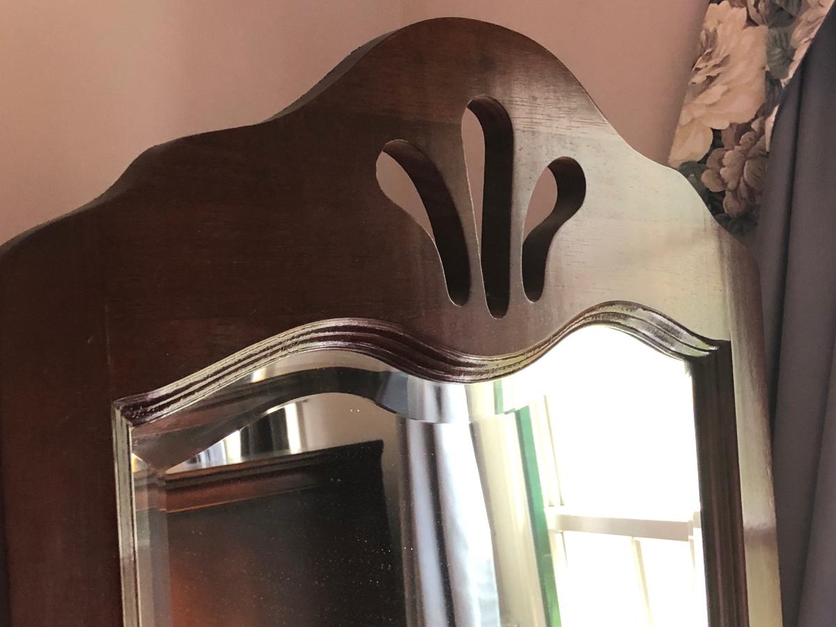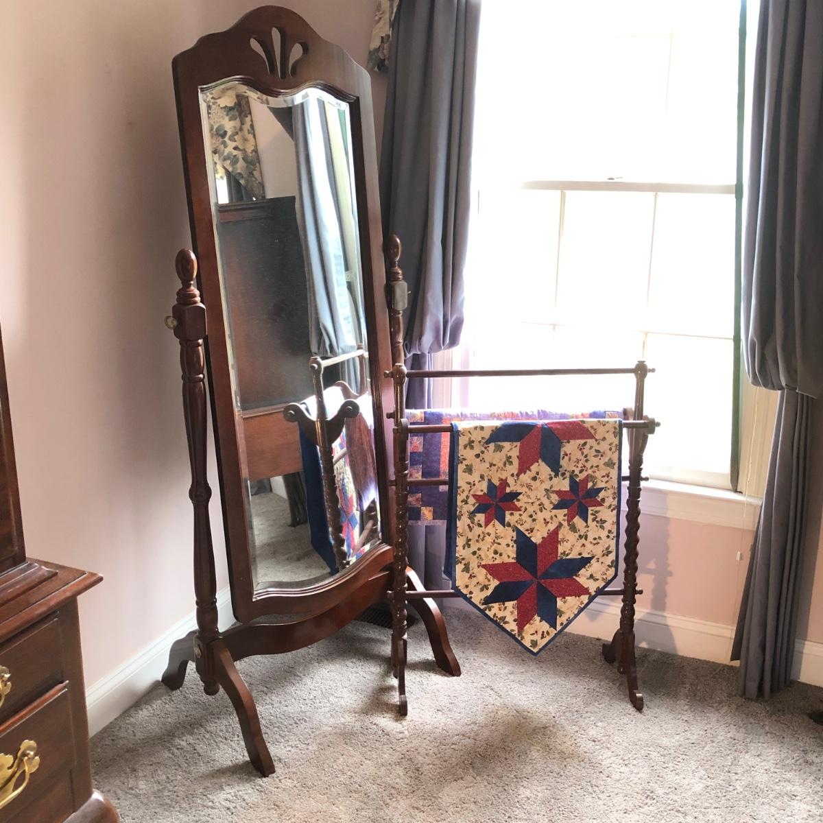 Includes vintage mirror and quilt rack with two small quilts. Mirror measures 28W x 2D x 67H.