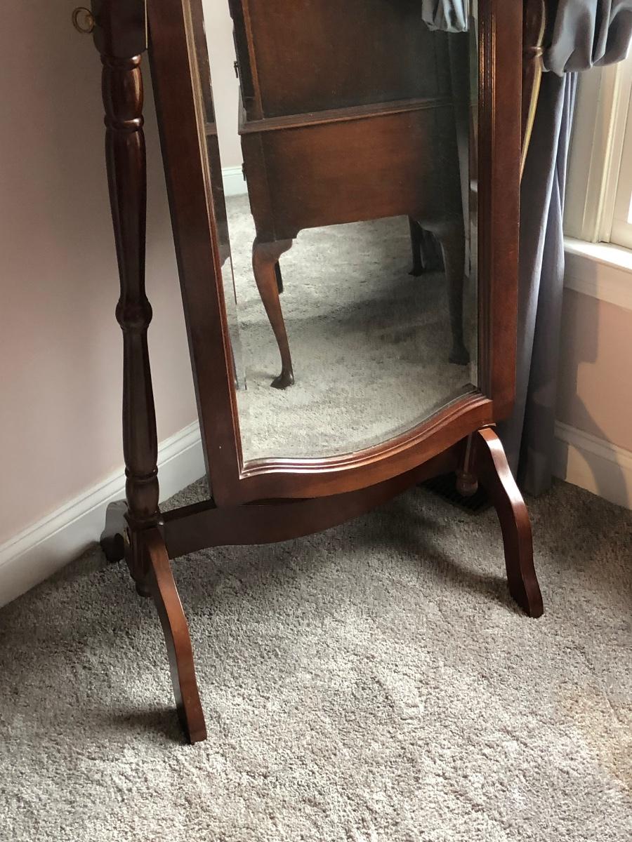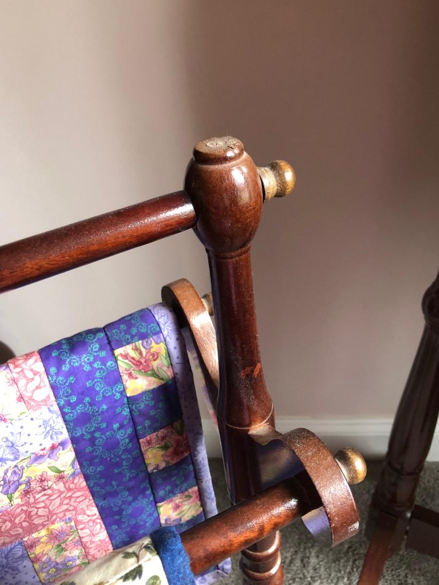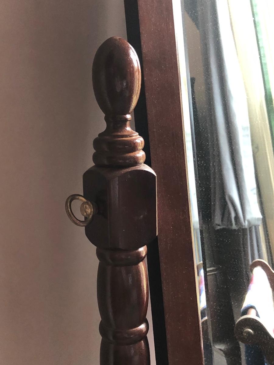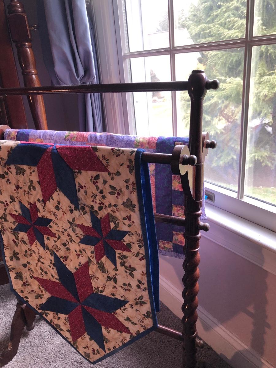 Both the mirror and quilt rack have loose parts and are in need of repair.