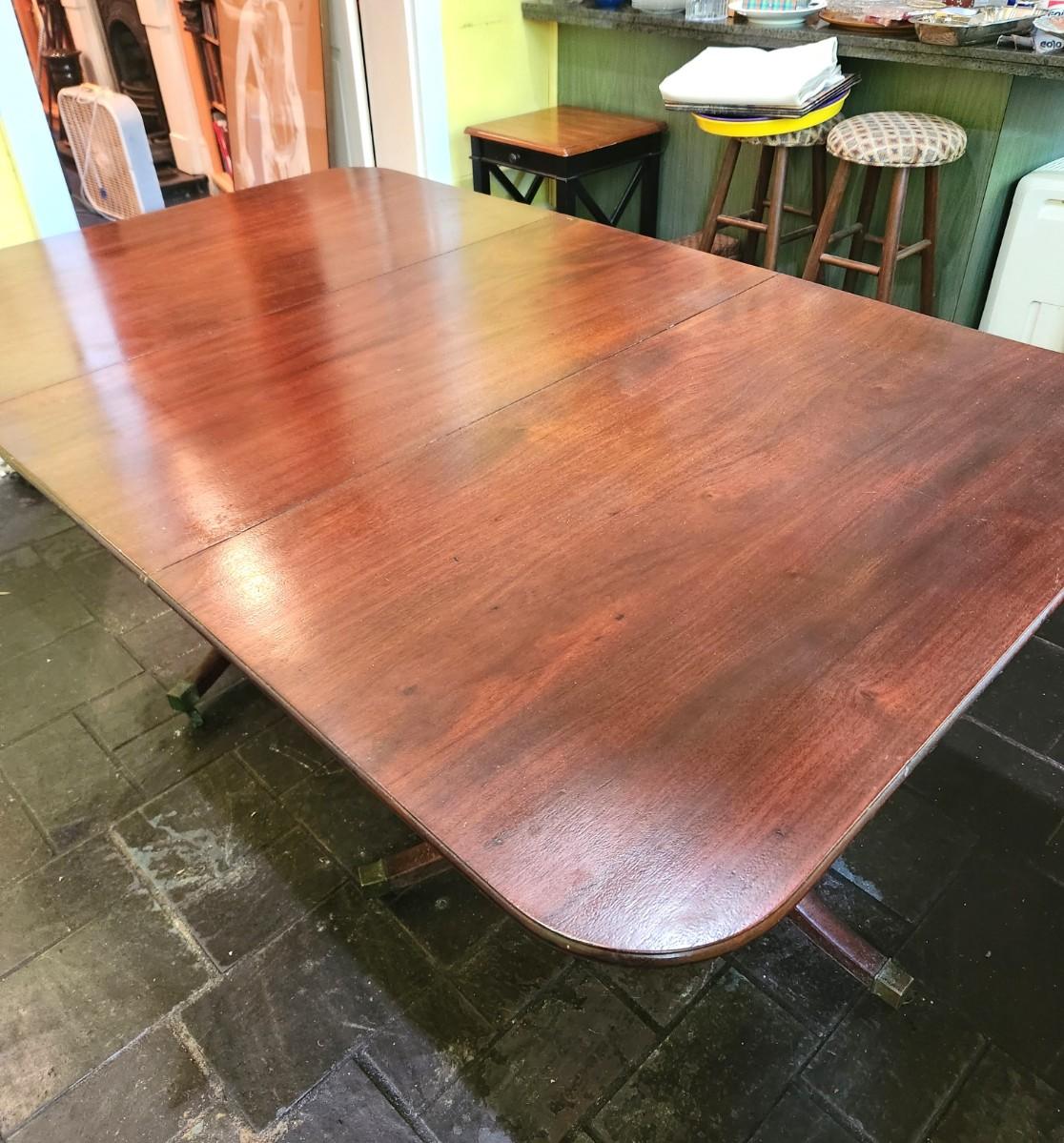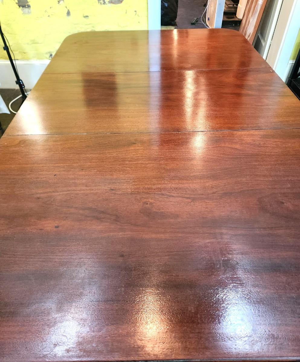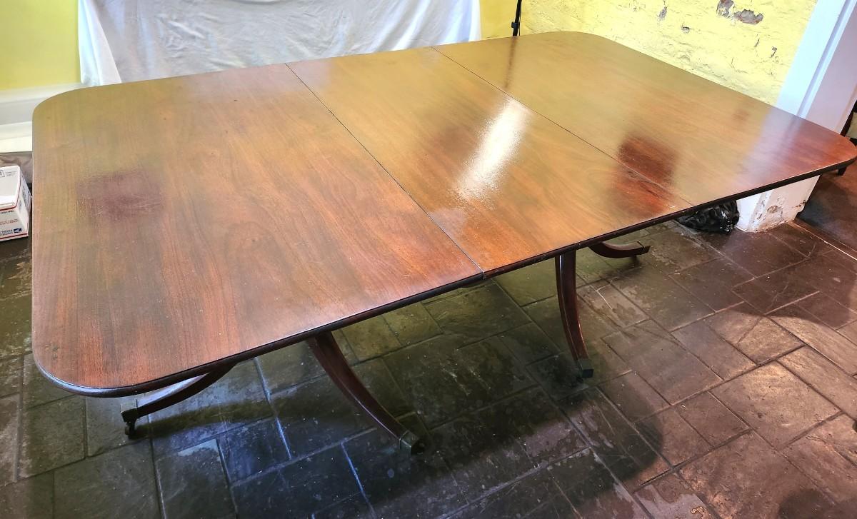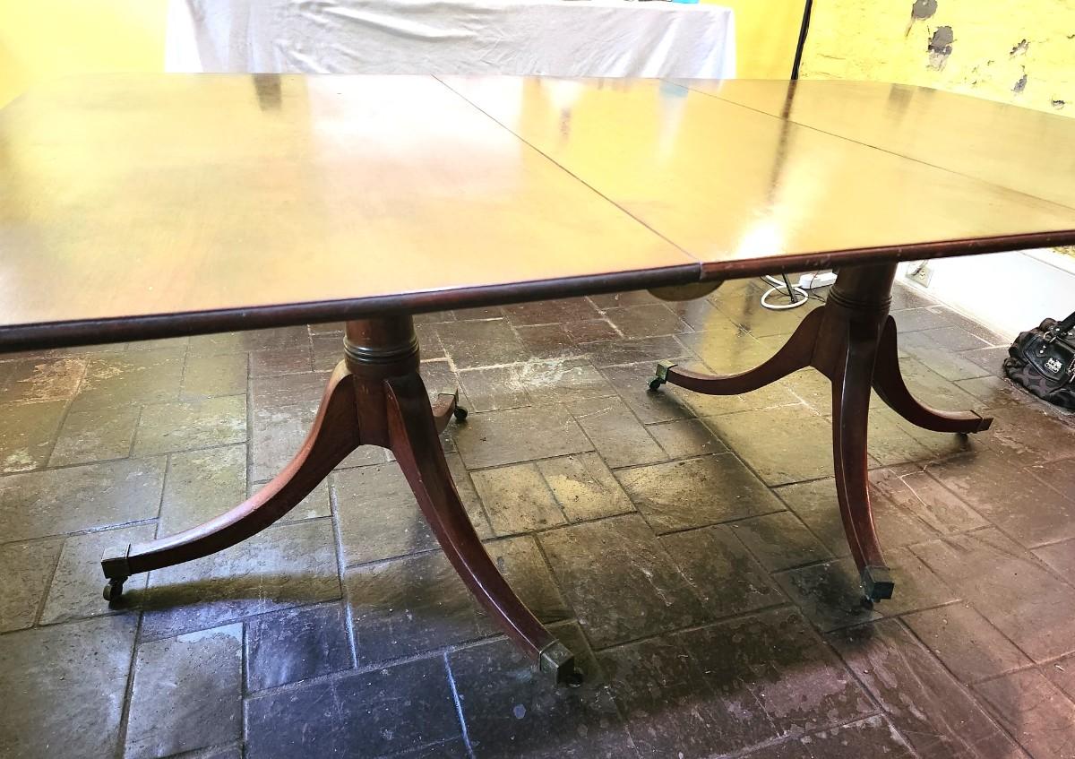 Antique Dining Table w/one leaf. Measures 73" long when fully extended, 28.5" tall. Leaf alone is 20" long. Probably Mahogany, interesting locking mechanism (works). Has castors but some are "stuck". Piece comes completely apart. Good antique condition.