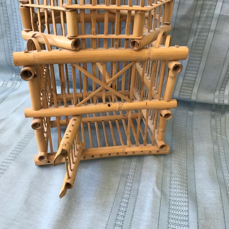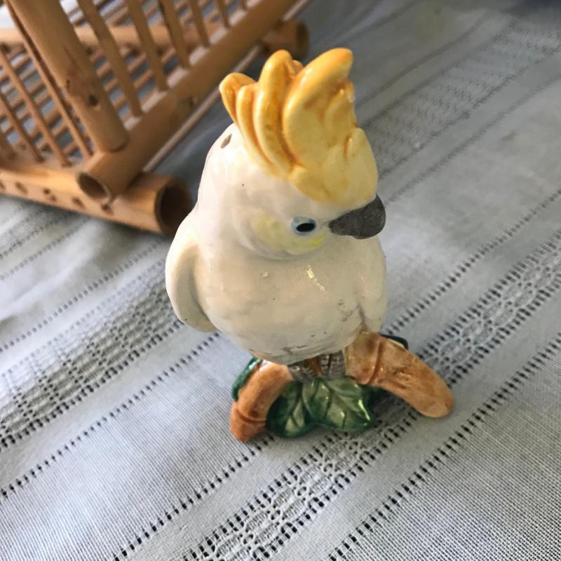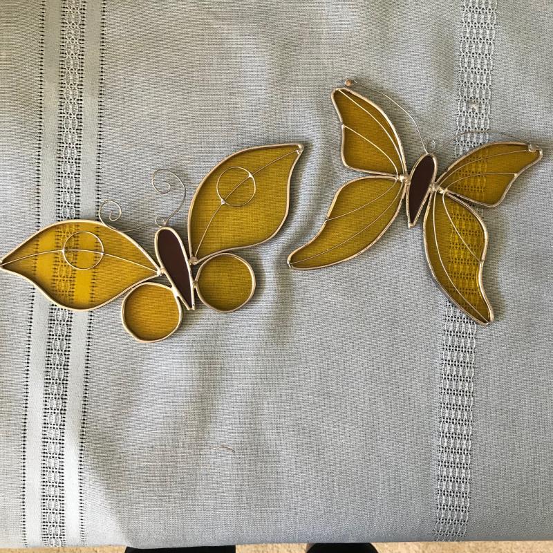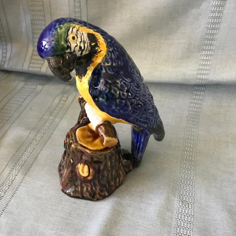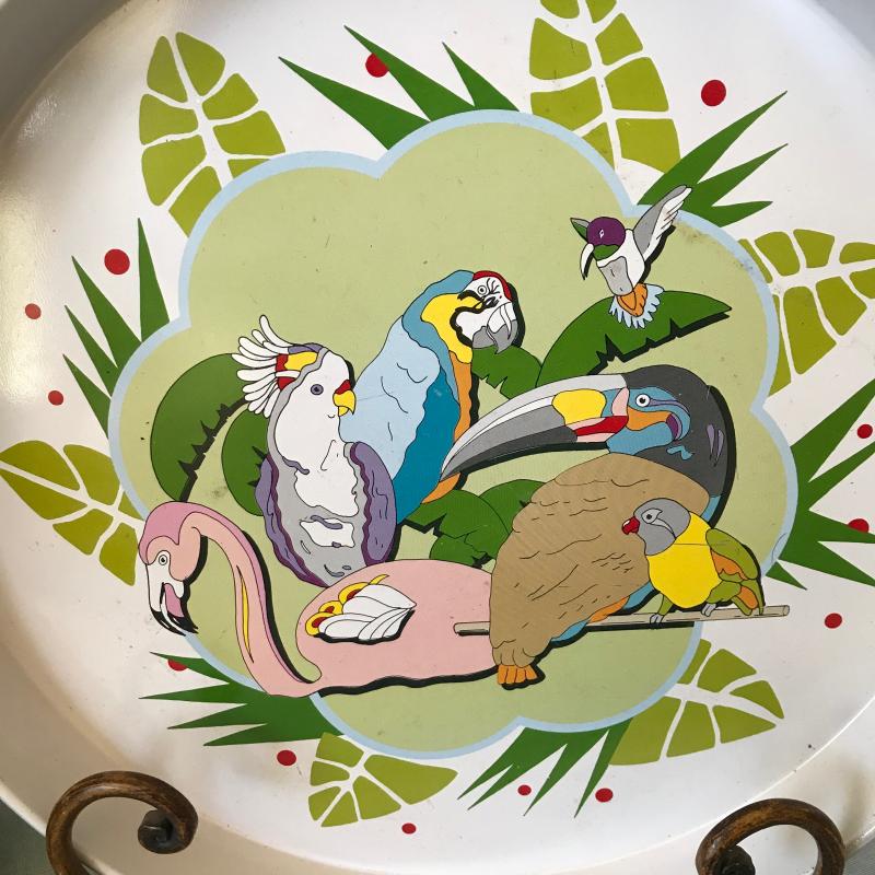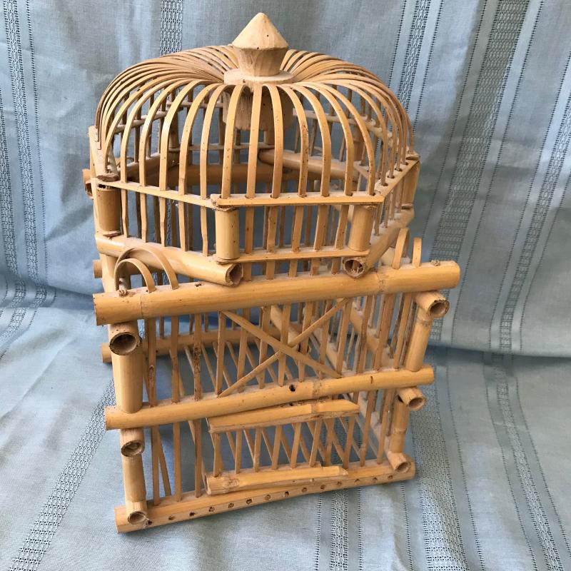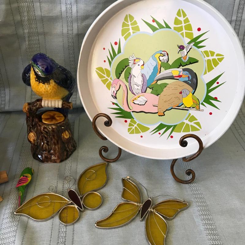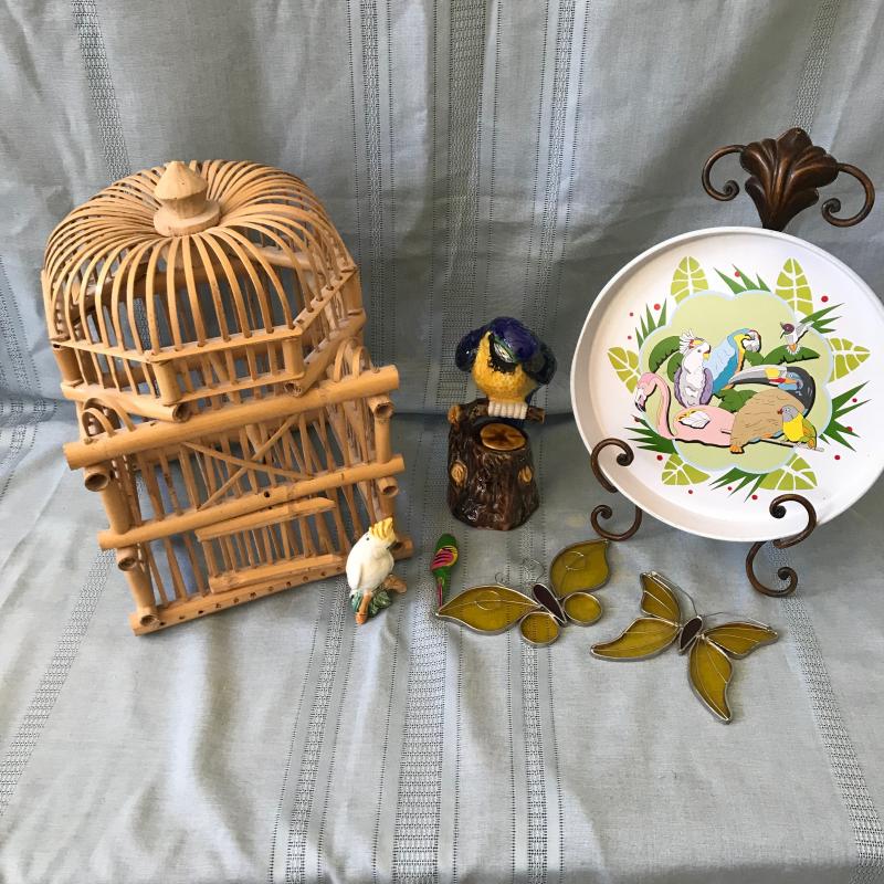 Lot includes a decorative bamboo bird cage, a blue parrot, a small cockatoo that was part of a S&P set, a fun serving tray and two butterfly stained glass pieces. Cage measures 11” sq x 17”h. Tallest bird measures 10”h. Shipping or local pick up.