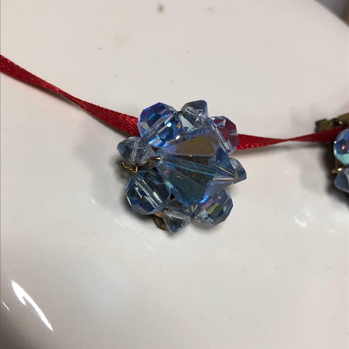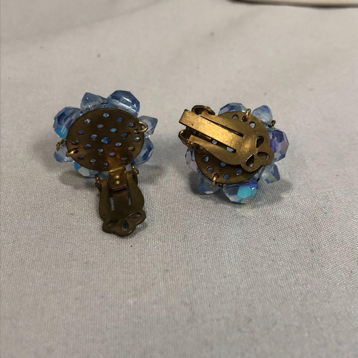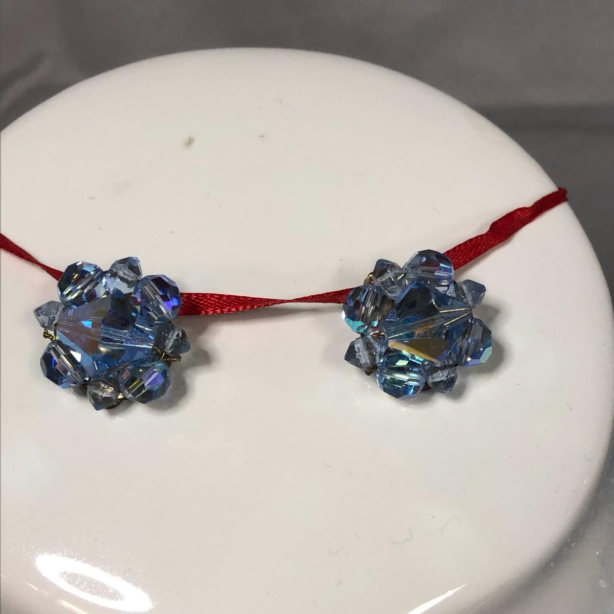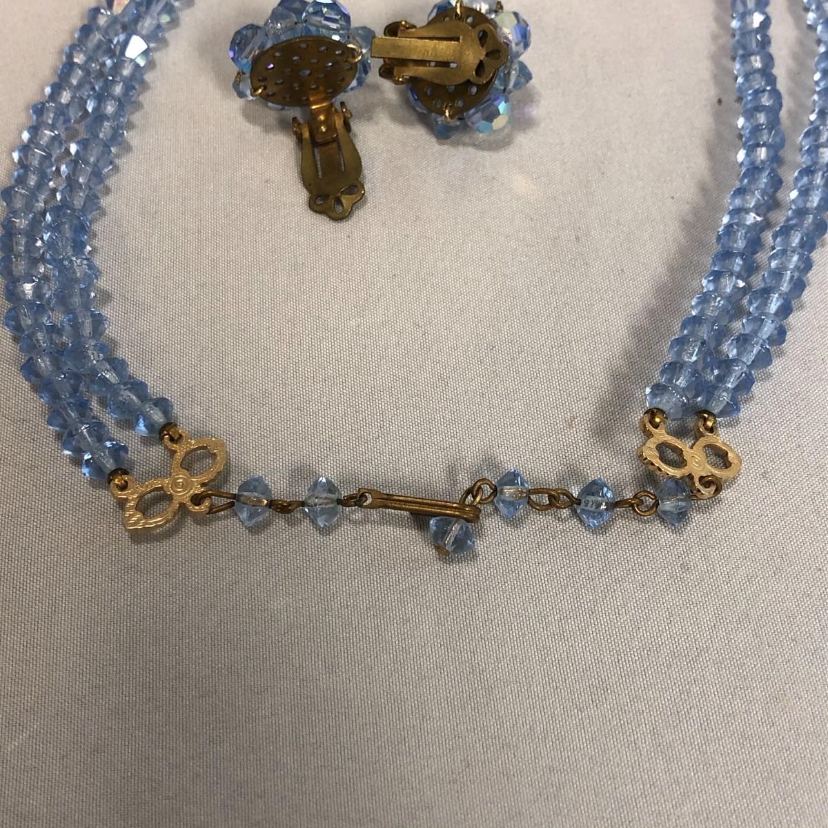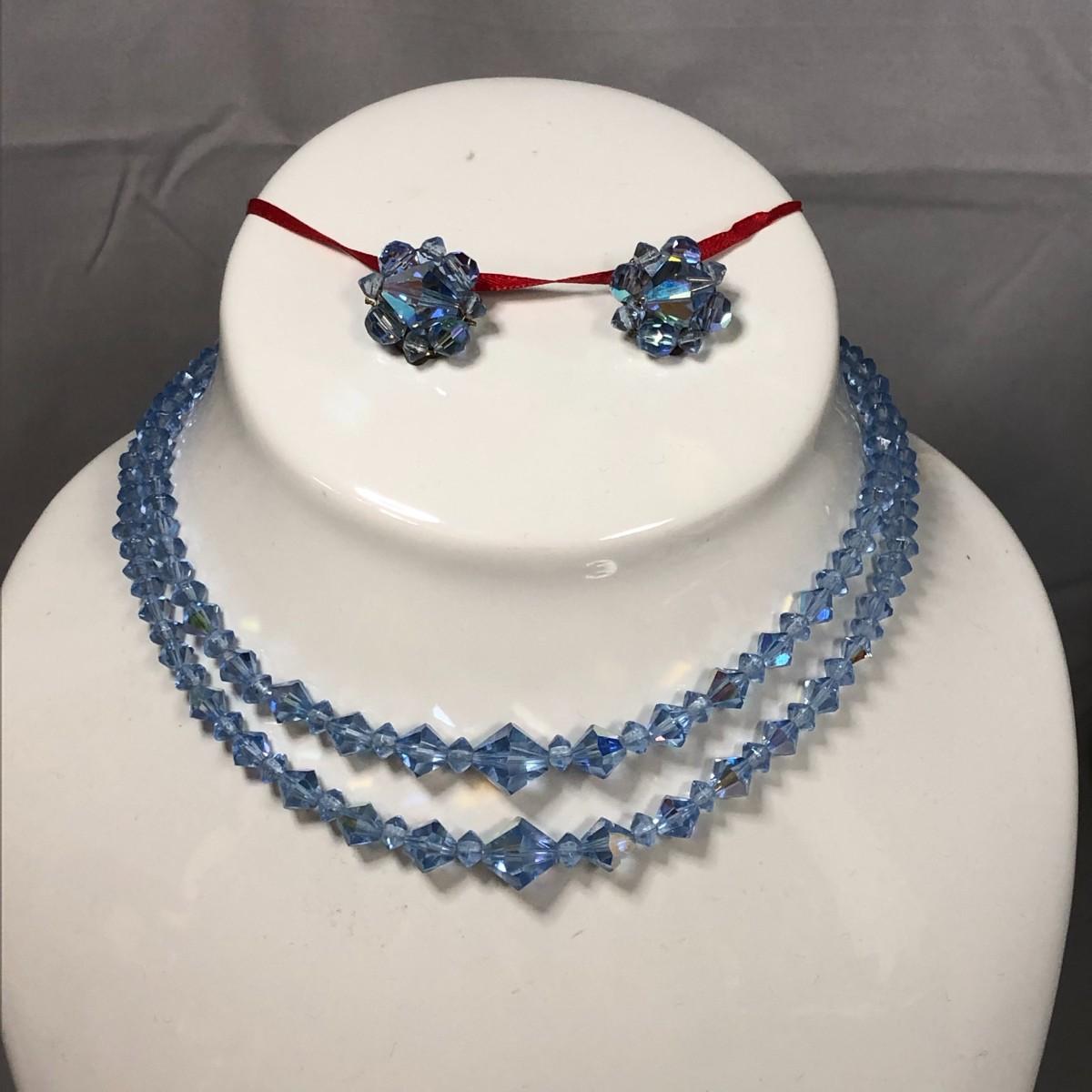 Pretty light blue set that doesn't have any issues. The earrings are clip-on and the choker is about 15" long.