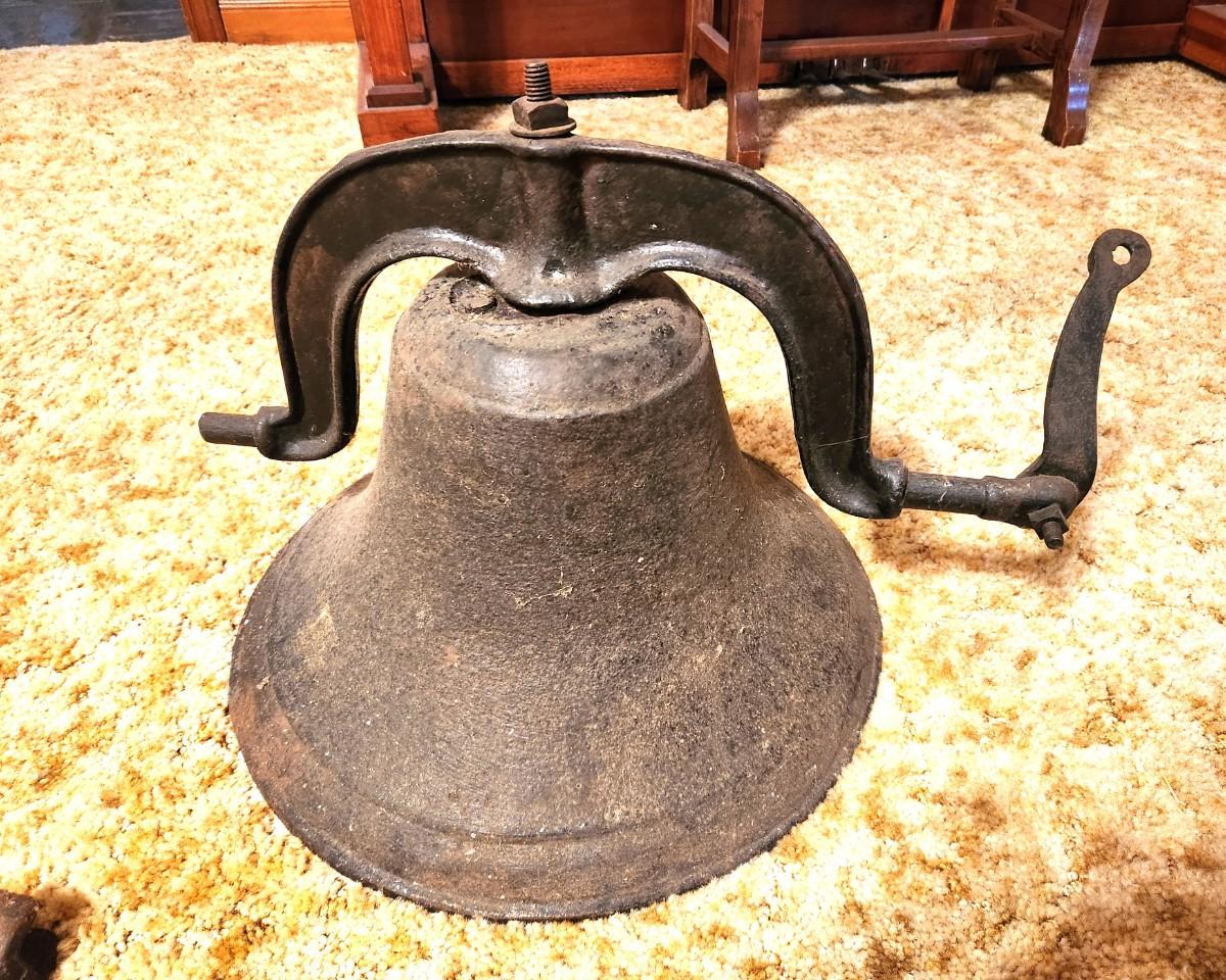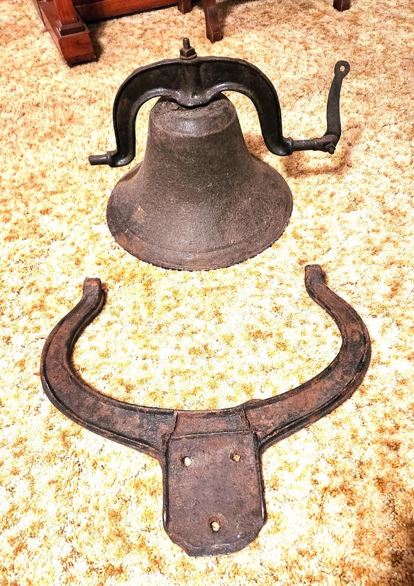 Cast Iron Plantation Style Bell with cradle - has some age to it - Bell is 13" tall, 23" across.