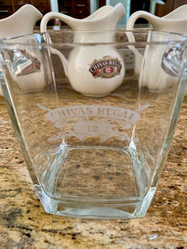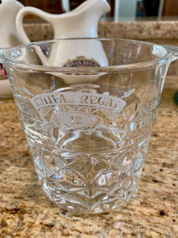 Group of Chivas Regal barware. 2 glass ice buckets & 3 Chivas Regal pitchers.