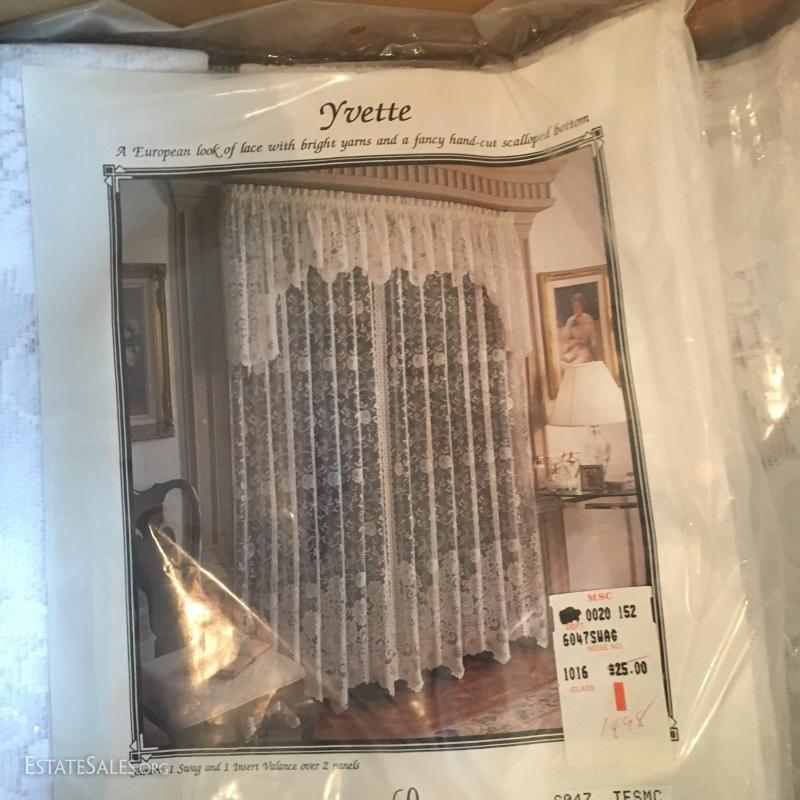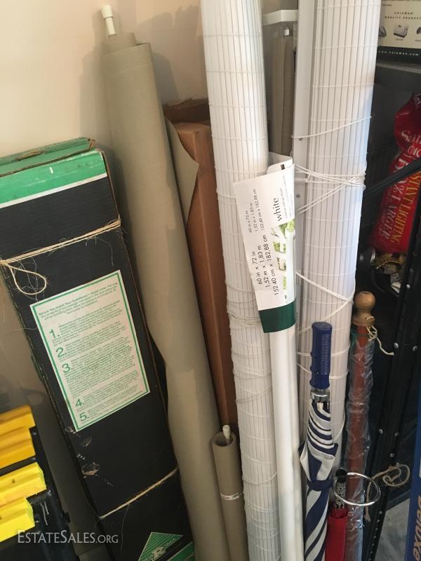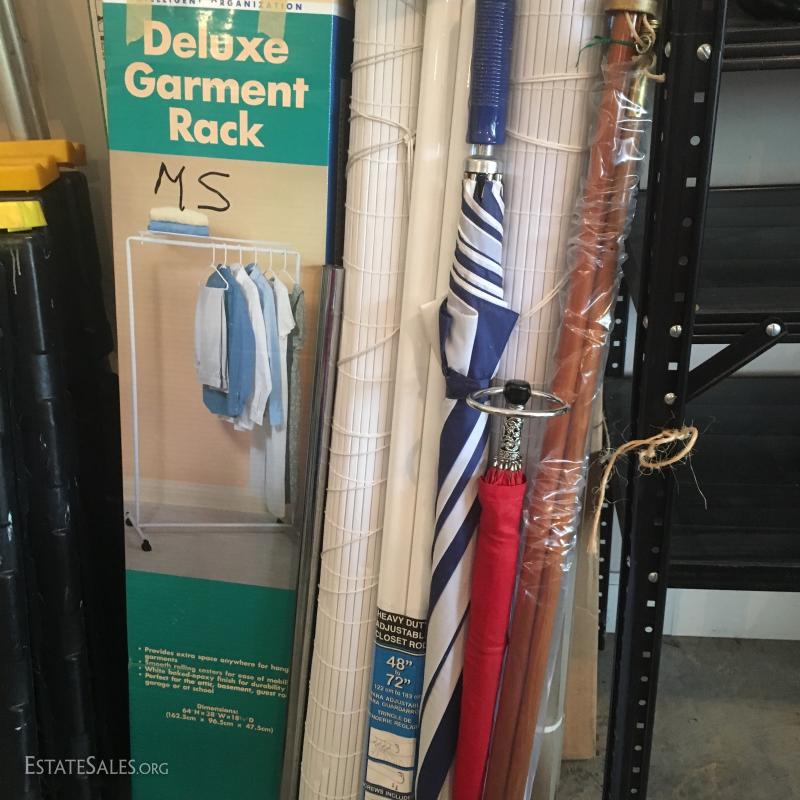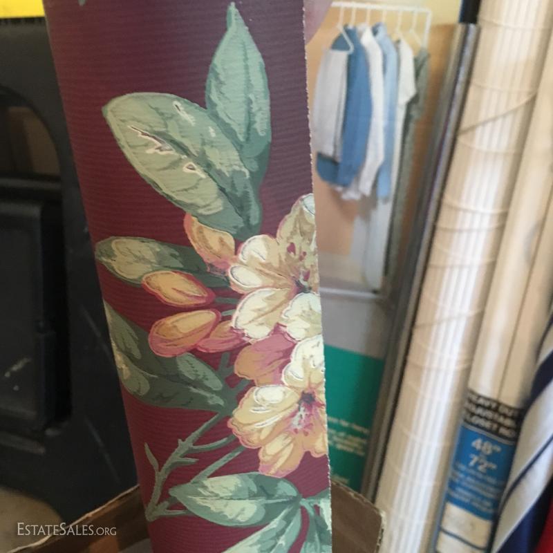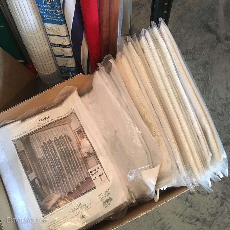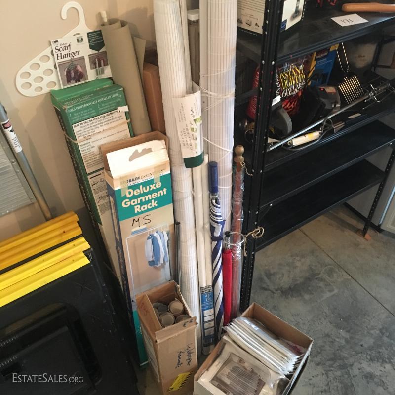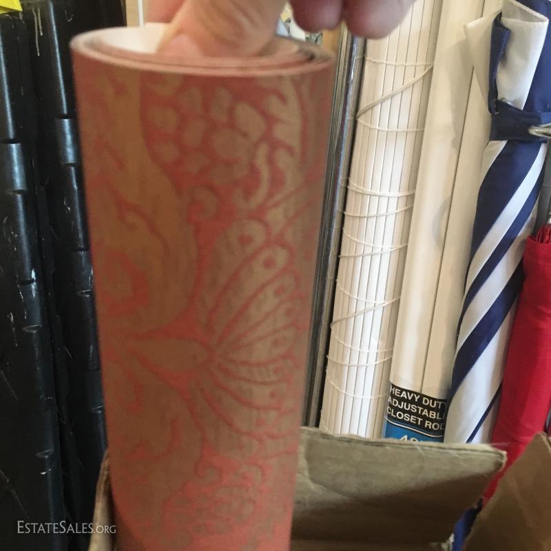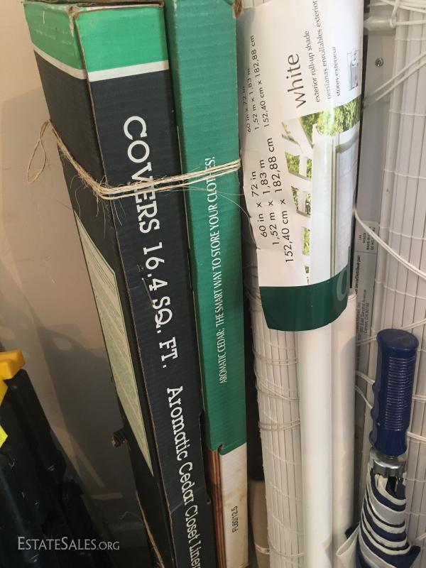 Cedar Closet liner, box of valances & panels, deluxe garment rack, closet rod, scarf hanger, two white window shades (60" x 72") and some wallpaper remnants.