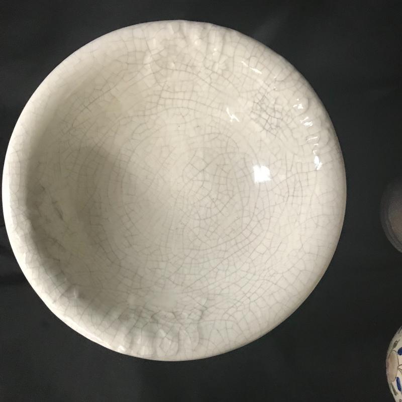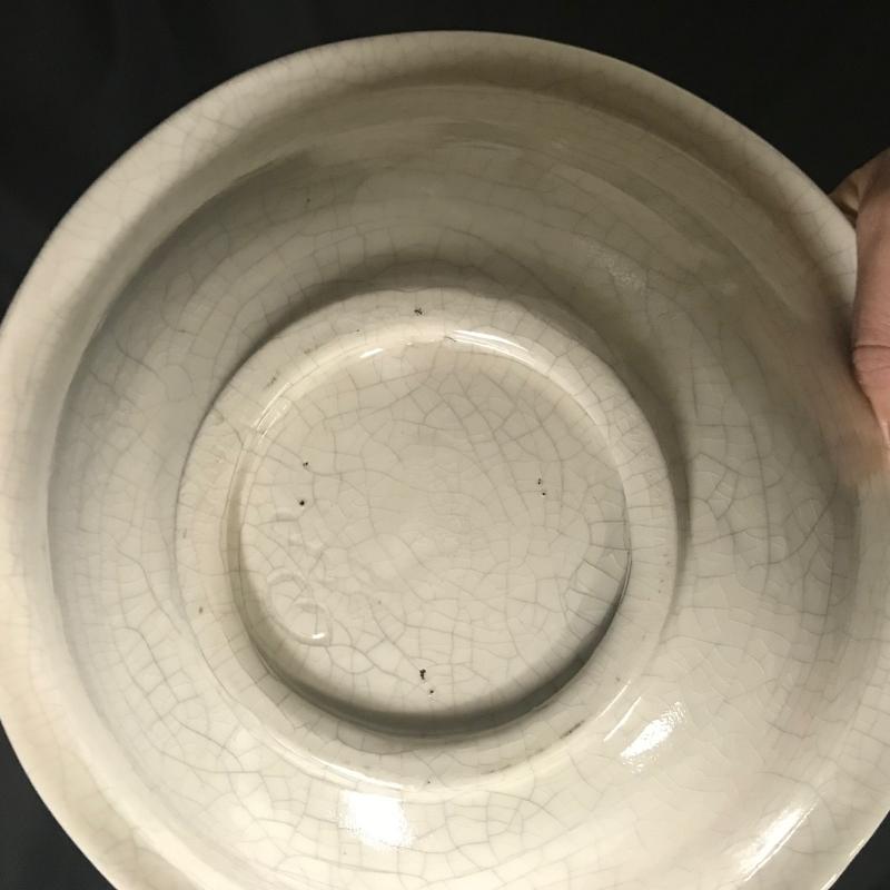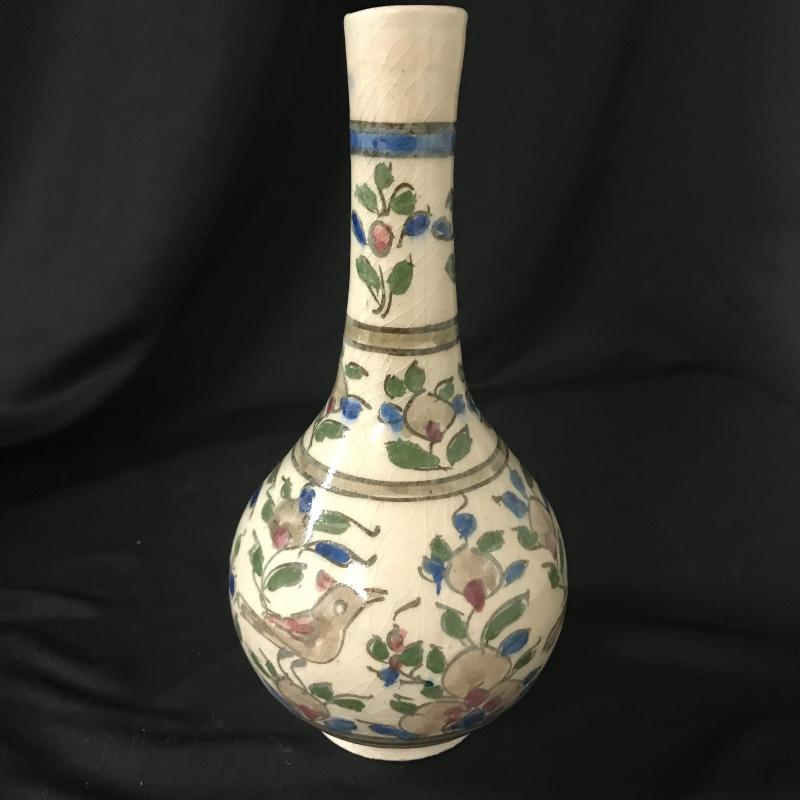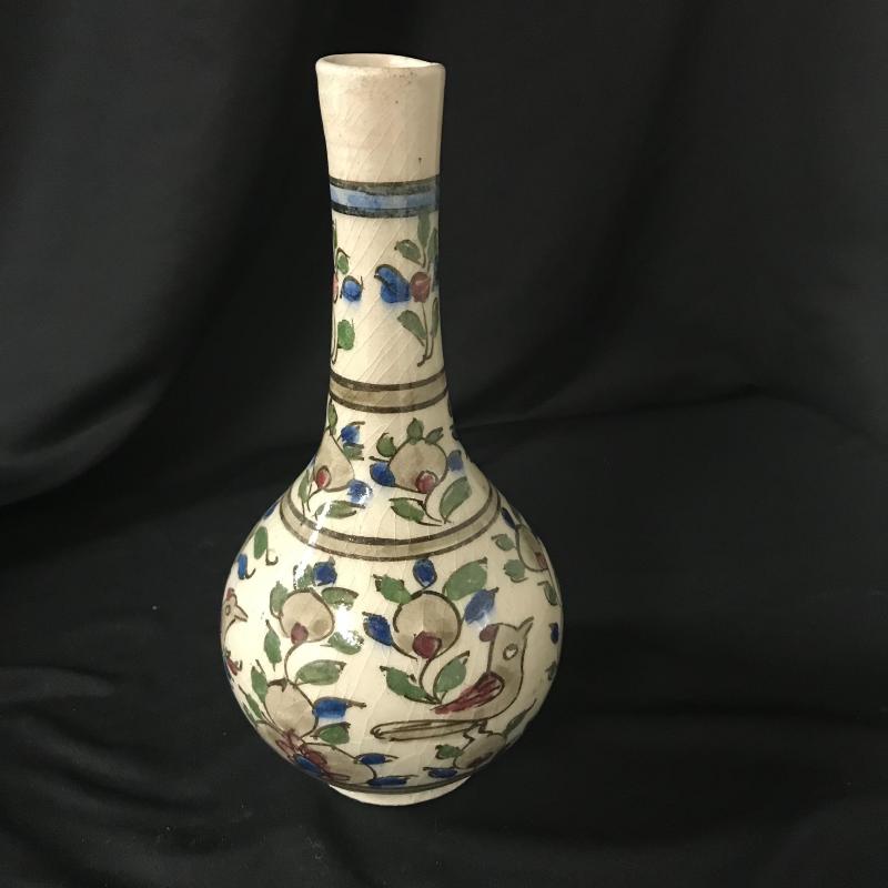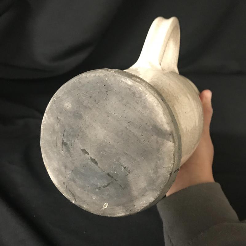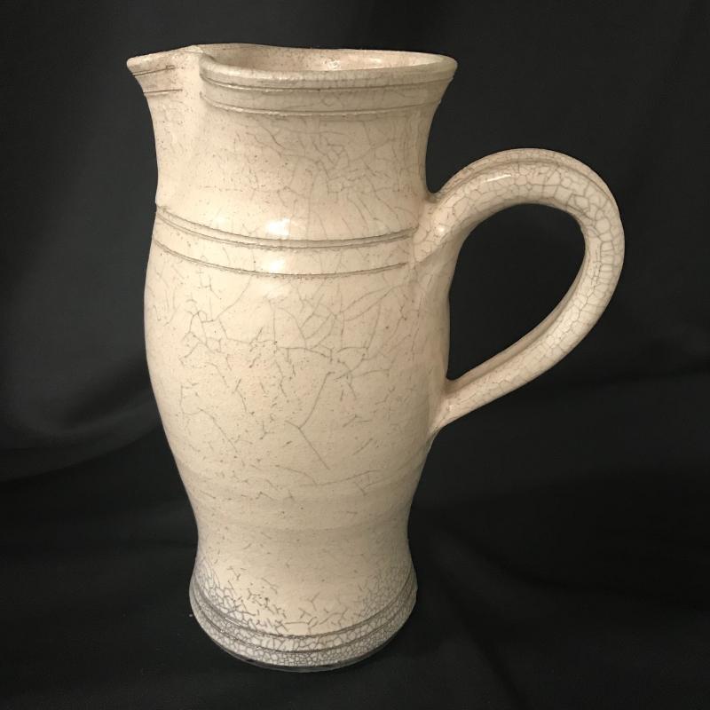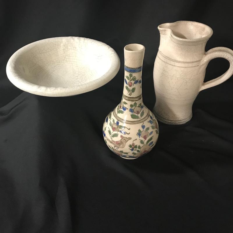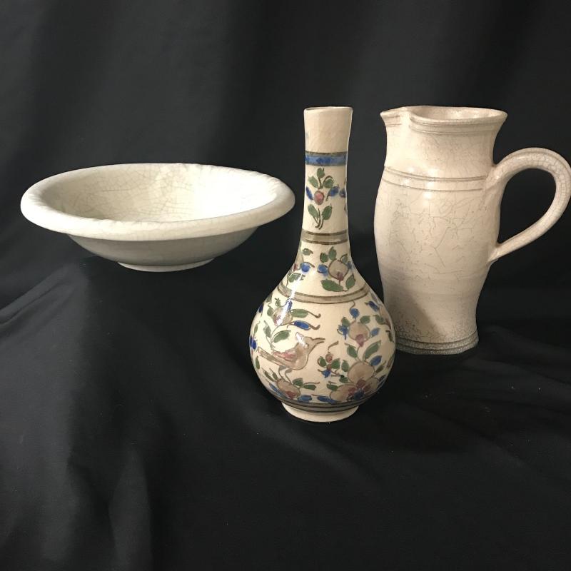 Crackle glazed bowl measures 10.5” dia and 3” tall. Initials 'PL' on the bottom. Stoneware pitcher also with crackle glazing stands 9.5” tall, no markings or signature found. Vase with Mexican folk art stands 10.5” tall. This lot is available for shipping or local pick up in Asheville, NC.