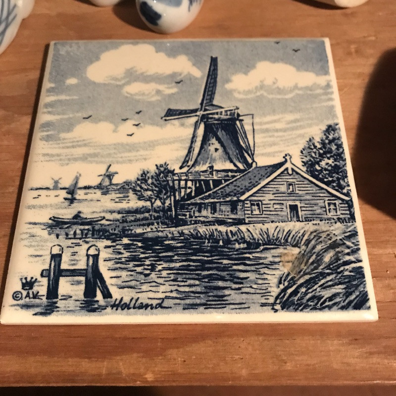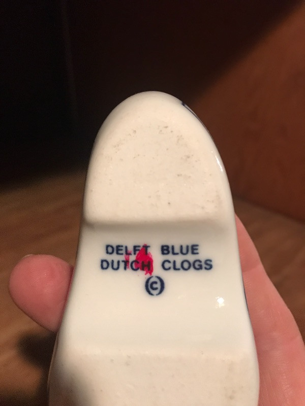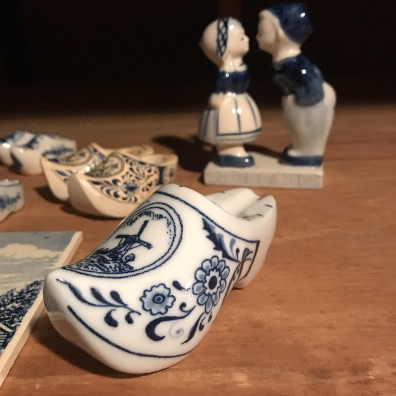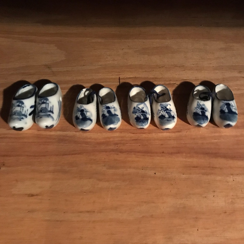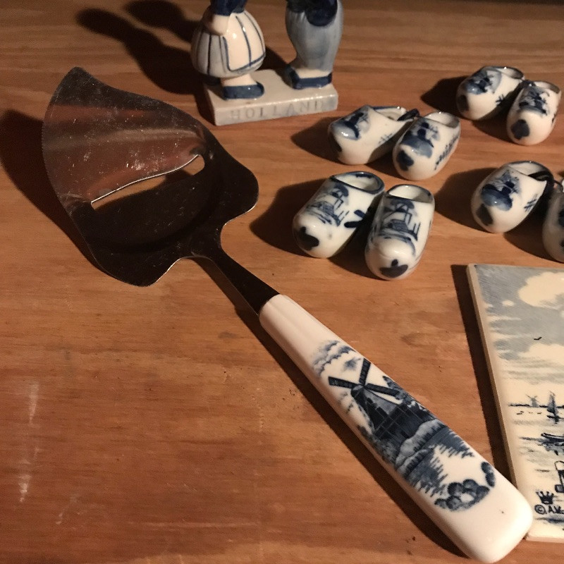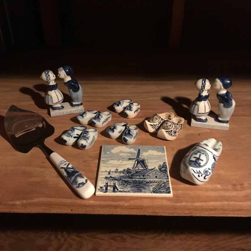 Four pairs of collectible Dutch clogs and one Delft blue and white clog ashtray. Trivit/wall hanging and cheese cutter along with two kissing Holland children. This collection takes you back to the old country. Shipping available.
