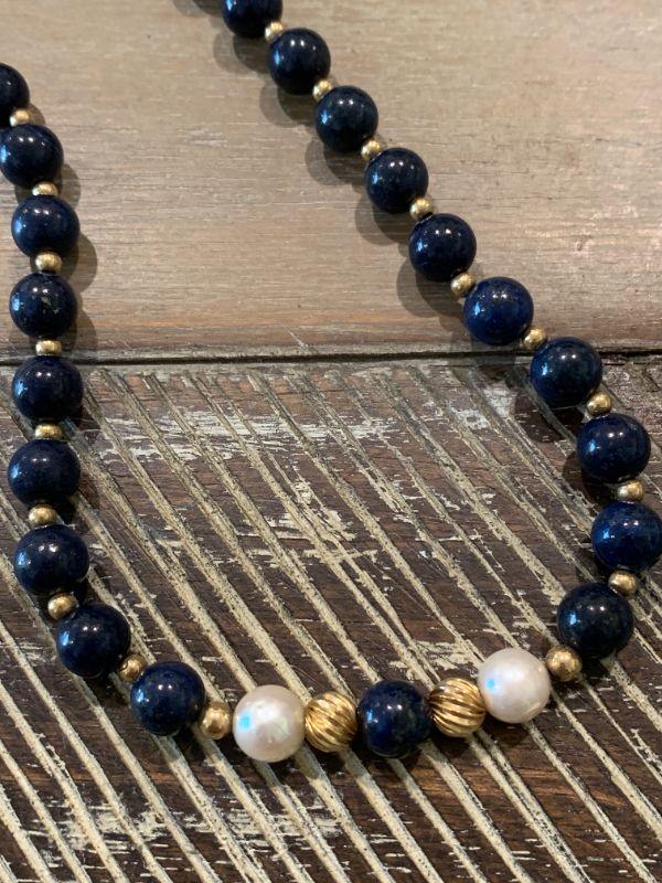 Lapis beads, 2 pearls & 14K gold spacer beads. Gold barrel clasp 24" laid out.