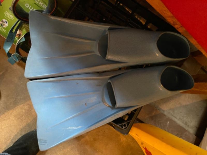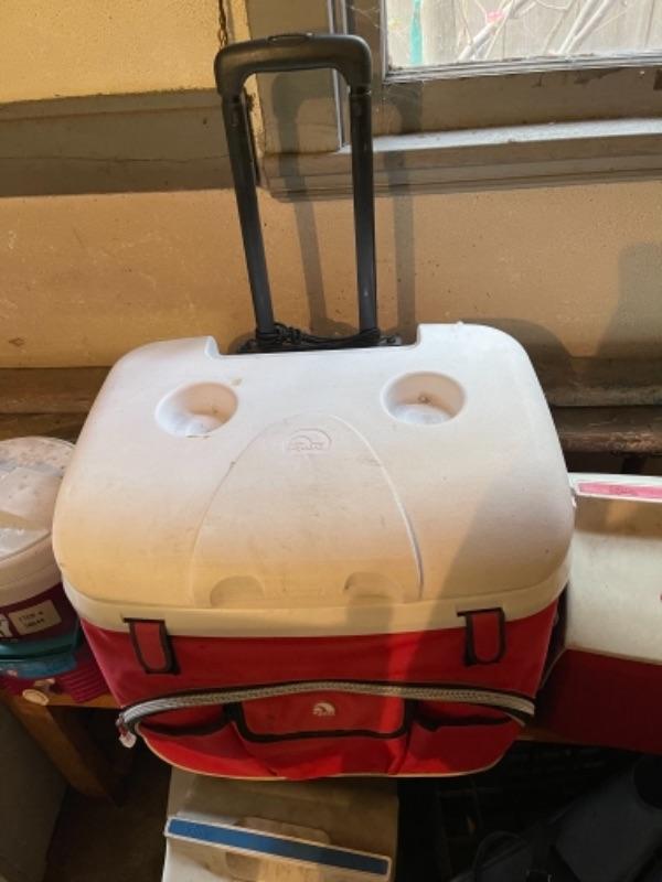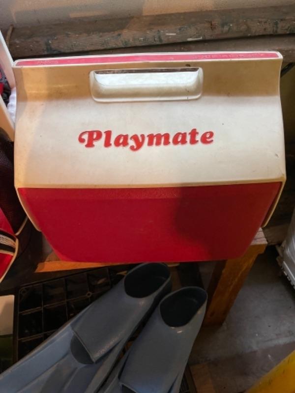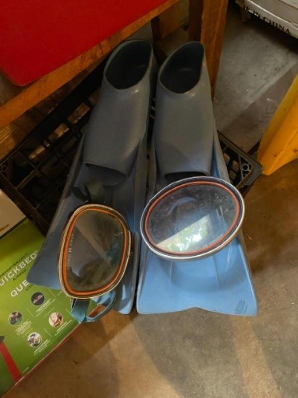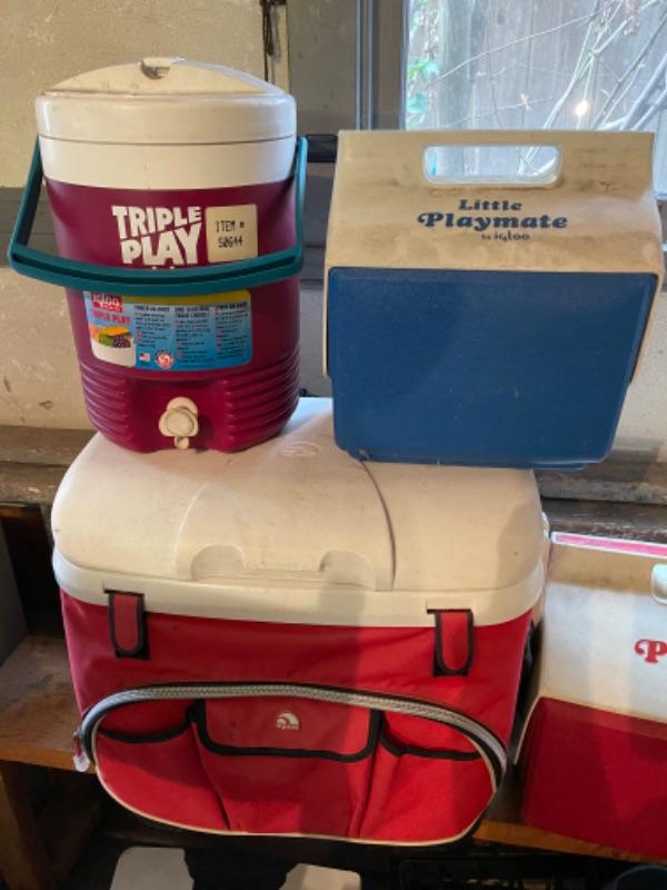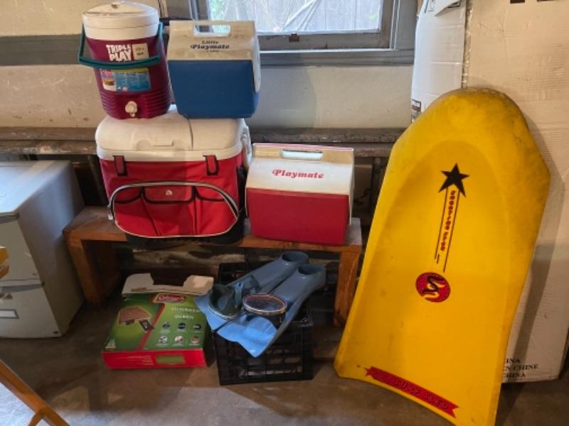 Lot 170. Four coolers, surfing sled, fins, air mattress, 2 pairs of goggles, etc.--$15