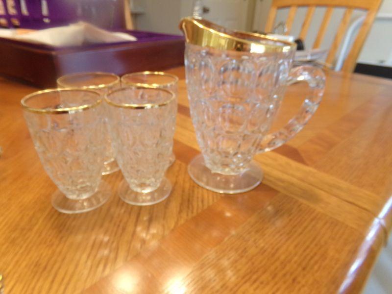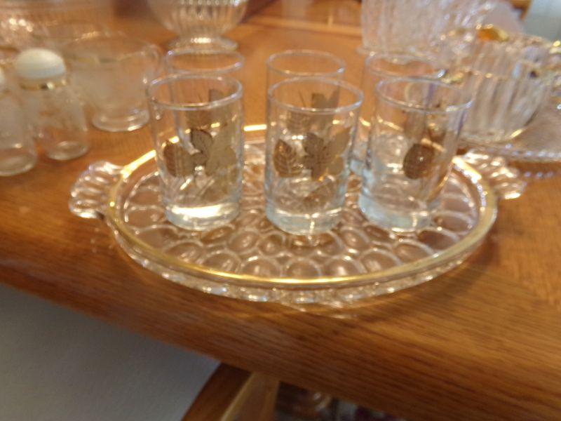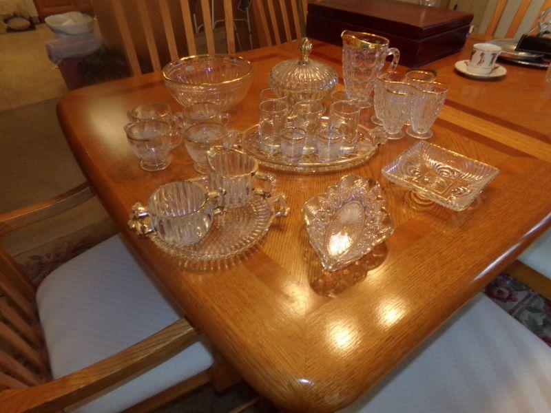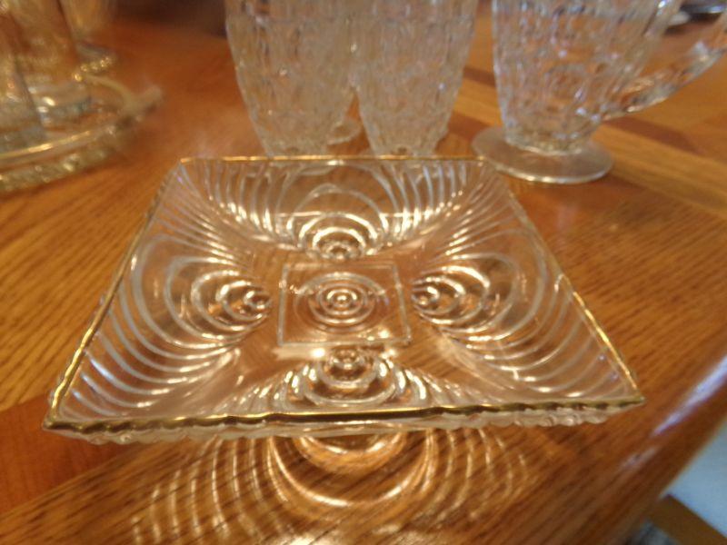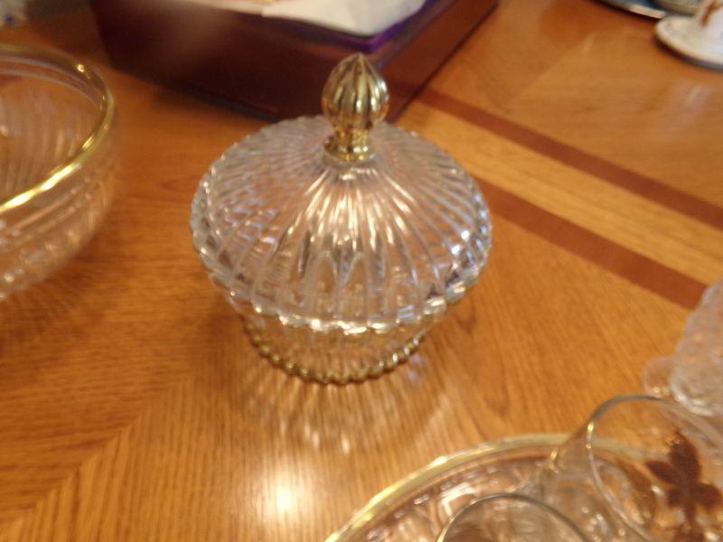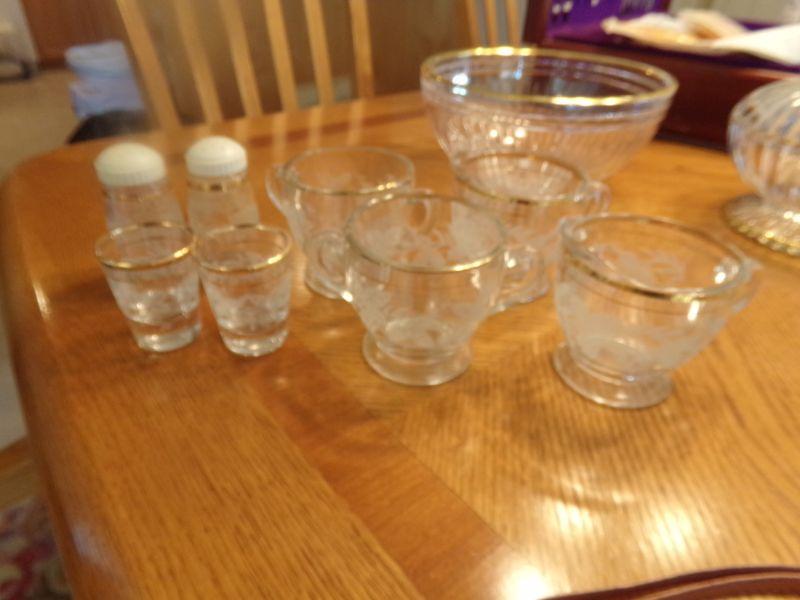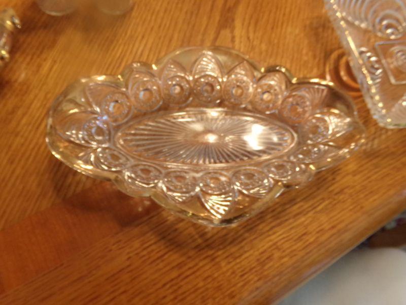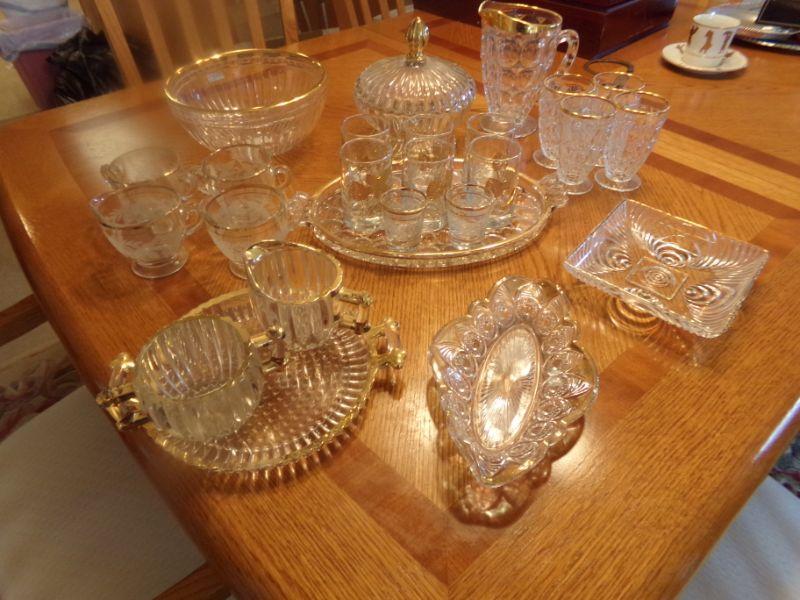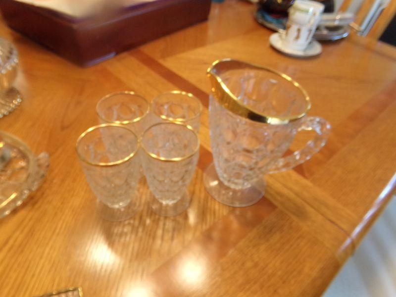 CANDY DISHES, PITCHER AND DRINKING GLASSES,, MARQUES BOWL, SUGAR & CREAMER, SHOT GLASSES, RELISH DISHES & MORE.