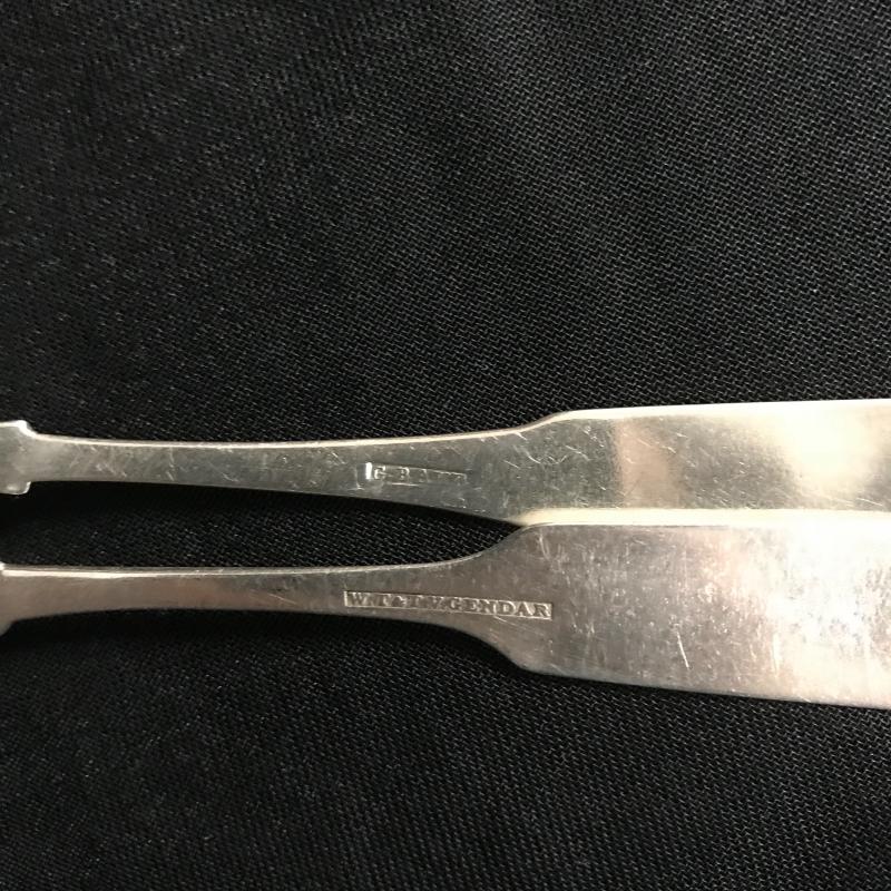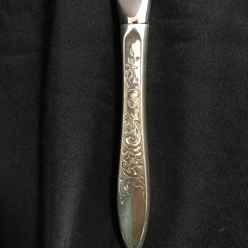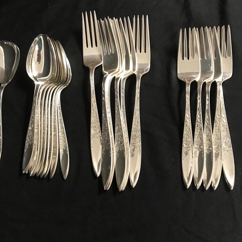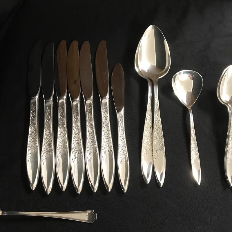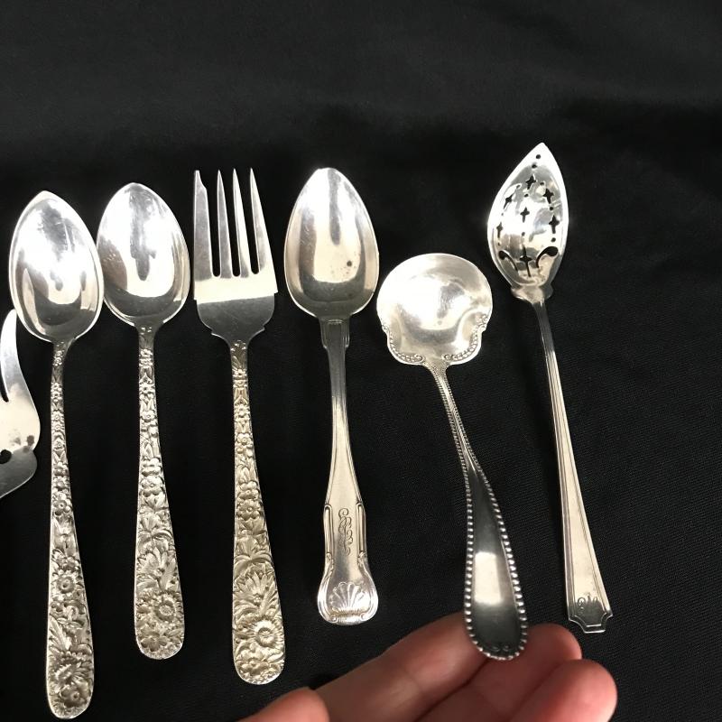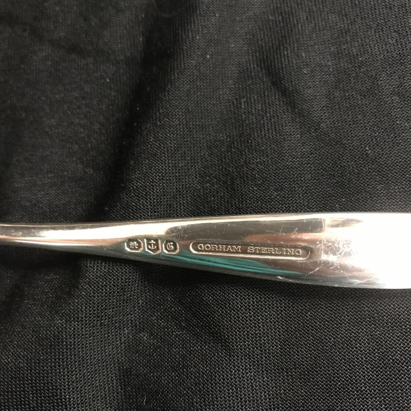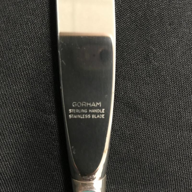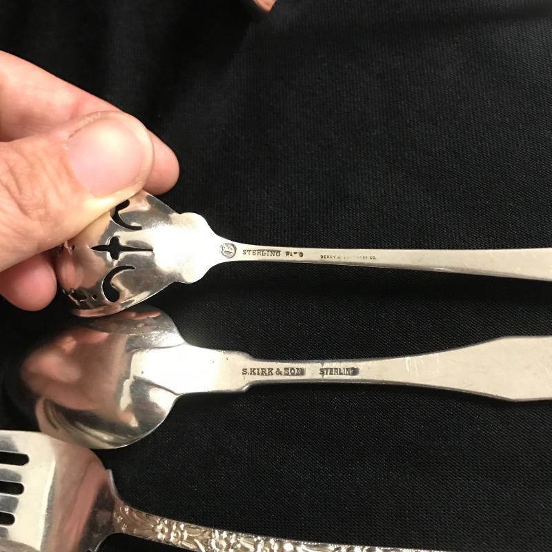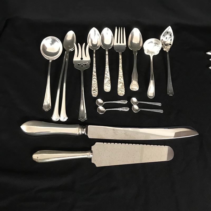 Sterling silverware set labeled White Paisley by Gorham includes six dinner knives, one spreader, nine coffee spoons, six dinner forks, five salad forks, two large and one small serving spoons. Gorham Collection is accompanied by many different styles of Sterling including Sheffield cake knife, S. Kirk and Sons, Chippendale and more. Two spoons pictured as a pair are not labeled Sterling, one WT&T. V Gender and the other G Baker. All knives are stainless blades with Sterling handles. See photos. Starting bid price is at or near melt value of sterling. Shipping available or local pick up in Arden, NC.