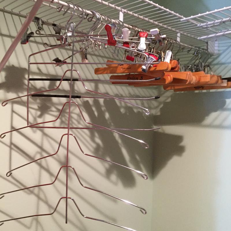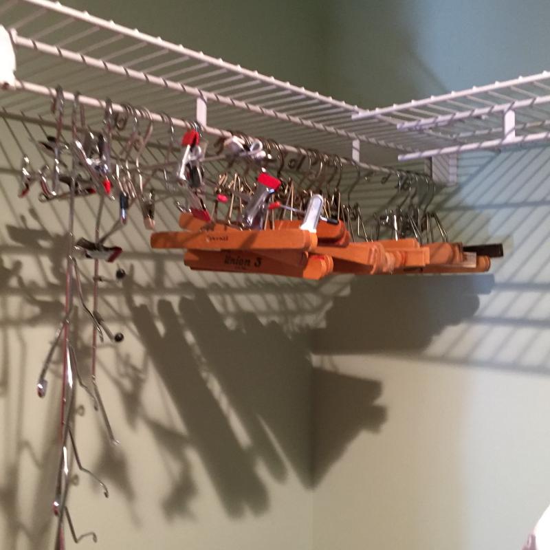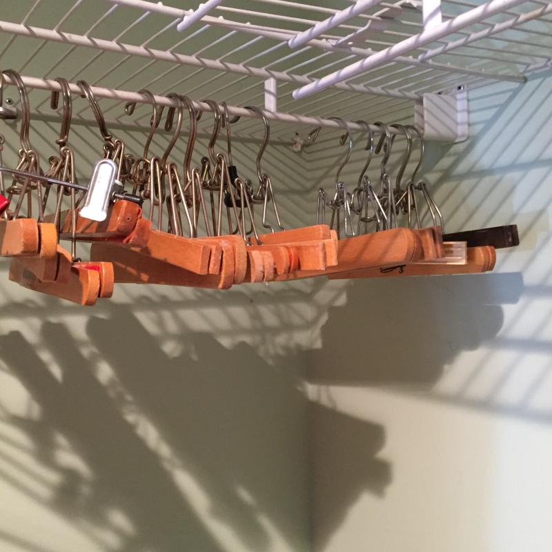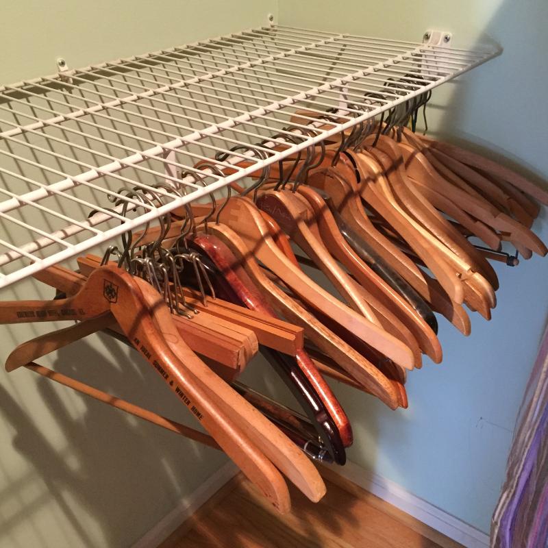 Large selection of mostly wooden hangers. Get your closet in order with these hangers.