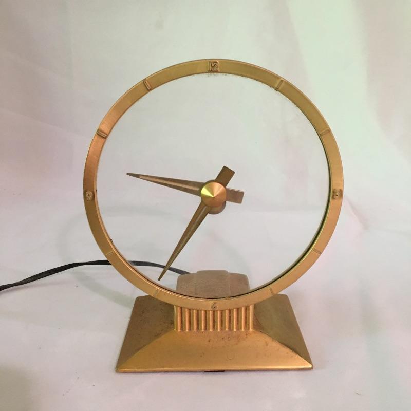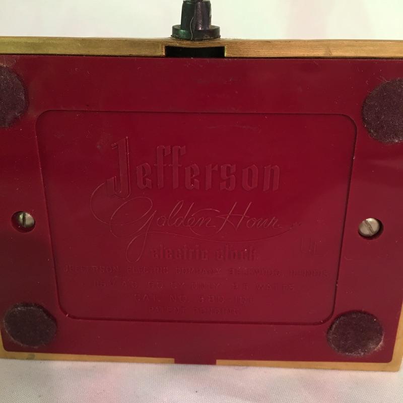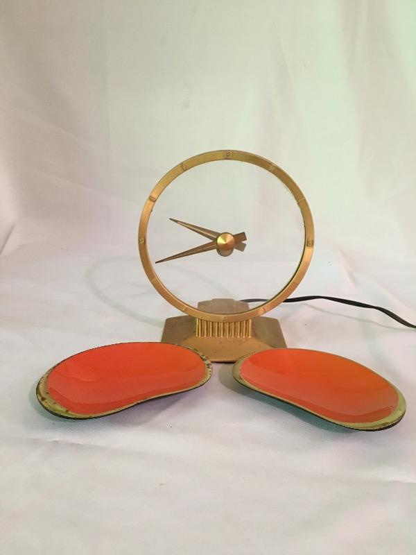 Jefferson golden hour clock and more. Lot includes Jefferson Golden Hour electric Art Deco clock and two enamel and brass dishes. This clock is sure to keep you wondering how it works. Clock runs when plugged in. Clock measures 4.5” x 7.5” x 9”.