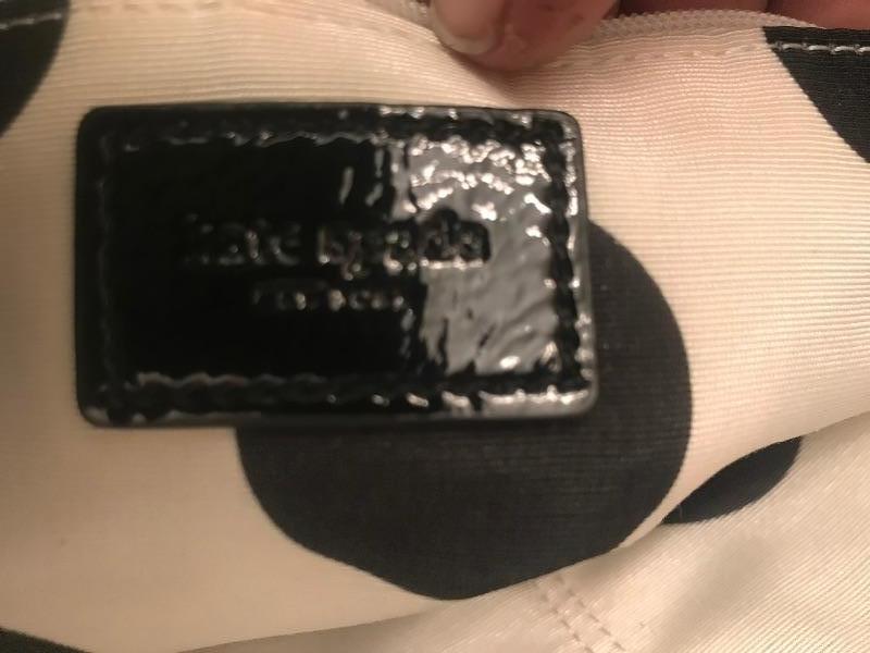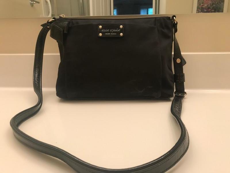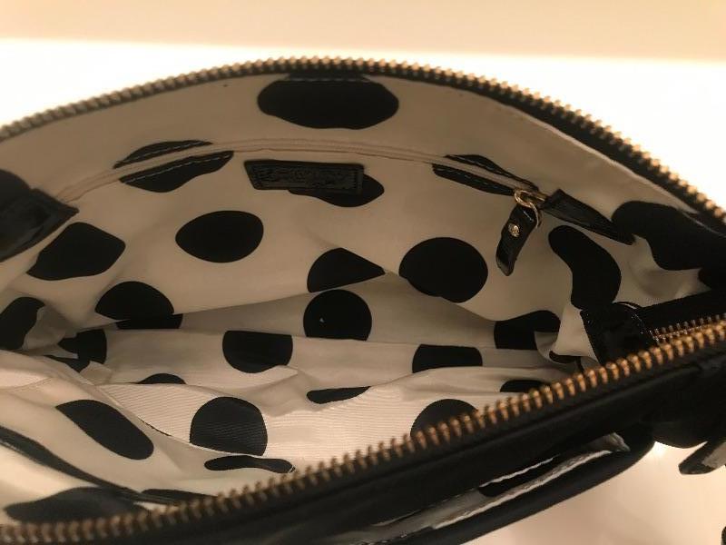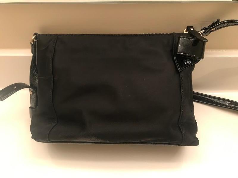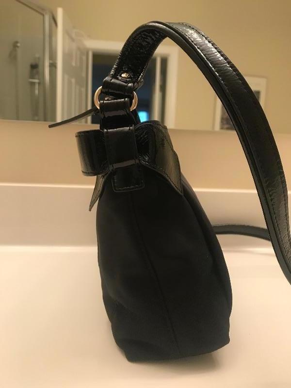 Kate Spade black satin crossbody should bag with patent leather strap. Measures 12” long 8-1/2” tall and 3-1/2” wide