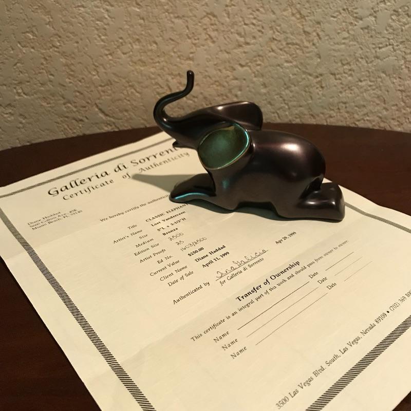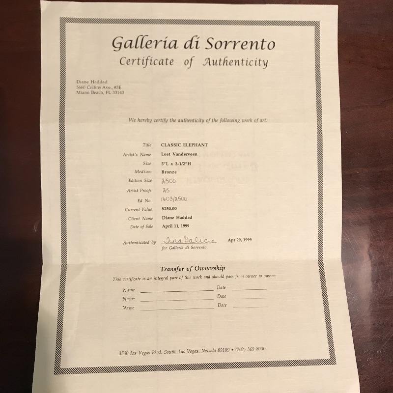 Complete with Certificate of Authenticity, this gorgeous elephant brings quite the statement in a small 5” x 3.5” package. “Classic Elephant” by praised bronze artist Loet Vanderveen is in wonderful condition and is a steal at any price. Shipping available.