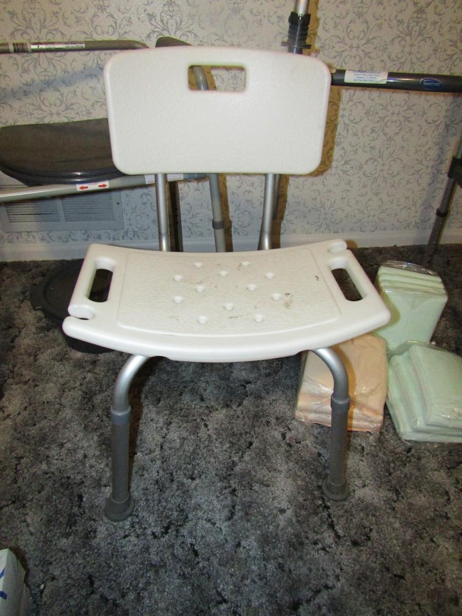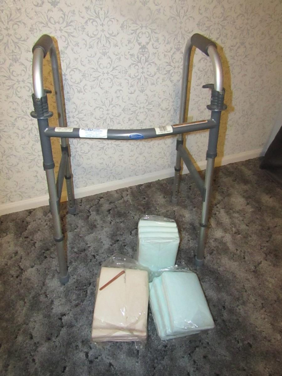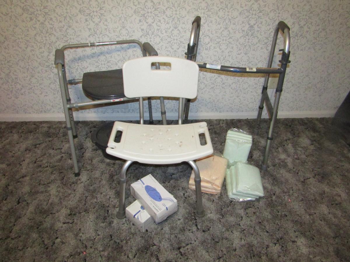 BEDSIDE POTTY, ADJUSTABLE WALKER, SHOWER SEAT, ABSORBING PADS AND 2 OPEN BOXES OF DISPOSABLE GLOVES SIZE MEDIUM
