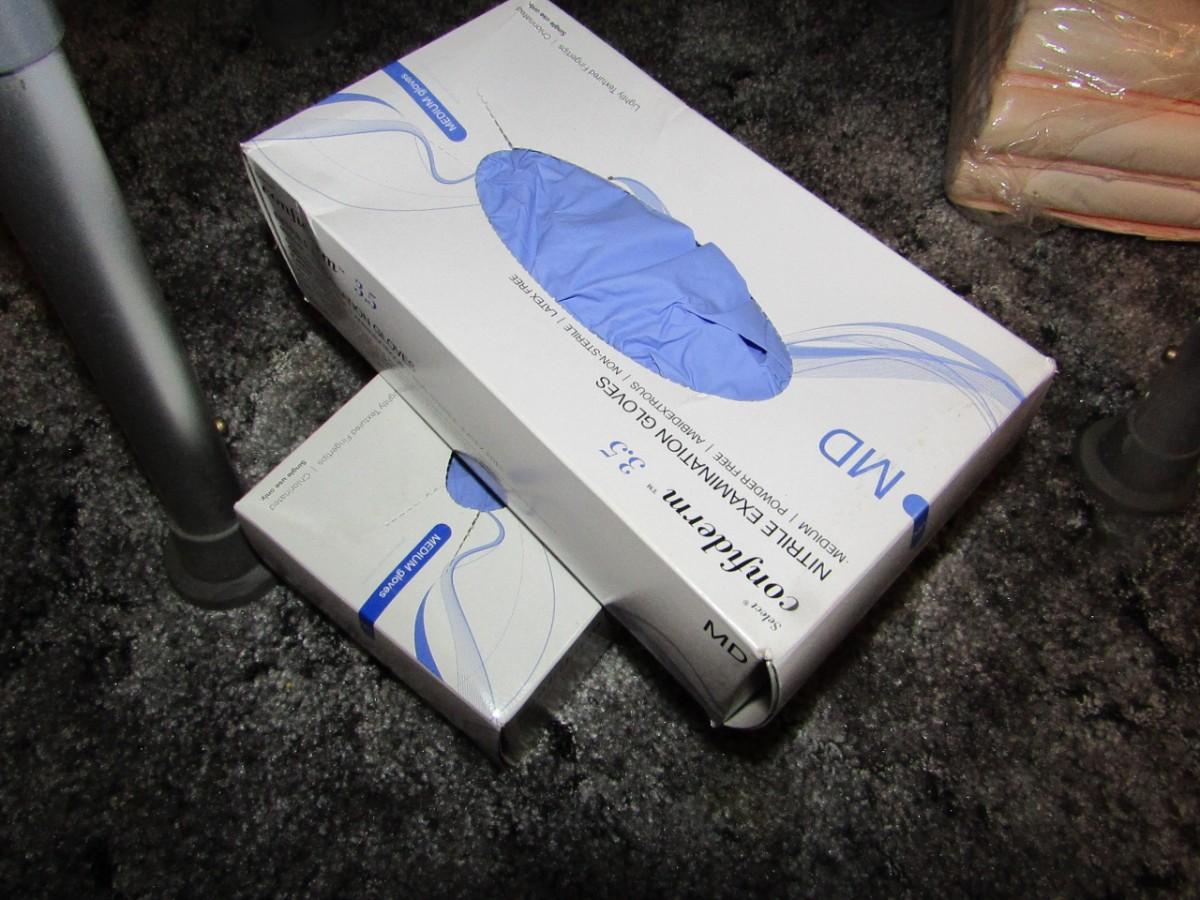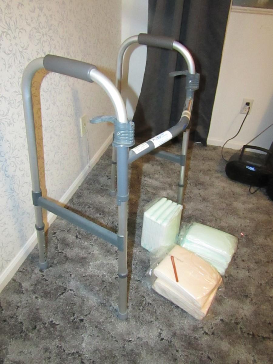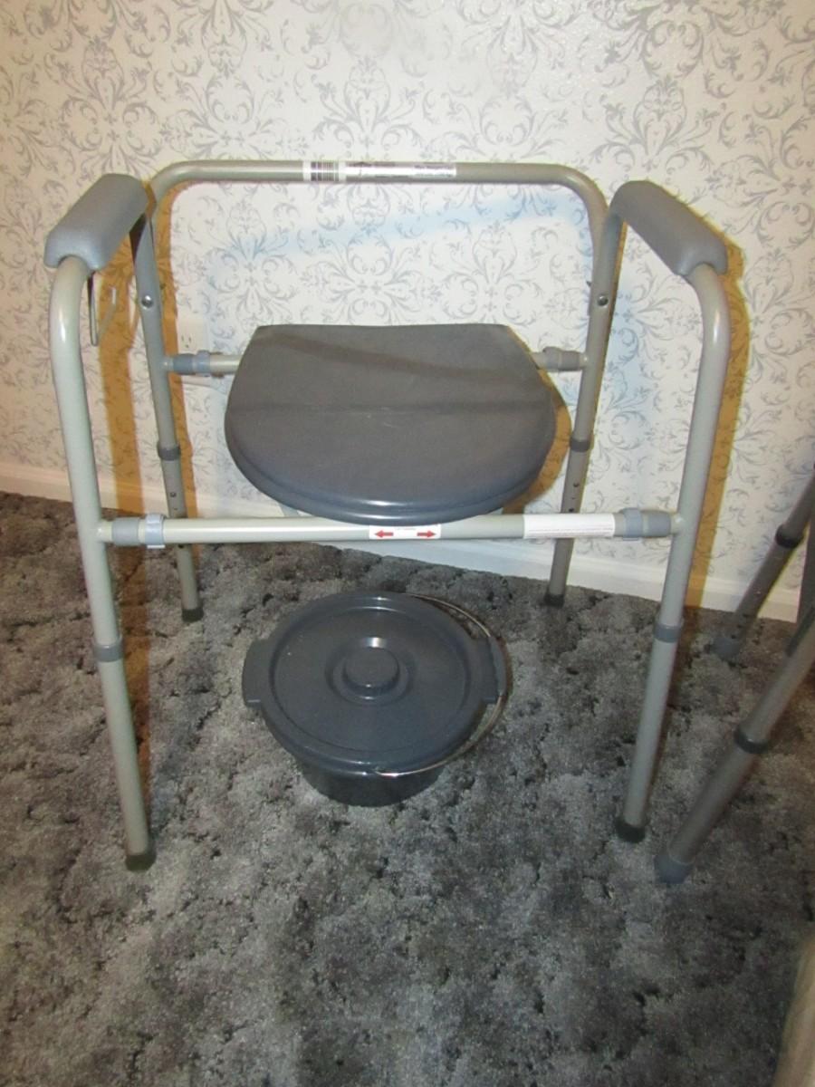 BEDSIDE POTTY, ADJUSTABLE WALKER, SHOWER SEAT, ABSORBING PADS AND 2 OPEN BOXES OF DISPOSABLE GLOVES SIZE MEDIUM
