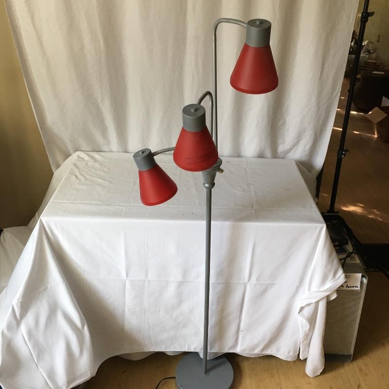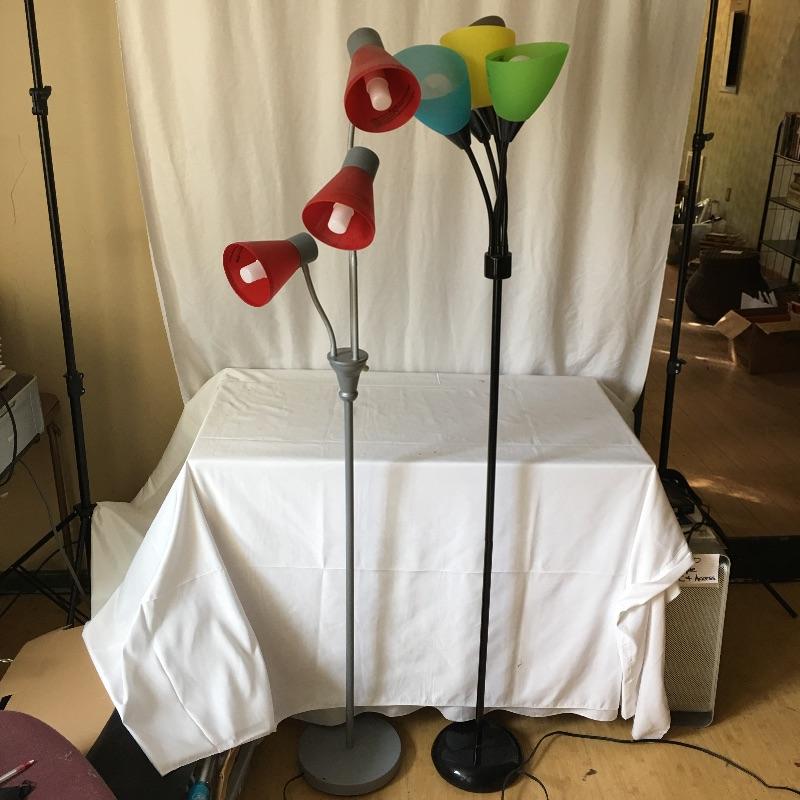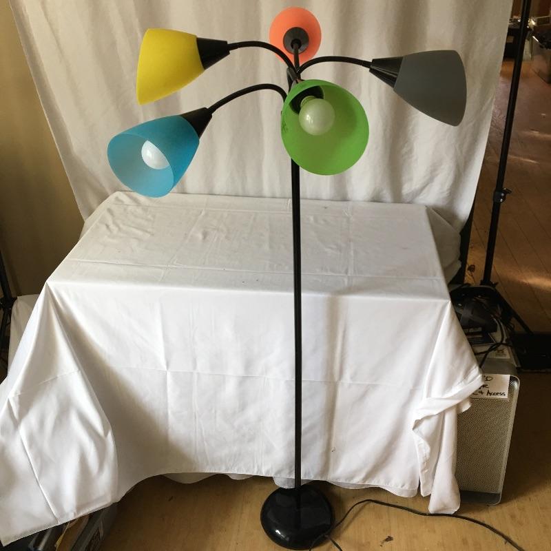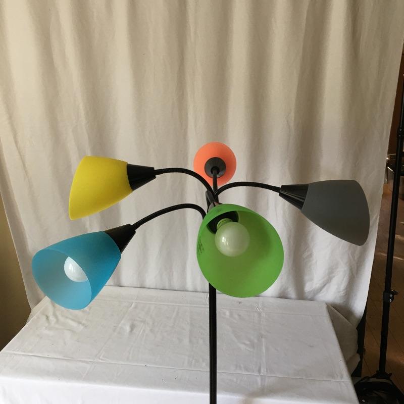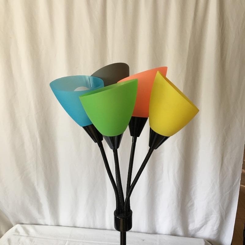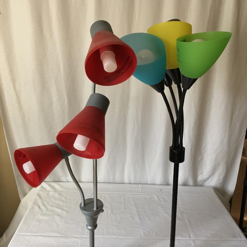 Pair of colorful floor lamps. Lot includes one three bulb floor lamp and one five bulb floor lamp both with flexible arms. Add some color to your home with this pair of beauties. Tallest lamp measures 68” tall.