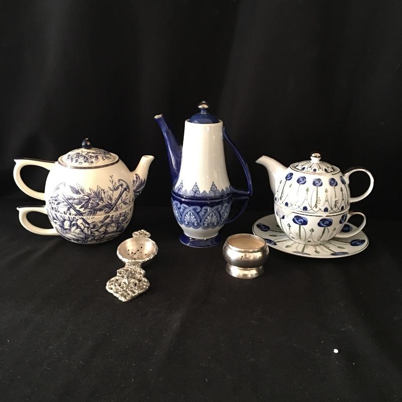 This trio of personal teapots are made by Mud Pie, The Leonardo Collection and Bombay. Also includes strainer. Tallest tea set measures 3.5”D x 8” tall. Get your pinkies up with this great trio of personal teapots.