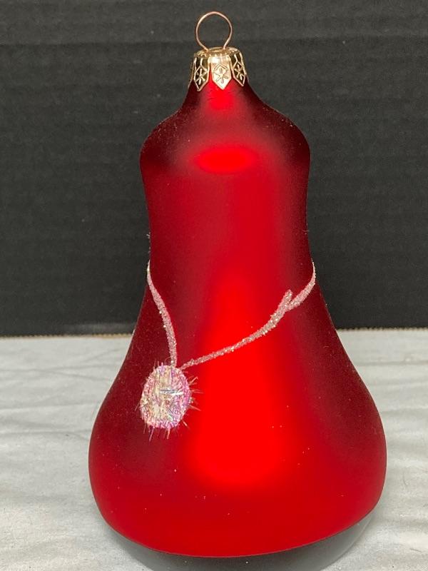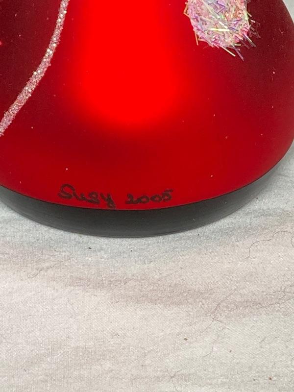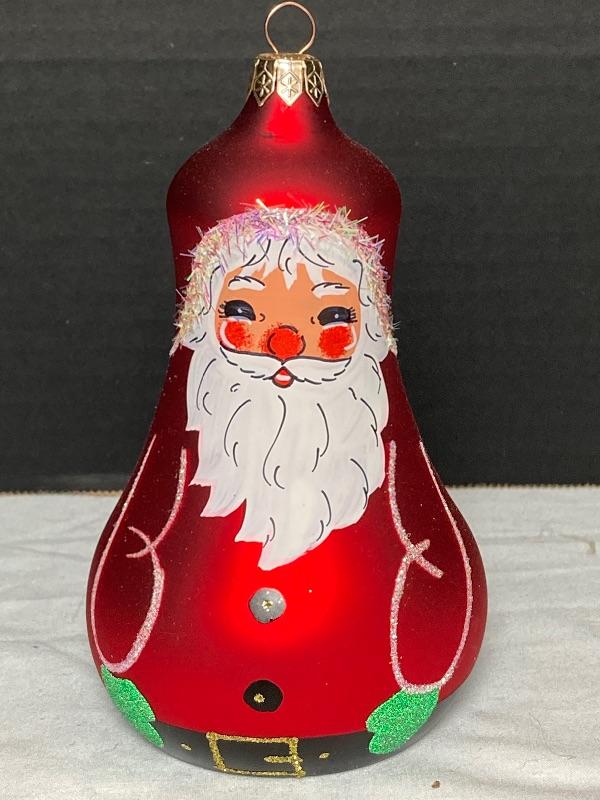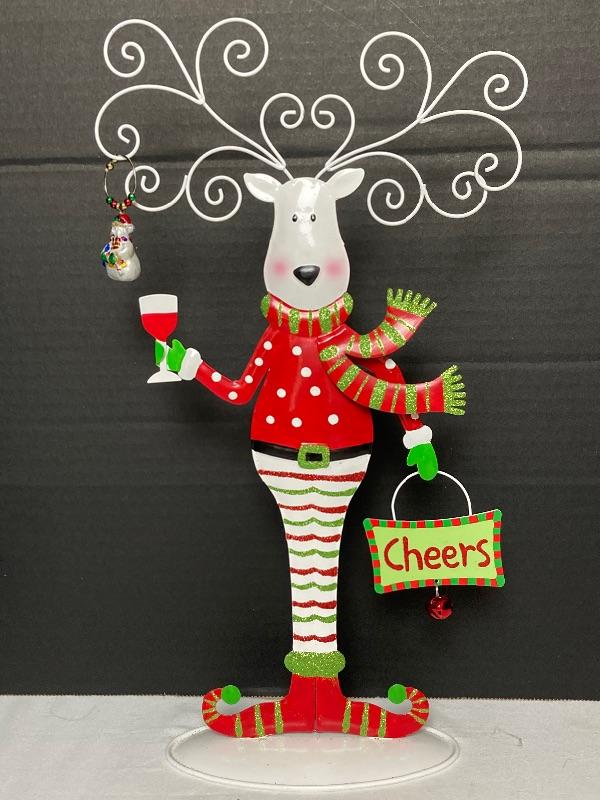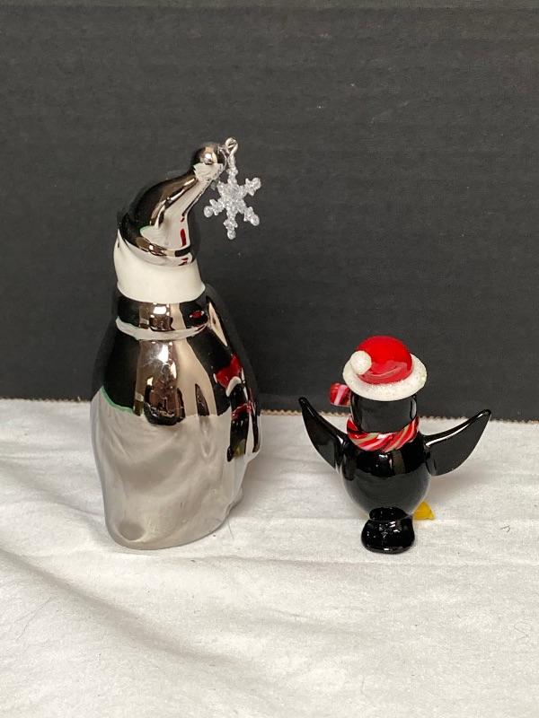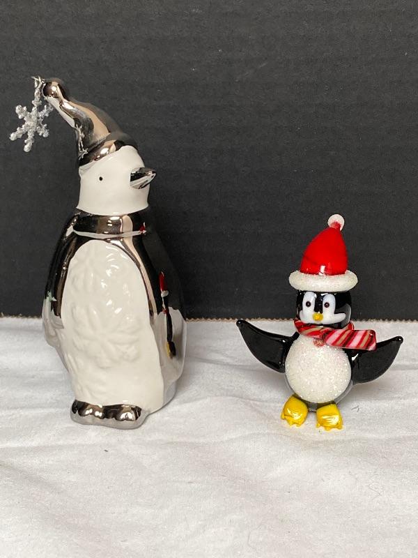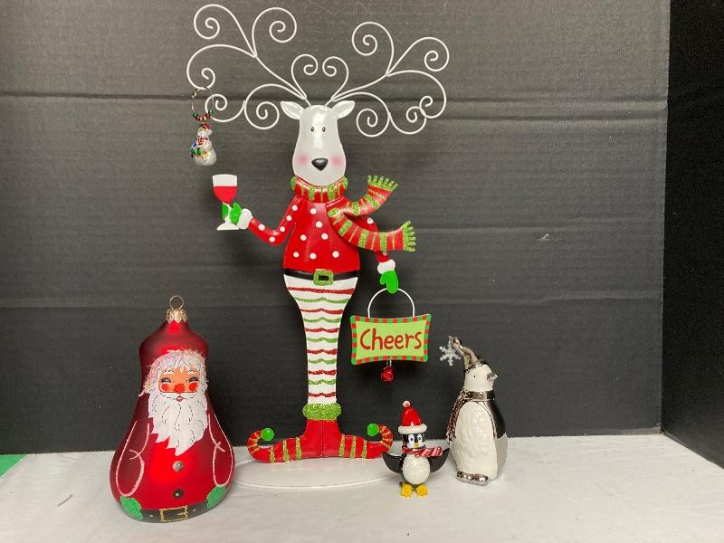 Pier 1 mouth blown hand painted glass Santa ornament 6” tall and signed Susy 2005, Silver and White Penguin porcelain and measures 4-1/2” tall ,Jingles blown glass Penguin measures 2-1/2” and Reindeer wineglass charm stand