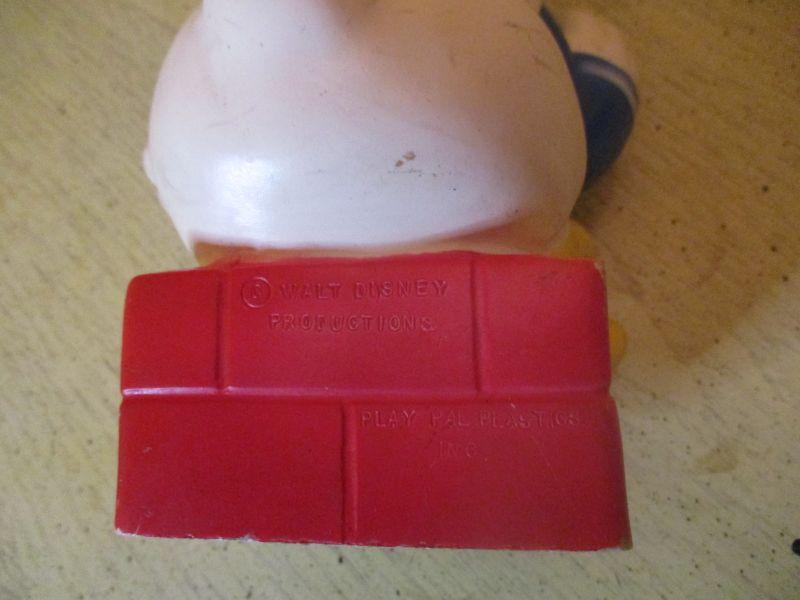 Hard plastic bank and still has a stopper. A couple of spots of paint loss, but overall this bank is in great condition. Embossed as Copyright Walt Disney Prouctions. Abot 11" tall.