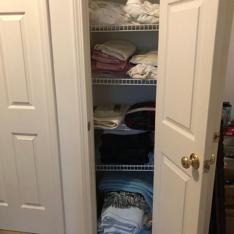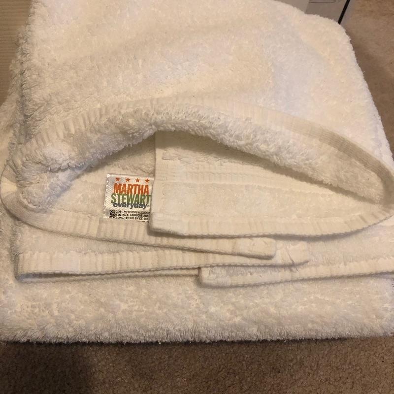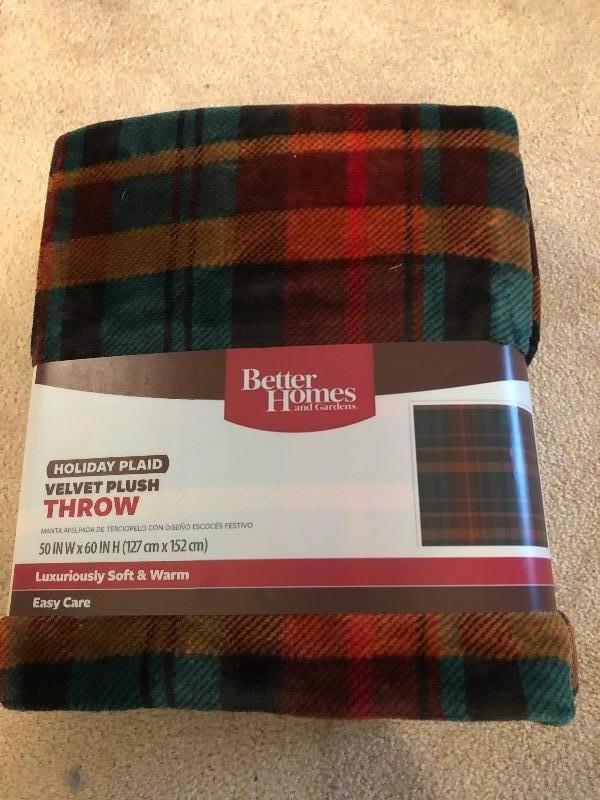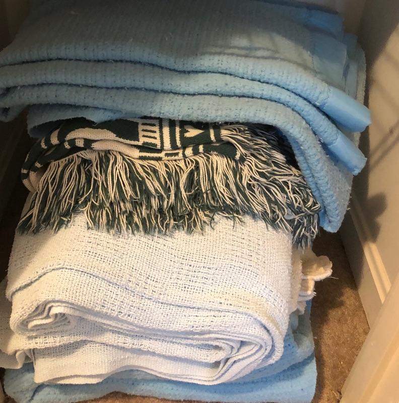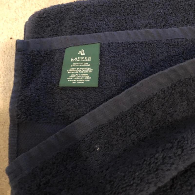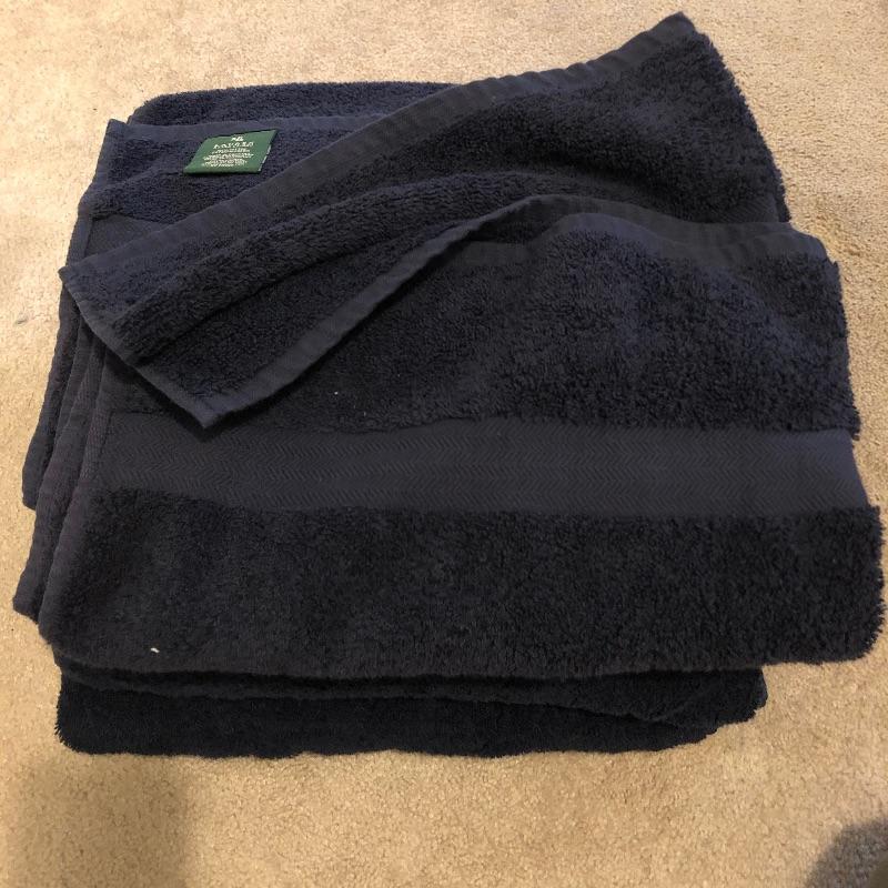 Nice assortment of towels and blankets that includes a brand new velvet plaid plush throw. The other blankets are predominately baby blue. Dark blue towels are Ralph Lauren and the white are Martha Stewart.