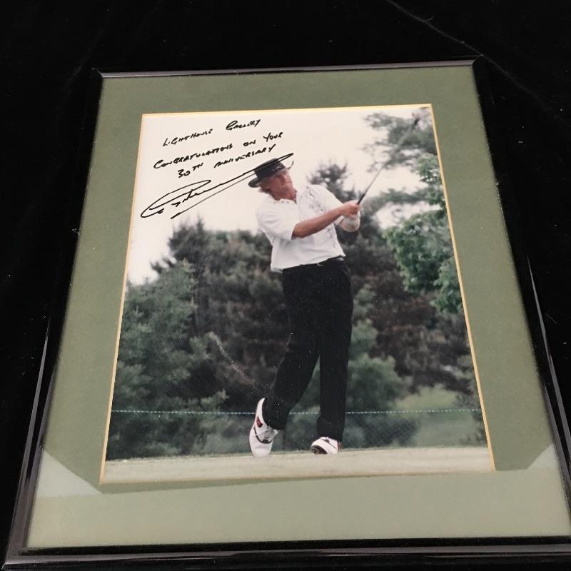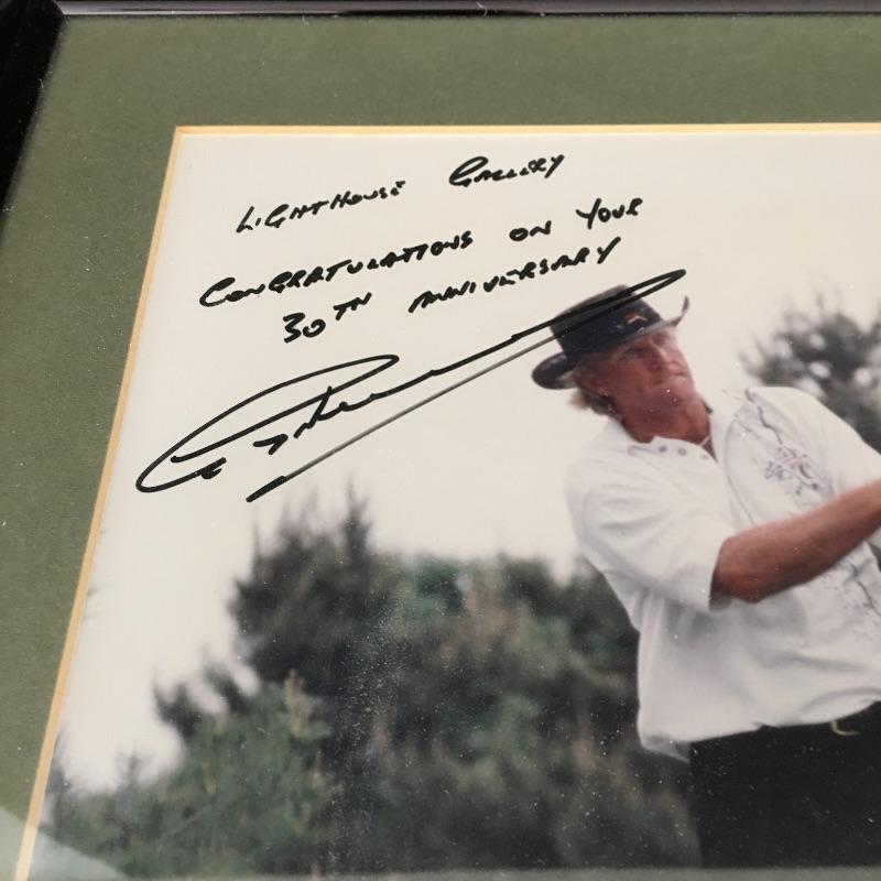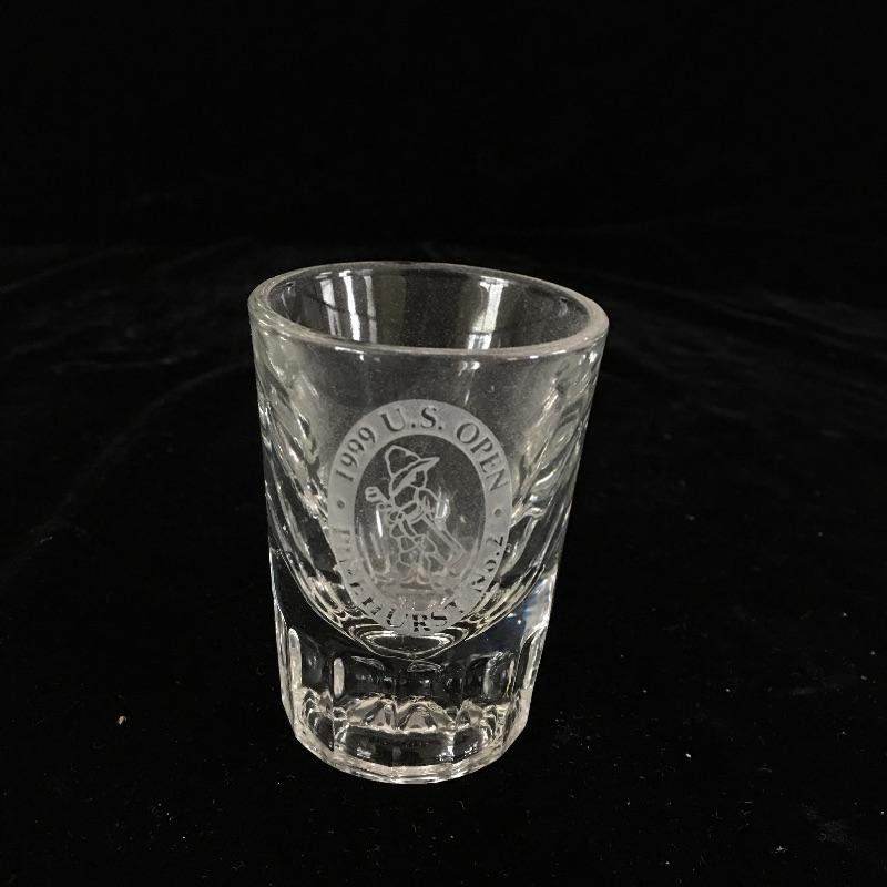 Signed, framed and matted of Greg Norman, 1999 US Open shot glass and 1999 Shaker men’s invitational brass and wood shoe horn. Frame measures 11” x 13”, no COA.