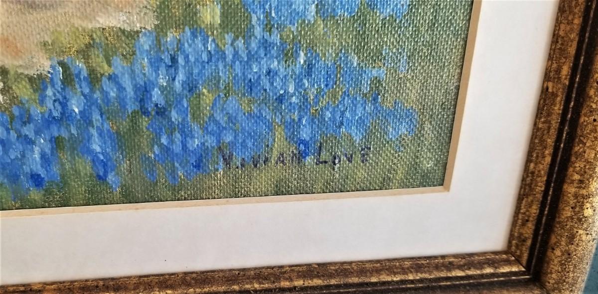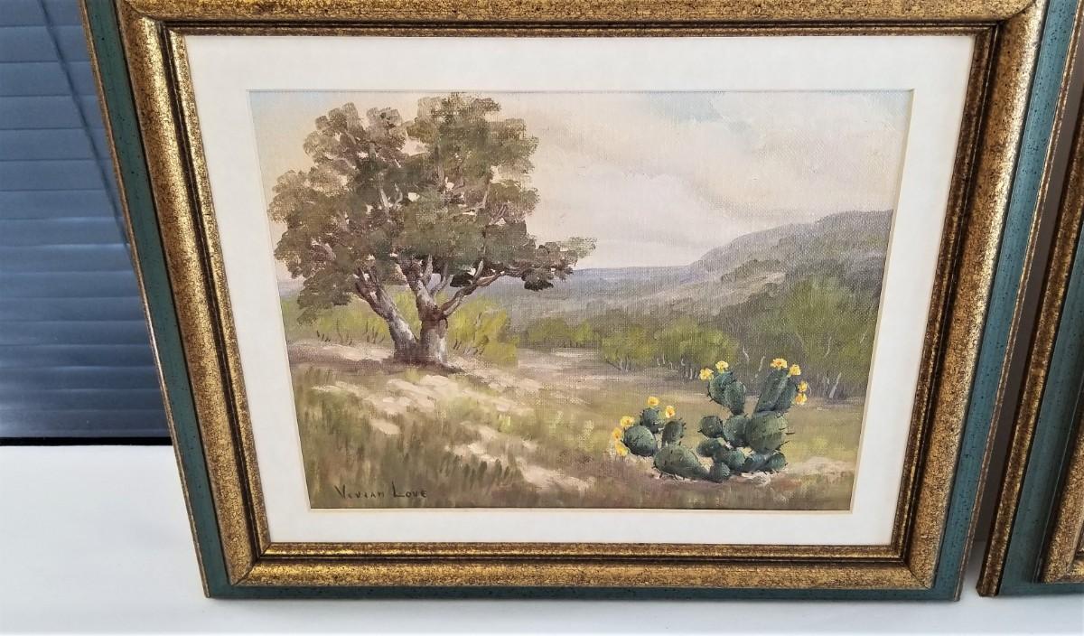 Nice pair of small paintings - oil on board - depicting scenes from the Texas Hill Country - one features Bluebonnets, the State Flower of Texas. Both signed "Vivian Love. - a noted San Antonio artist (1908-1982). Her art has been sold at auction many times, with paintings of this size routinely realizing around $250.00 each. Each measures 14" across, 12" tall.