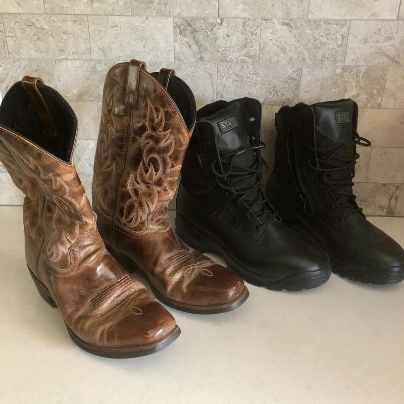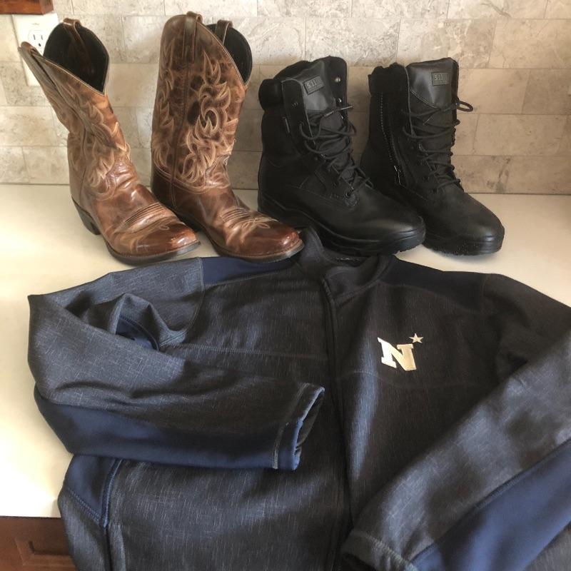 These Laredo cowboy boots are size 10 and are in very good condition. The black tactical boots are size 10.5 and have barely been worn. Also included is a mans full zip jacket that does not have a size but measurements are shown in images.Shipping available