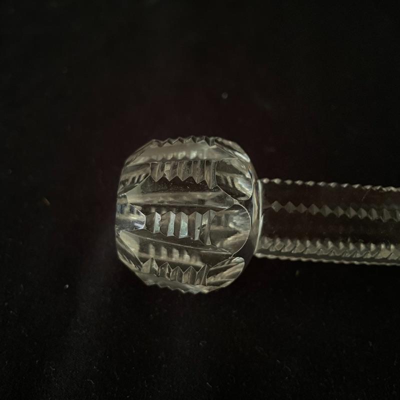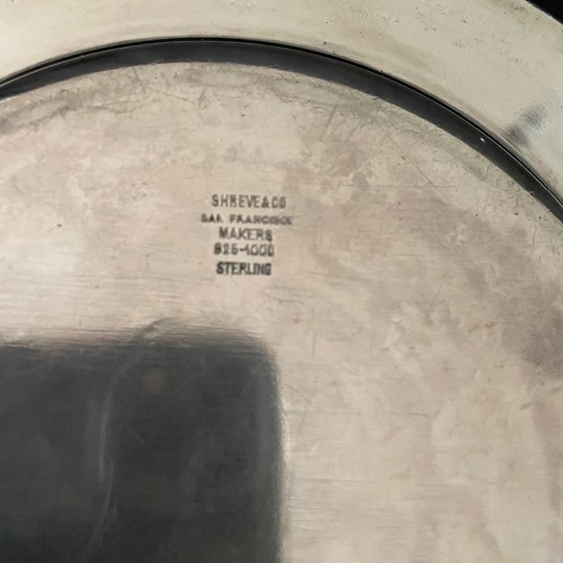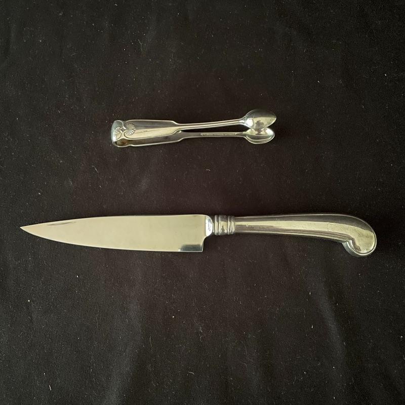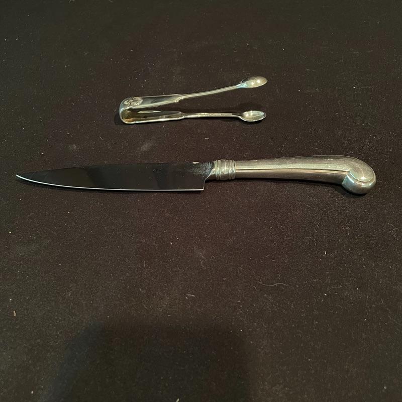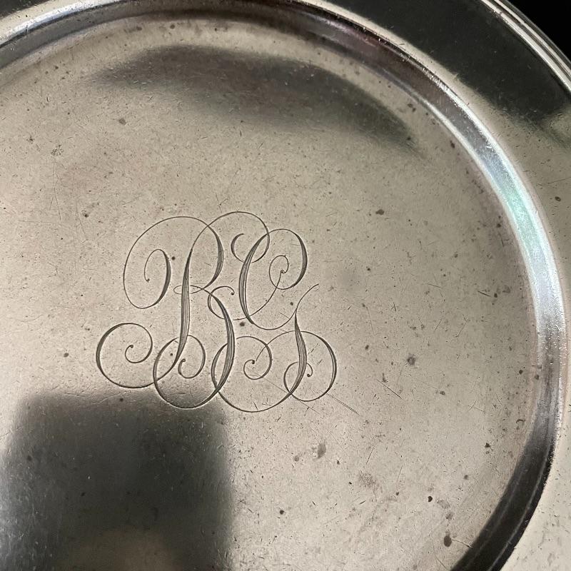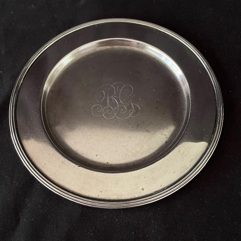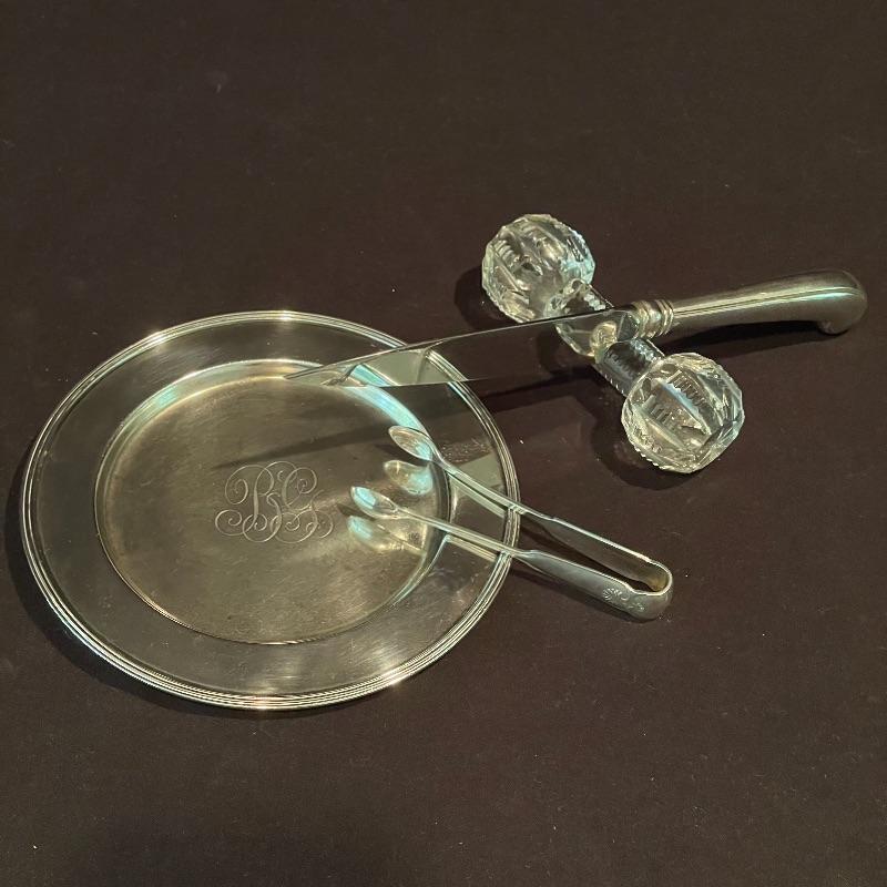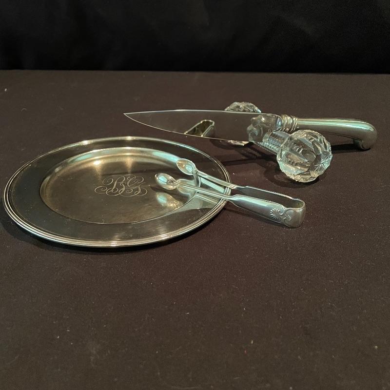 Two beautiful pieces by Tiffany. A small tong and 9” serving knife. The tong is marked Sterling. Lot also features a sharply cut glass knife rest, we were unable to locate any markings. Lastly a small, yet heavy monogrammed 6.25”plate marked Sterling. Starting bid is at or near melt value. Shipping available.