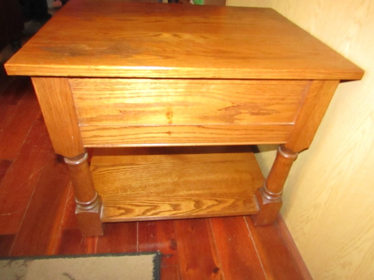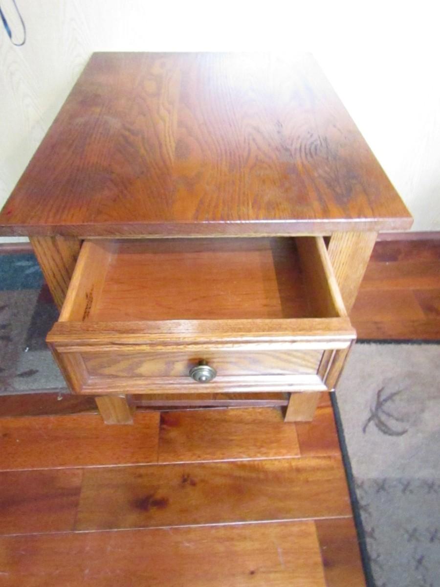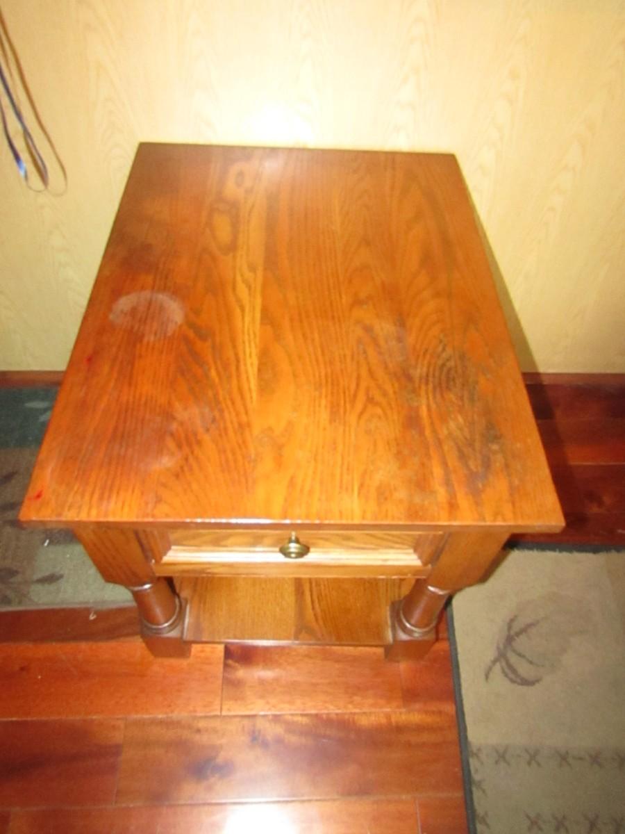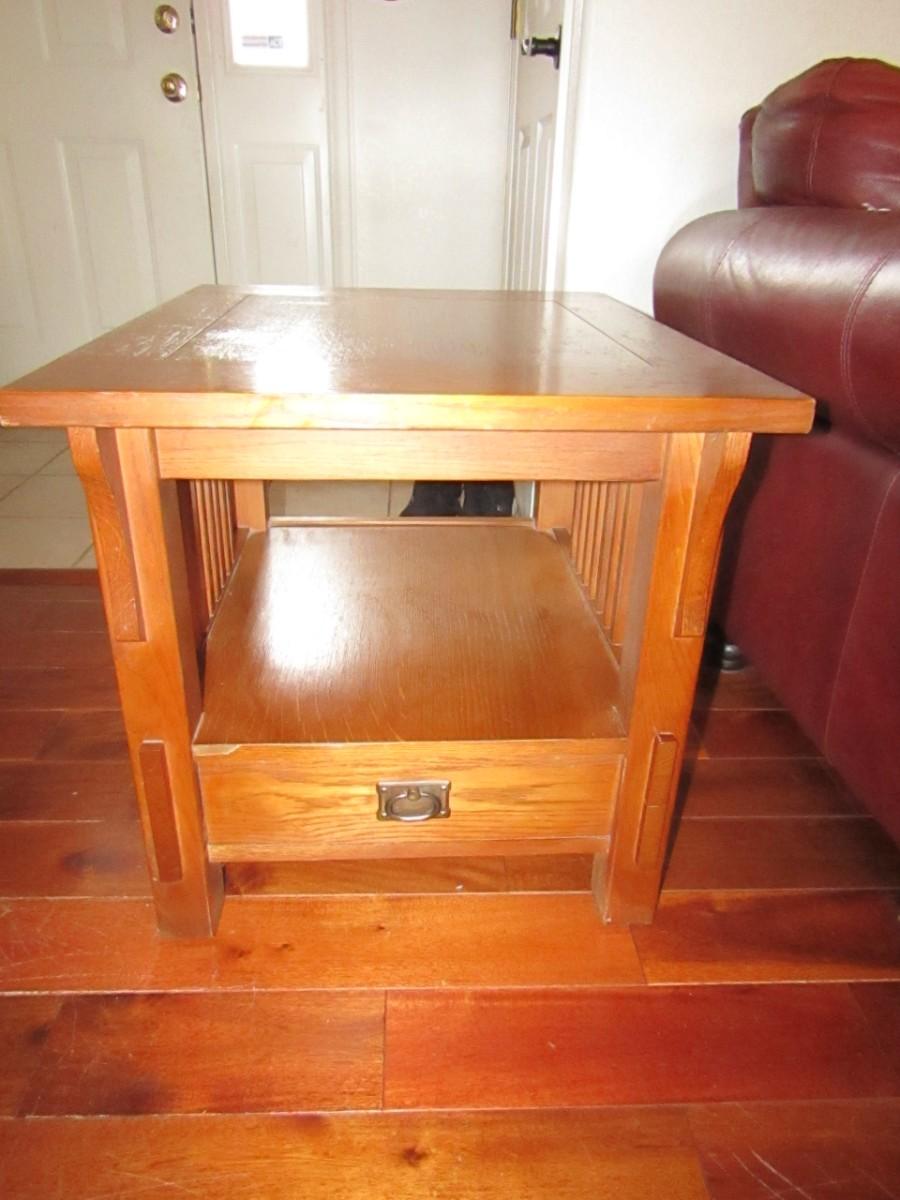 MISSION STYLE END TABLE WITH 1 DRAWER, THE FINISH IS STARTING TO PEEL OFF IN PLACES 22" X 27" X 22"