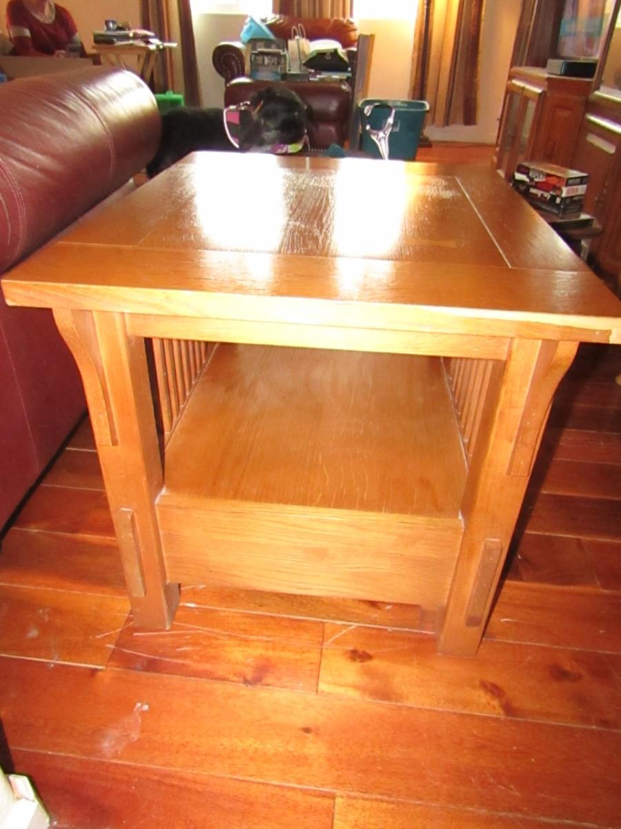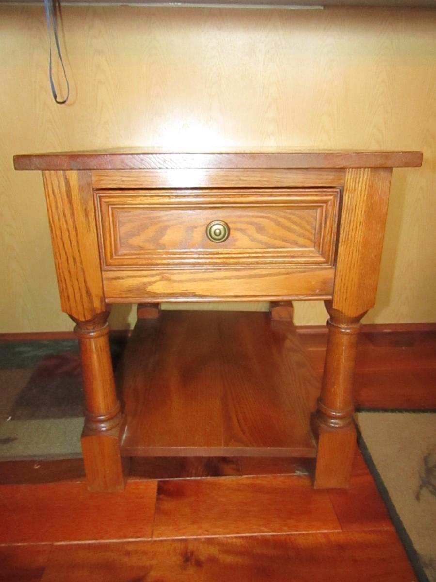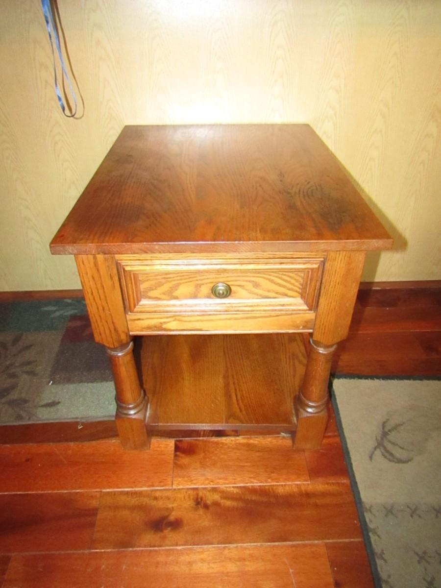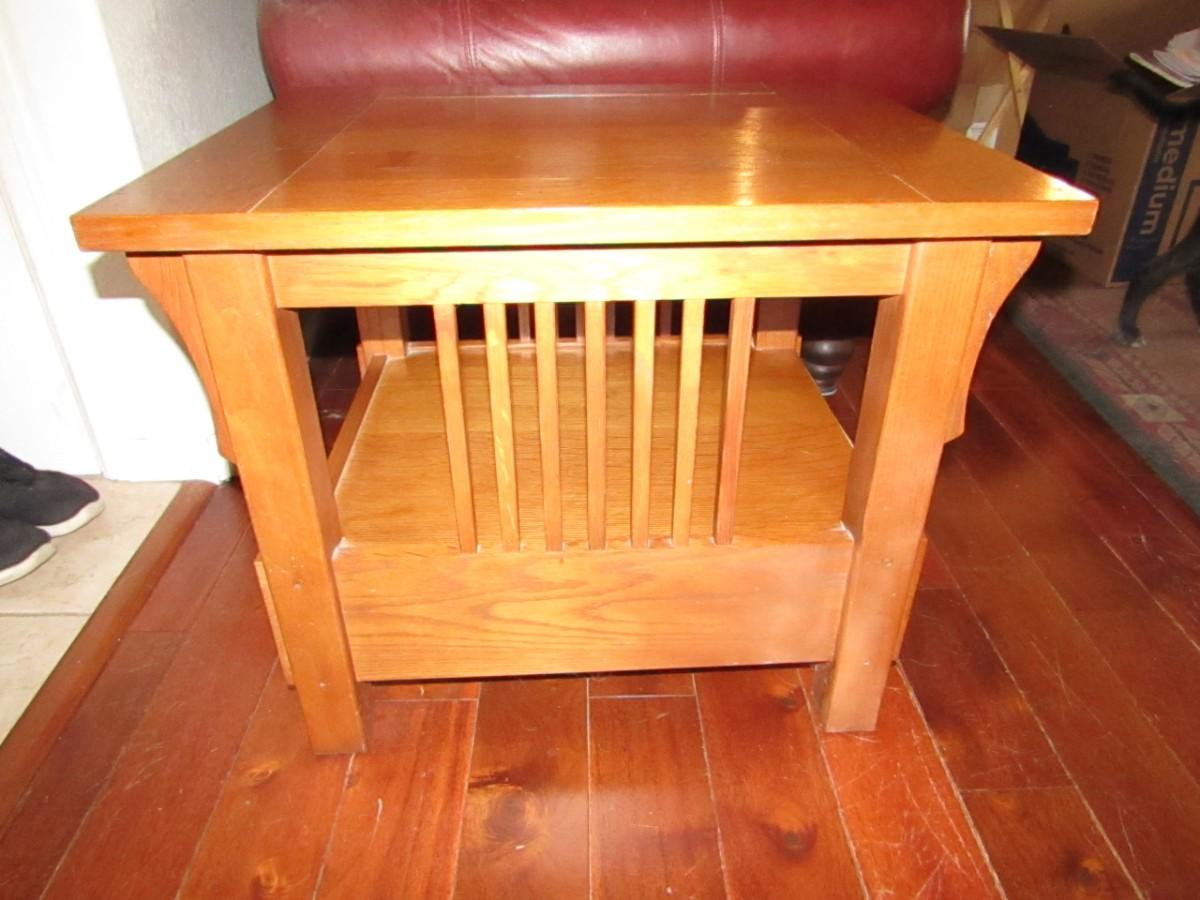 MISSION STYLE END TABLE WITH 1 DRAWER, THE FINISH IS STARTING TO PEEL OFF IN PLACES 22" X 27" X 22"