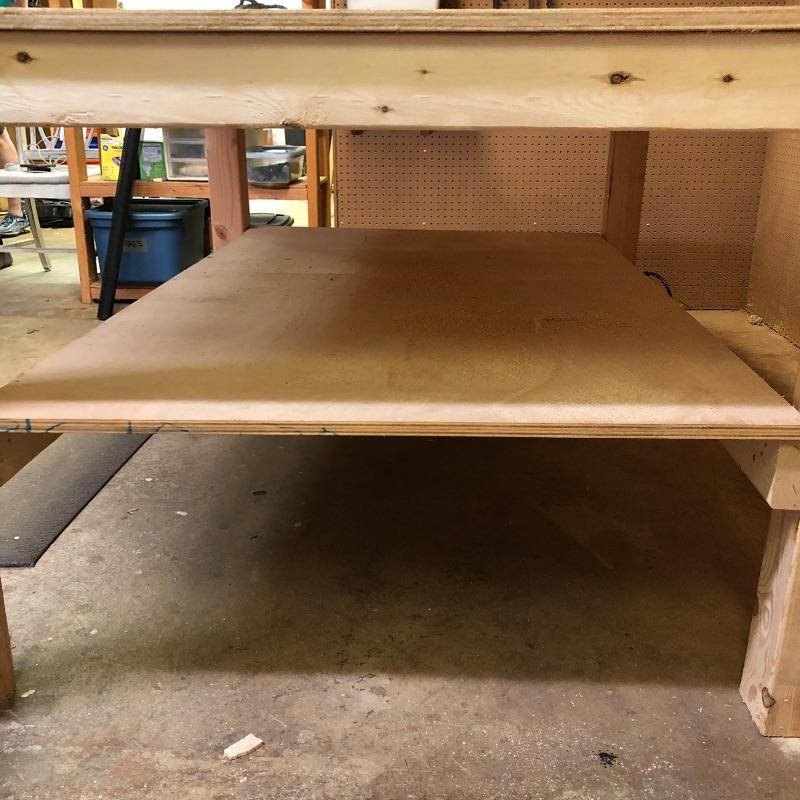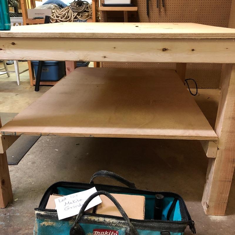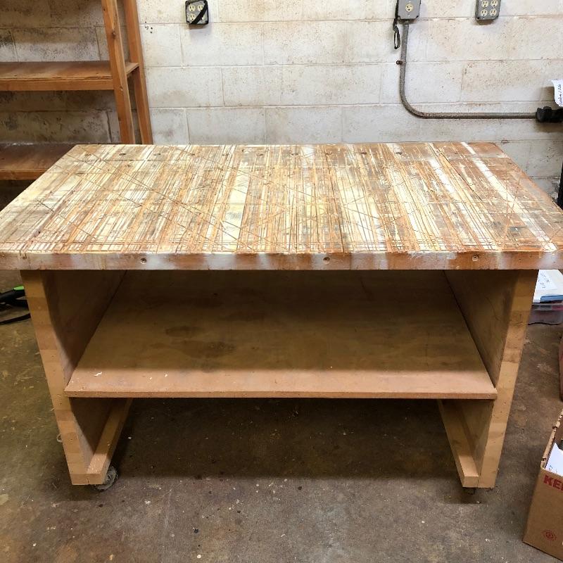 These two work tables are perfect for heavy-duty work, whether it be with saws, sanders, or more. The larger table (66.5” x 48” x 33”) is lighter in color and doesn’t have wheels for rolling. It has a second level shelf for storage. The second, smaller table (51” x 30” x 32”) has seen some wear and tear, but still stands strong and is easily portable, with rolling wheels on the legs. It also has a second, lower shelf for storage. Local pickup only.