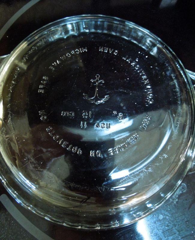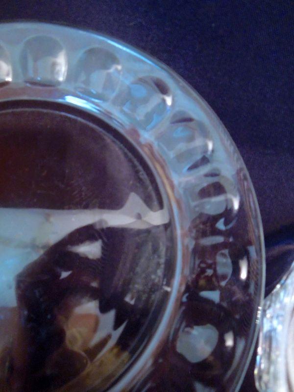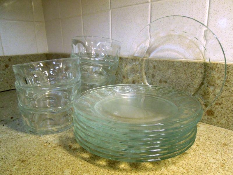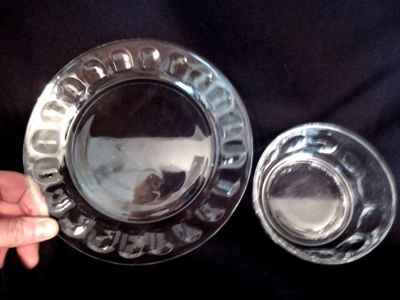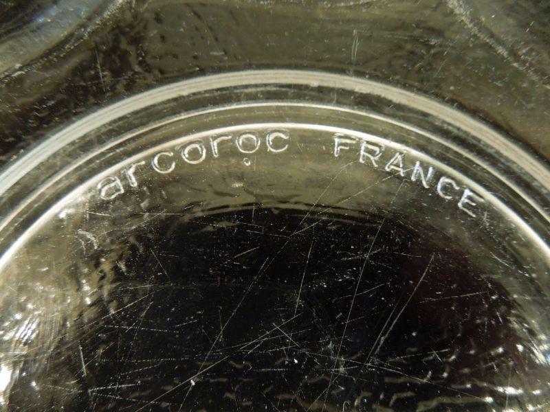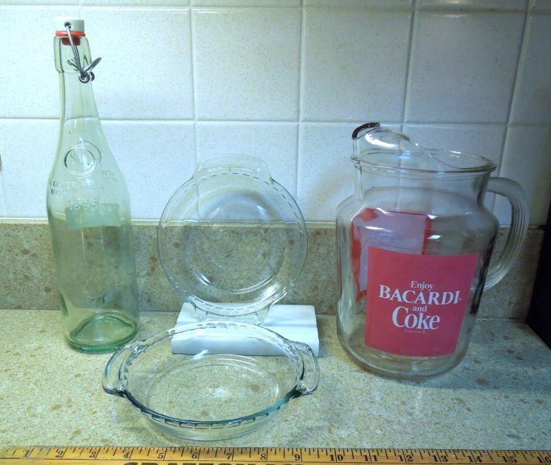 10 Arcoroc France Thumbnail patten 7.5" desert or sald plates and 7 matching bowls (some scratches); a Bacardi glass advertisement pitcher (slightly faded transferware); Geyer Freres stopper bottle; 2 Anchor Hocking ruffle edge clear glass 9"pie plates. No damage other than mentioned.