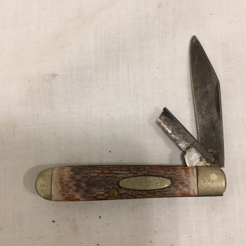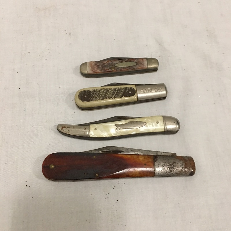 A super selection of four Vintage pocket knives for you collectors that includes Barlow, Case, Imperial and Kabar. Kabar has one broken blade. Largest knife measures 9” long when open.
