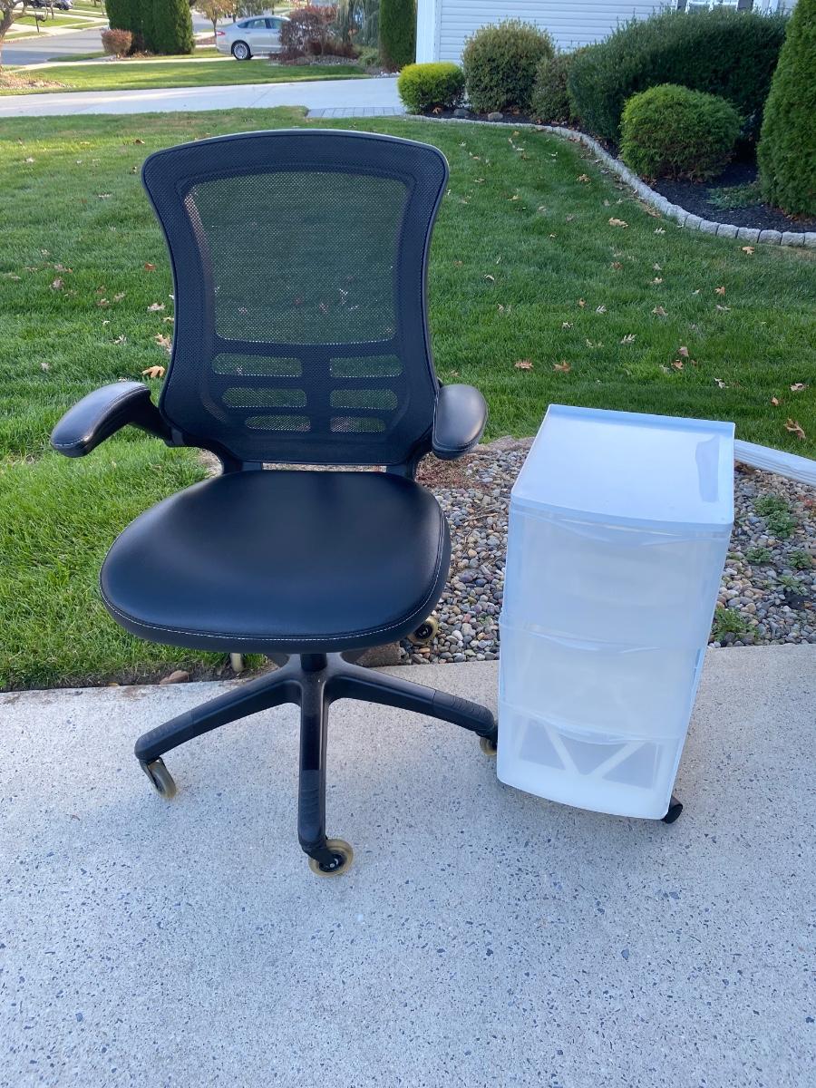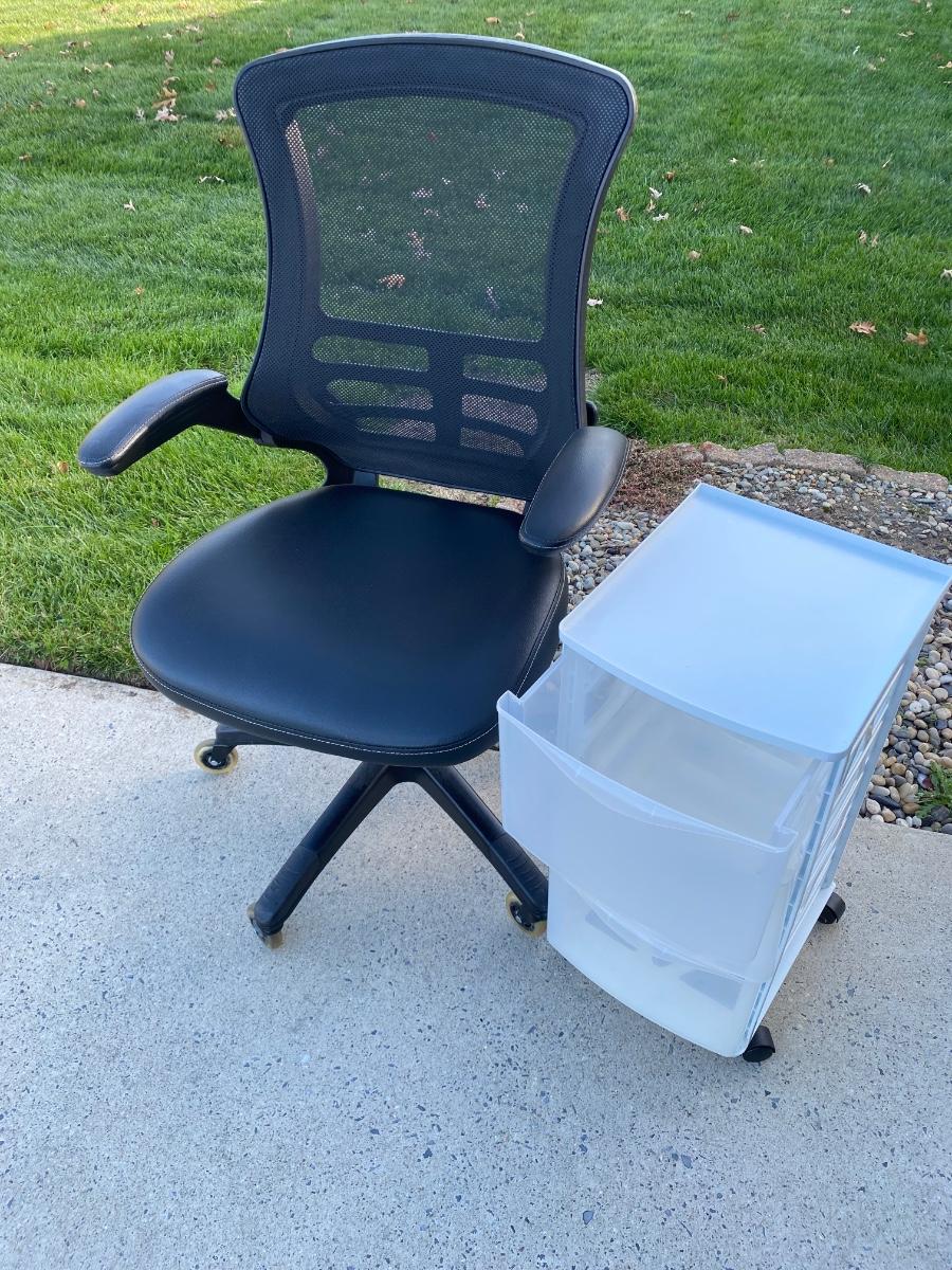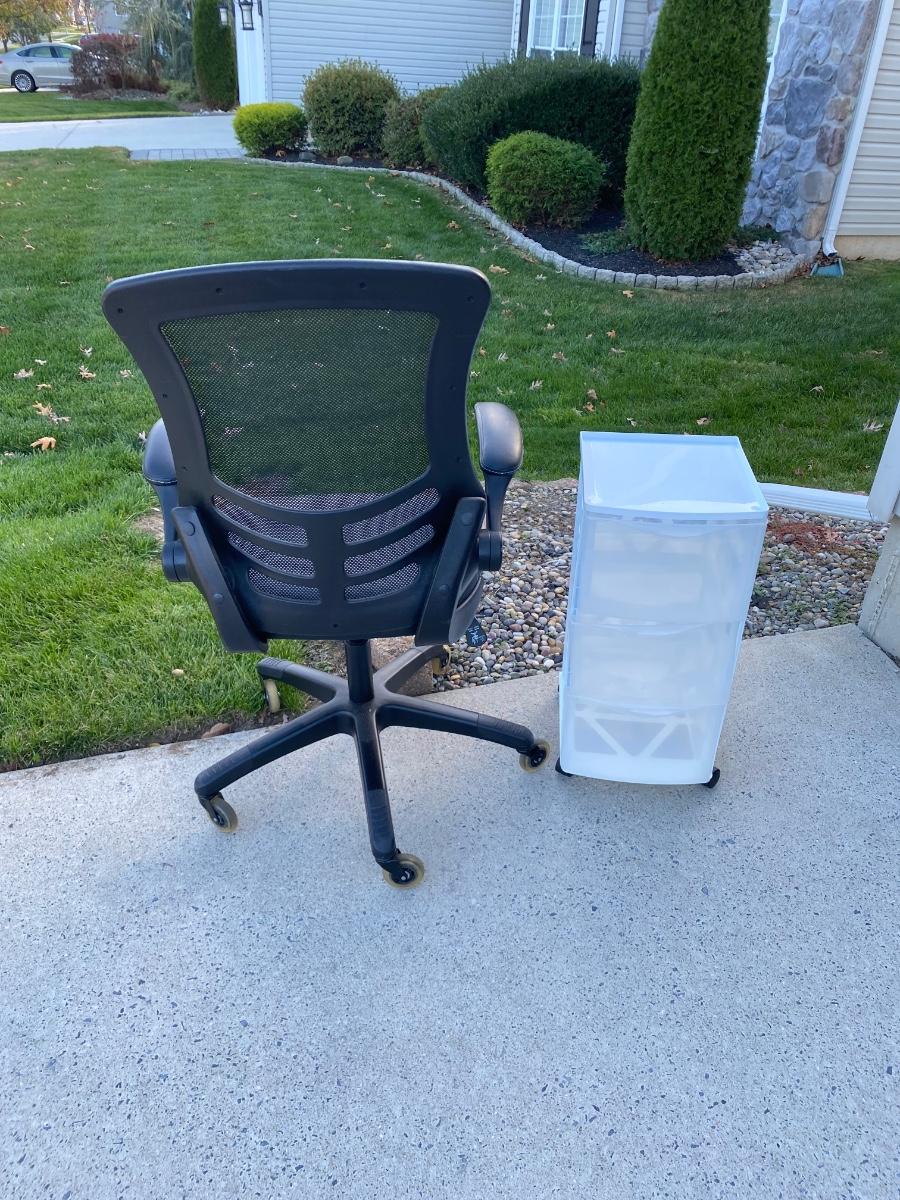 Rolling office desk chair and white/clear plastic drawer for storage. Please see pictures as they are the best representation of the items in the lot and the condition of items.Please see all pictures as they are the best representation of the items. The pictures show condition, measurements if taken, and what is included in the lot. Due to the large amount that we photograph and the time frame, we are not always able to take measurements. All items unless noted, are pre-owned and have been used. If you purchased furniture, you must bring help. We do not allow one person to carry large furniture out on their own. Bring help, tools and a truck for the safety of our client’s homes, and your personal safety. Any damages that result to the property including walls, and floors due to moving of the furniture will be charged to the buyer. Company policy. Thank you.