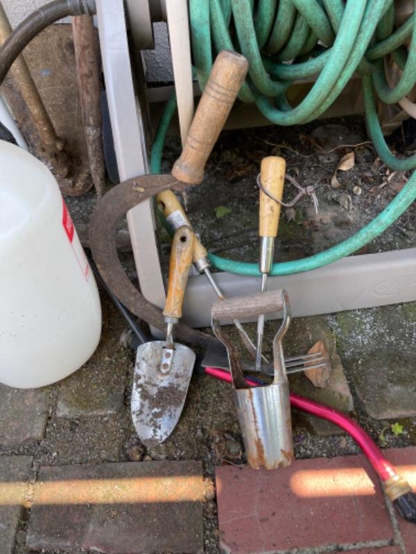 Lot 170G. Antique ladder approximately 12 feet for decorative purposes only, weed hacker, water hose holder--$37.50