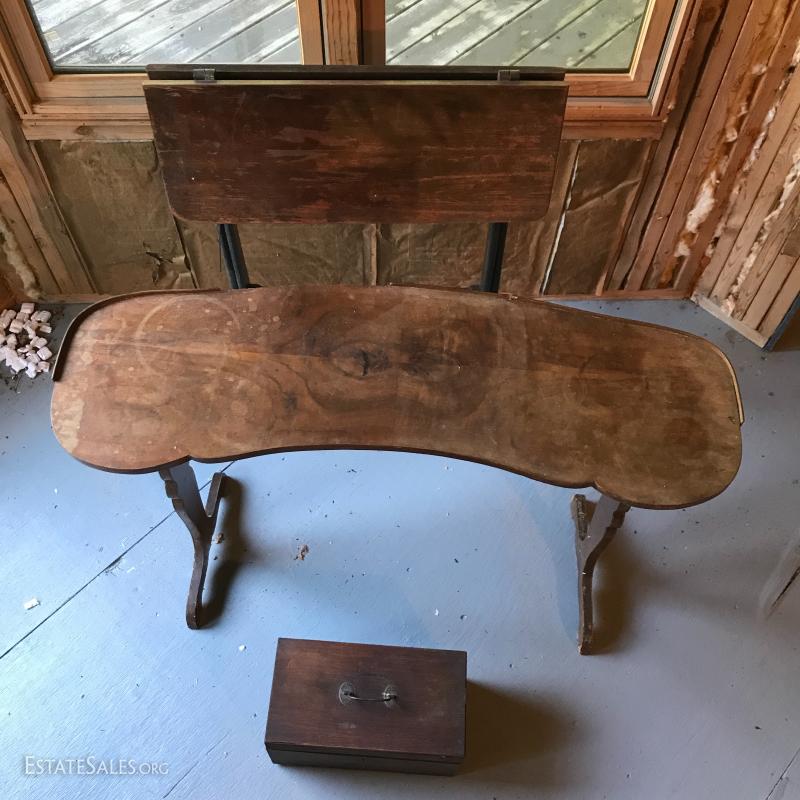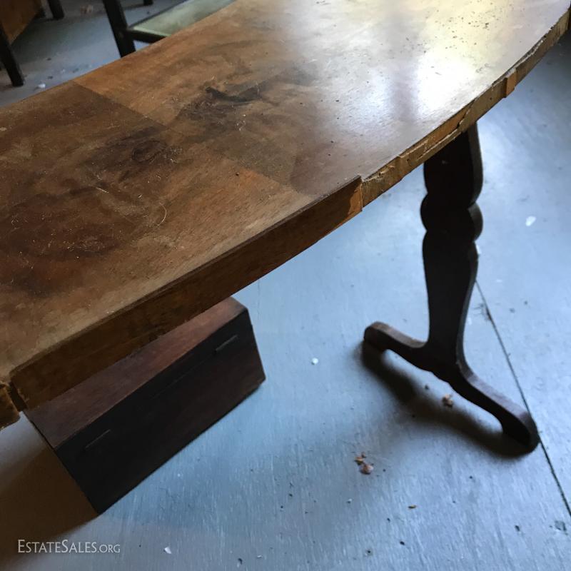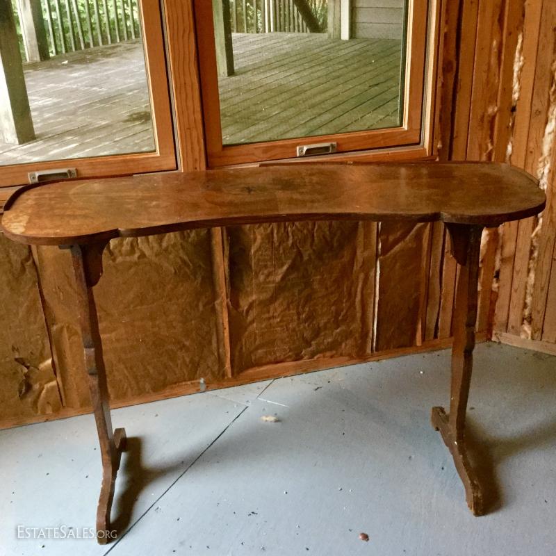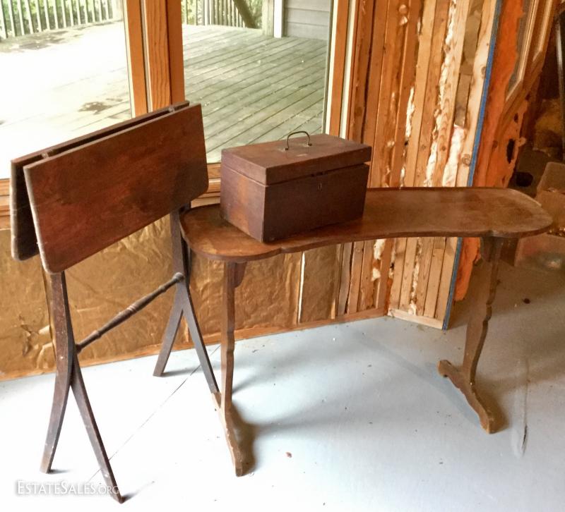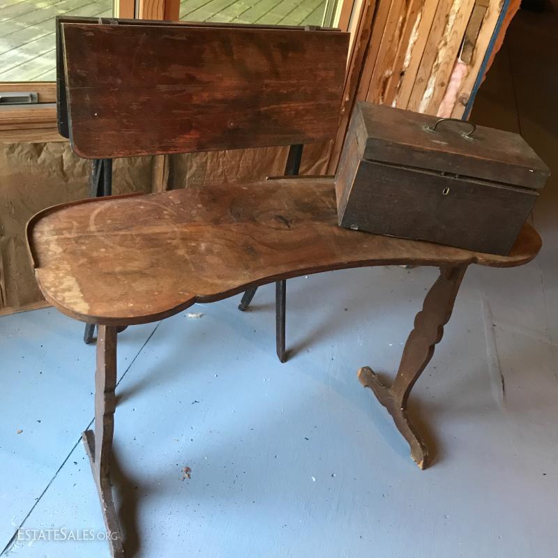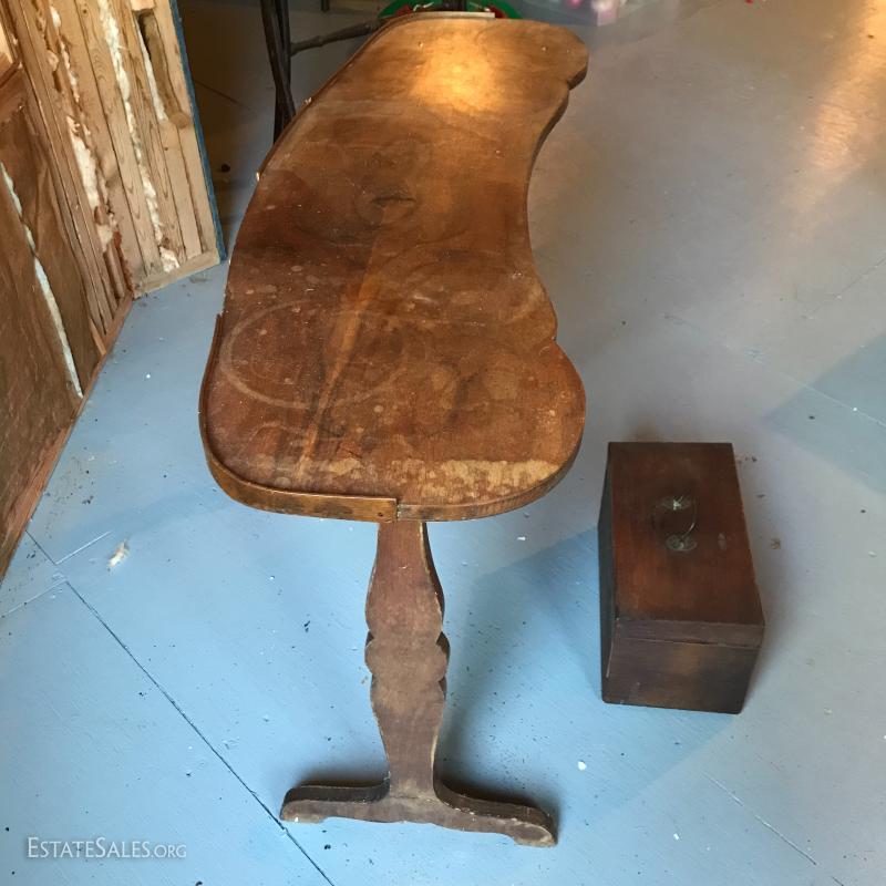 Gorgeous style on the skinny curved side table. It measures 38.5"l x 11.5"w x 26" h . Lot also includes a great wooden folding table that opens to 24"l x 19"w x 27.5"h. Nice wooden box with insert (13"l x 7"w x 7"h) also included in lot. All need some TLC but are sturdy. See photos. No Shipping. Only local pick up in Flat Rock, NC.
