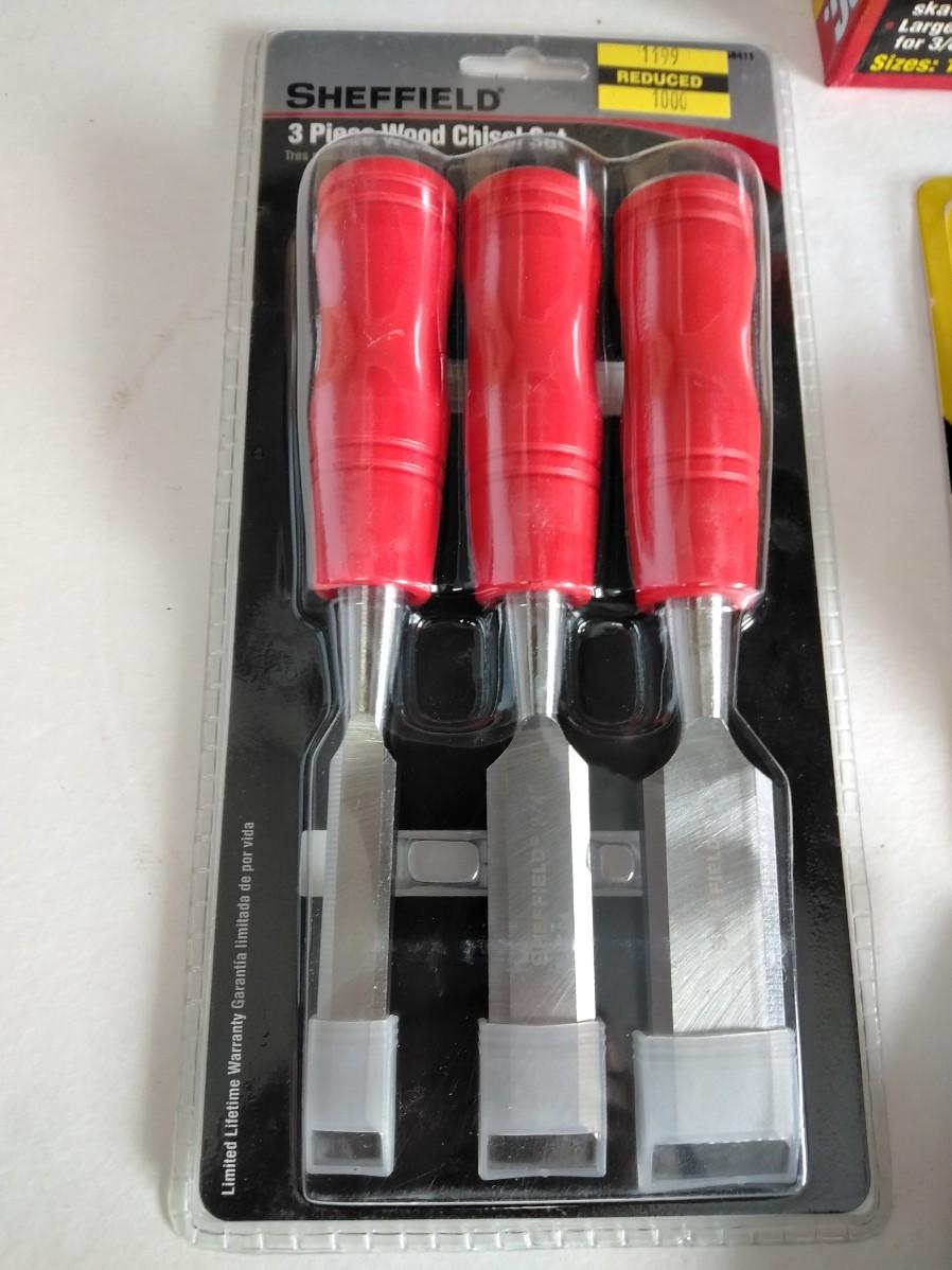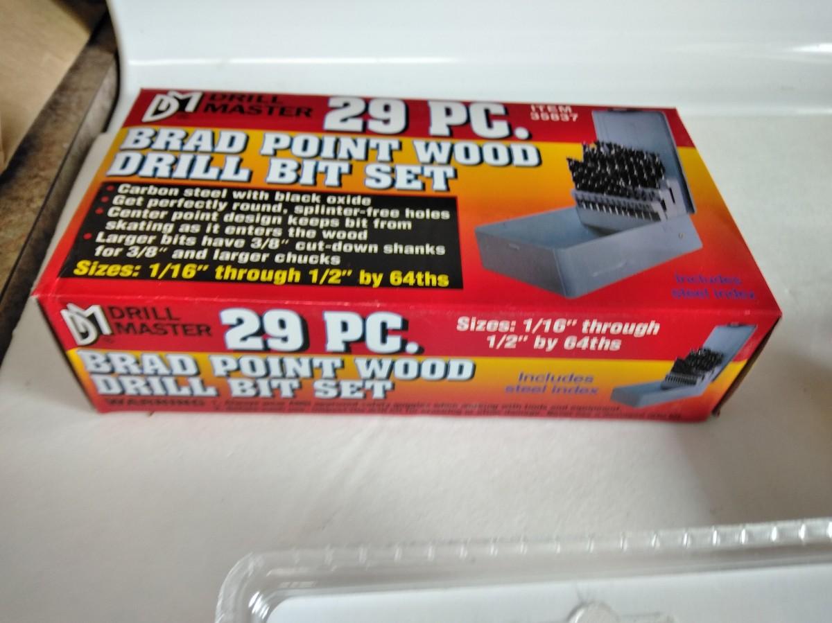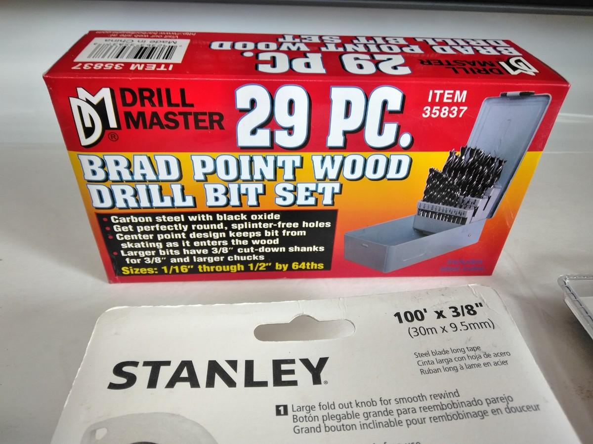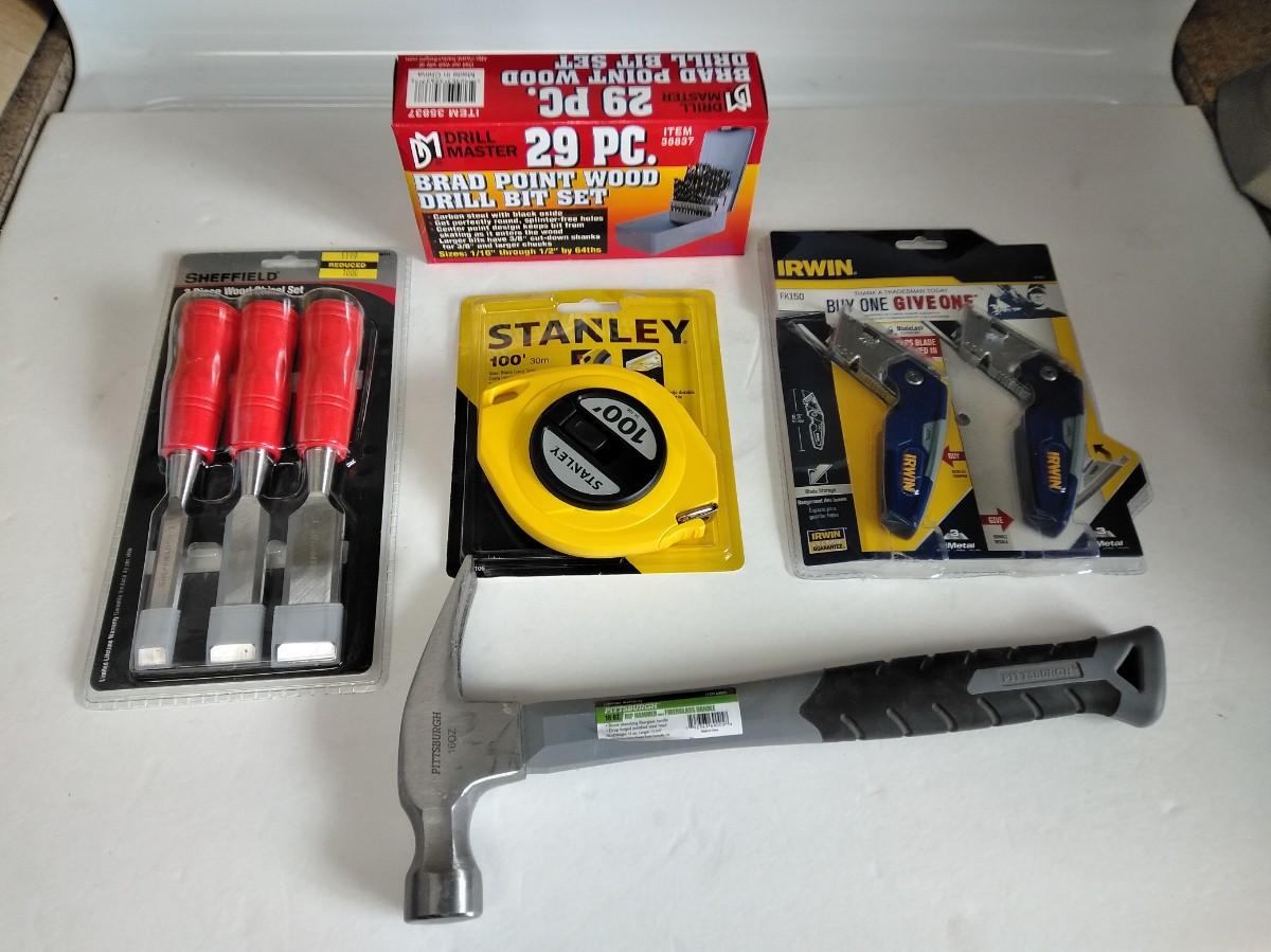 29 PIECE BRAD POINT WOOD DRILL BIT SET, SHEFFIELD THREE PIECE WOOD CHISEL SET, STANLEY 100' TAPE MEASURE, PITTSBURGH 16 OZ. HAMMER, AND IRWIN LOCK BLADE UTILITY KNIVES.