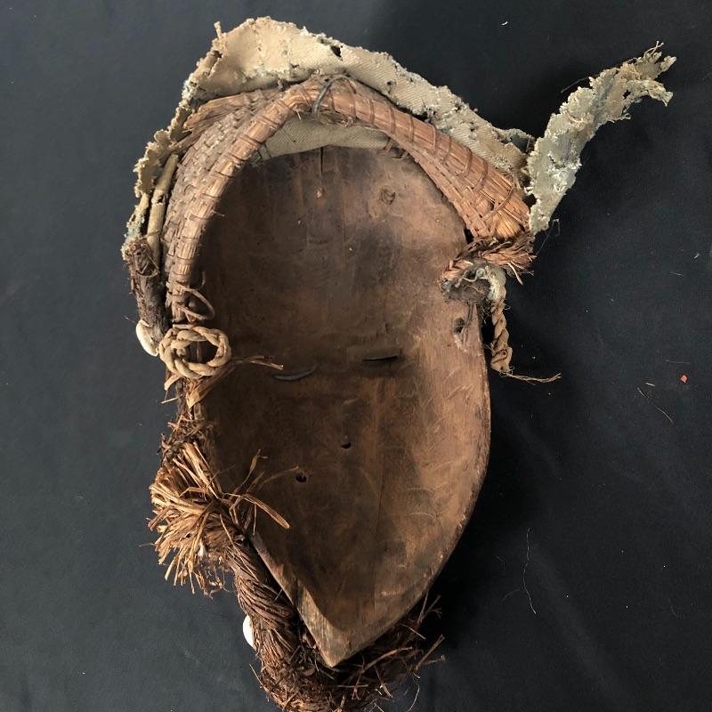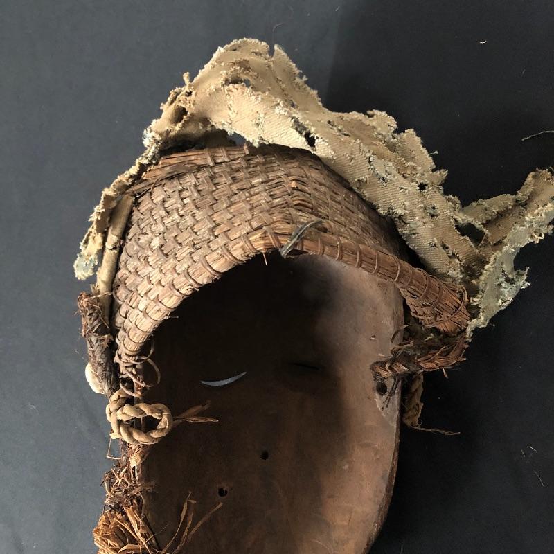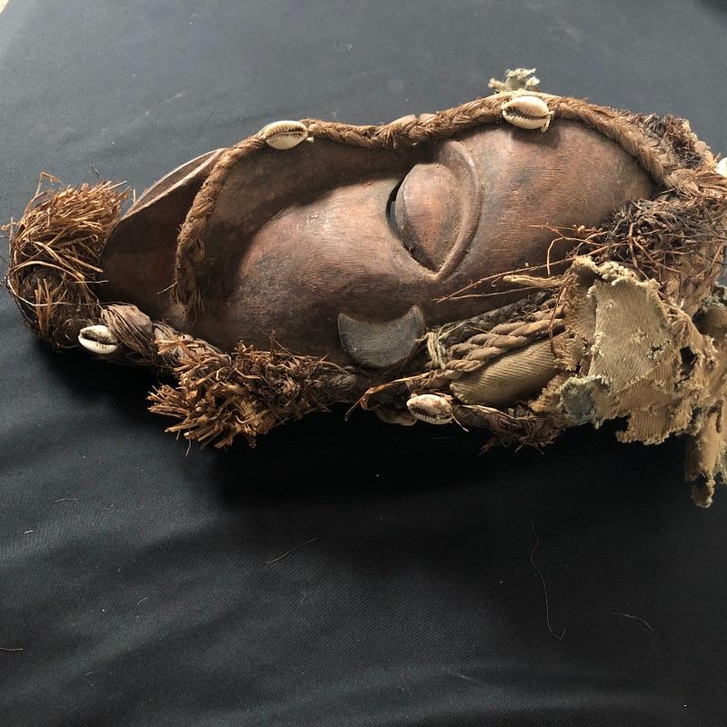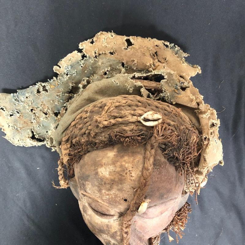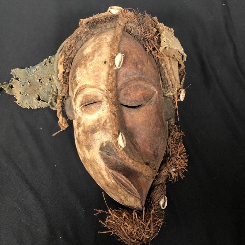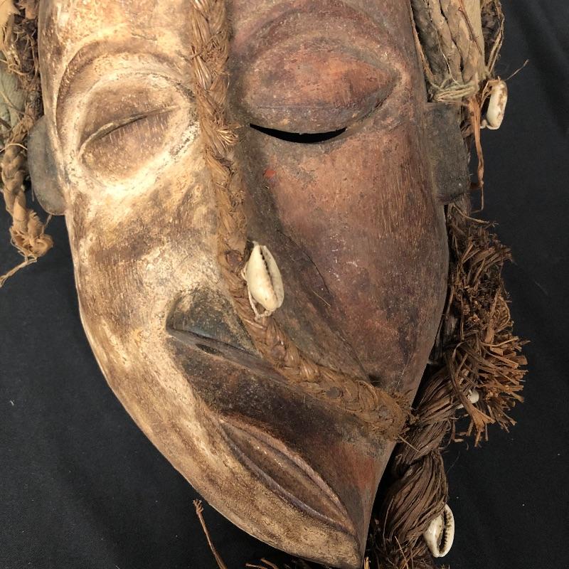 This unique mask is made to look very distorted, with the features slanted and the face being two different colors. It has a headdress made out of braided and woven materials. There are also shells woven into the hair. Think Picasso!