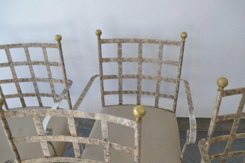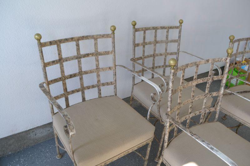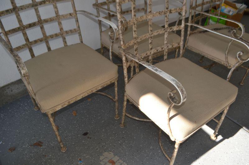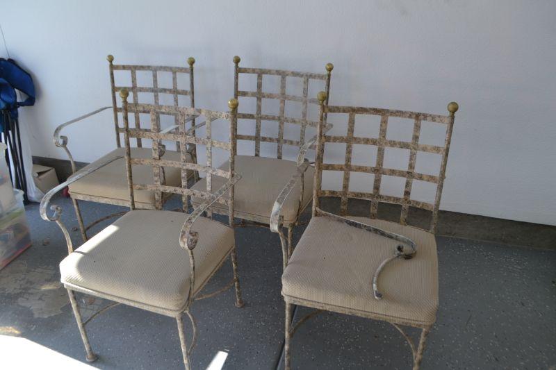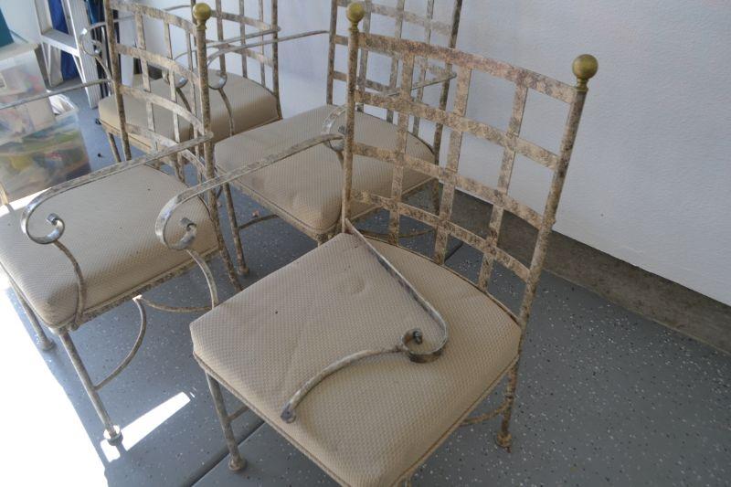 FOUR METAL PATIO CHAIRS ONE CHAIR WITH BROKEN ARM