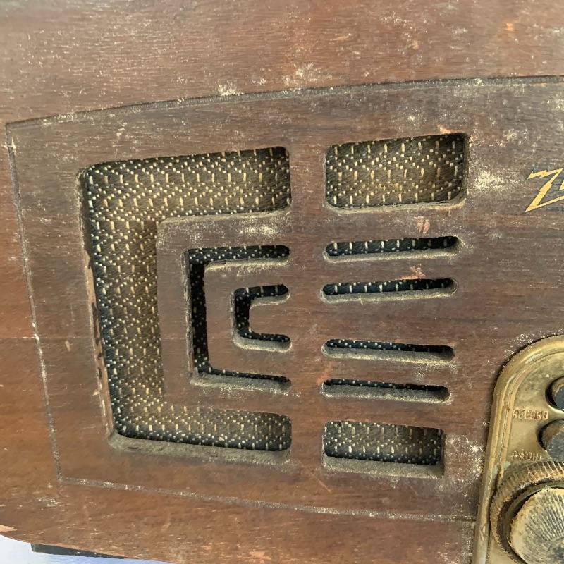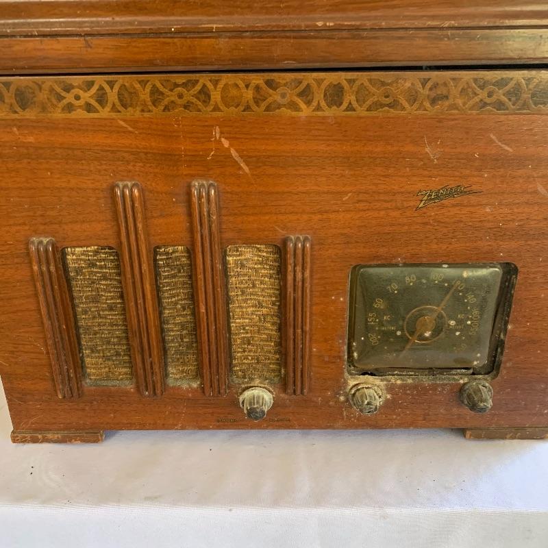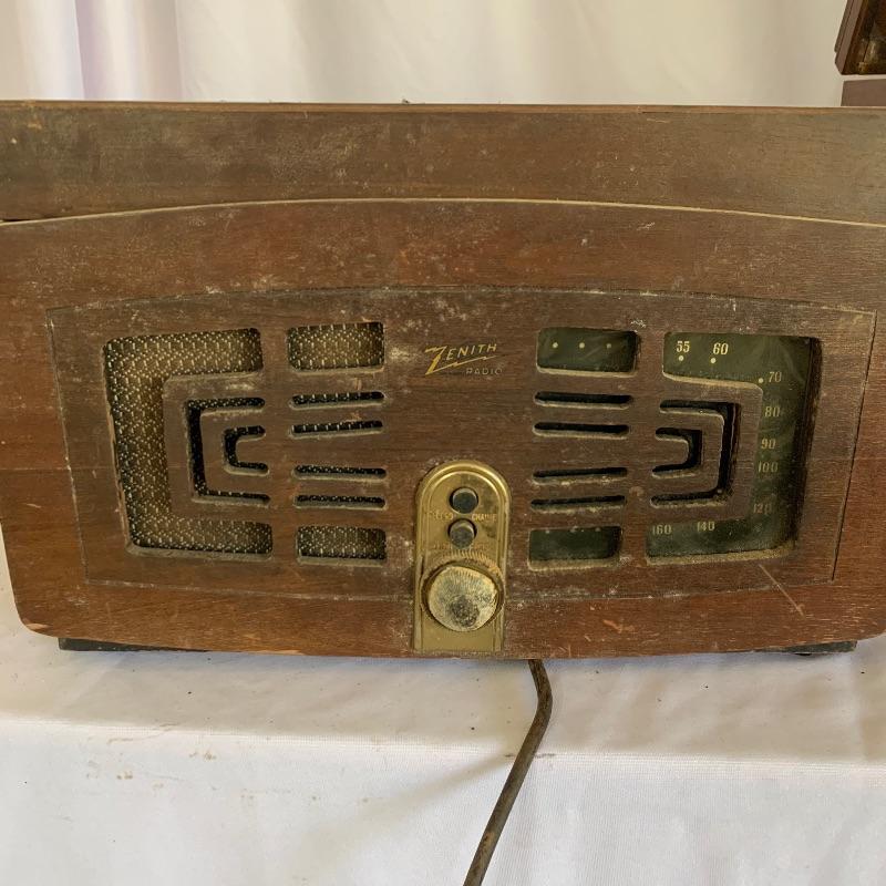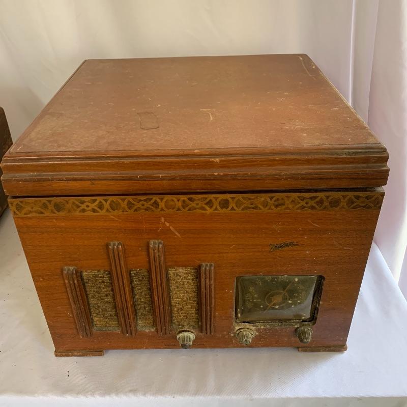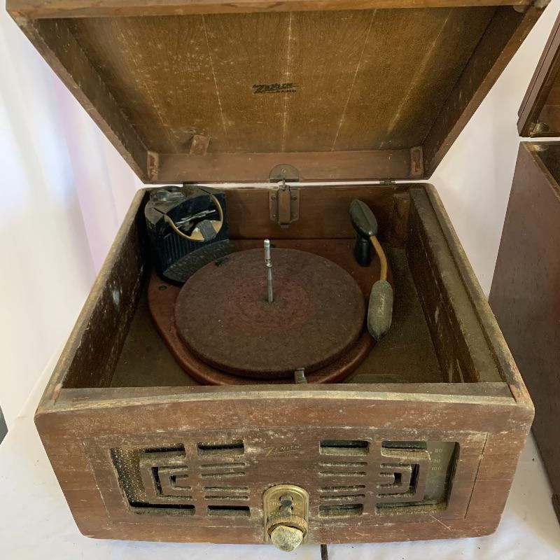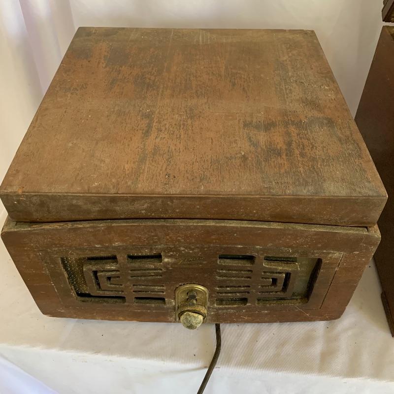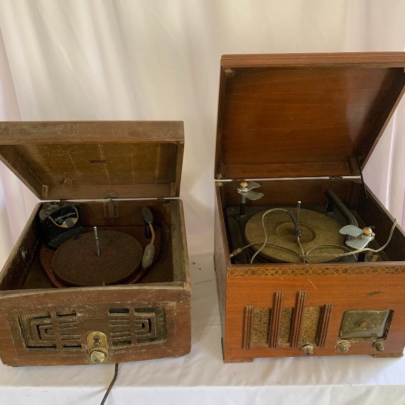 This lot includes two vintage wooden Zenith radio and turntables. The smaller turntable made of a lightweight wood that has some stains and discolouration (see photos). It also has a rusted dial on the front. The cord appears to be rusty. It measures about 15.5in x 16in x 10.5in. The bigger turntable is made of a lightweight reddish color wood. The wood has some scratches on it (see photos). The dials and front panels have rust and signs of aging. The cord has duct tape on it. It measures about 15.5in x 16.5in x 13in. Cannot confirm either turntable works.