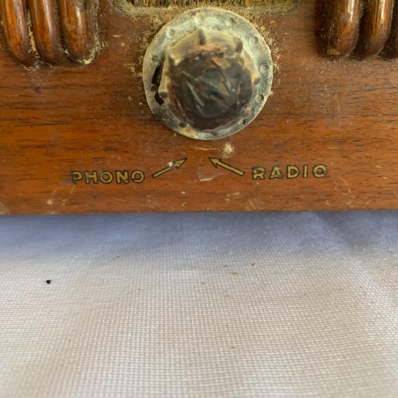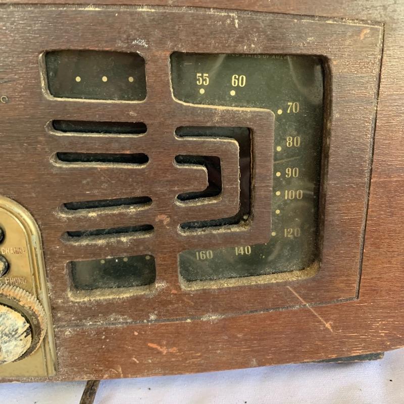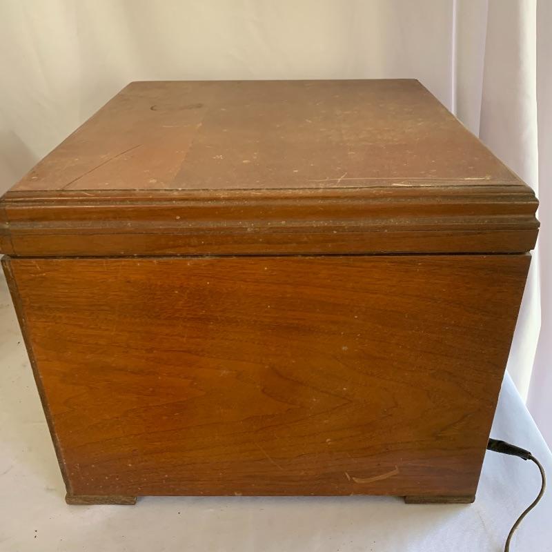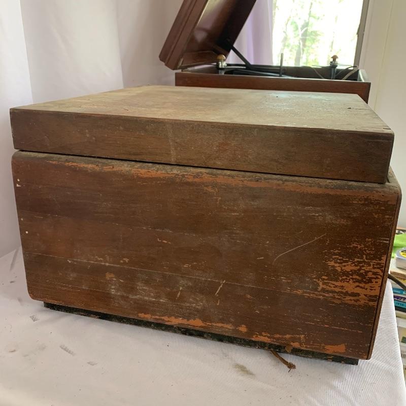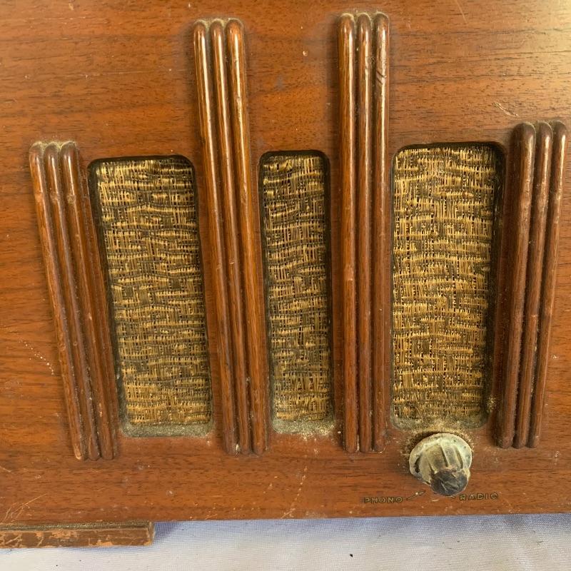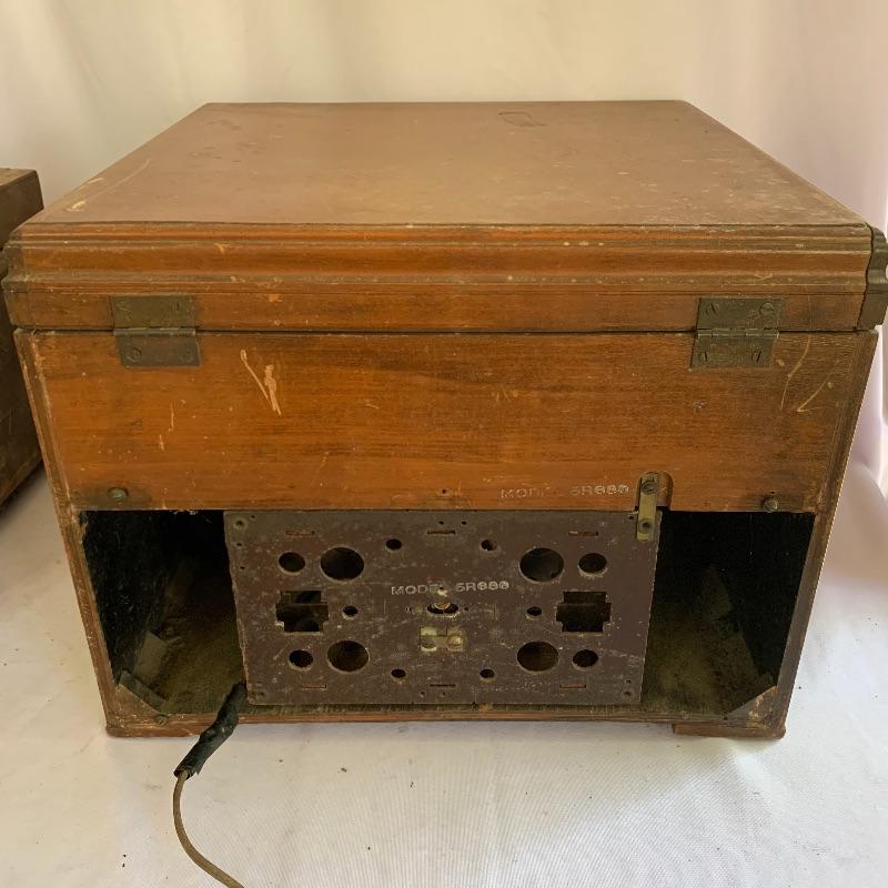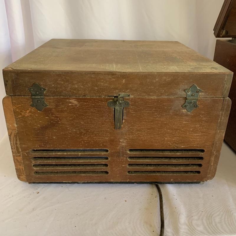 This lot includes two vintage wooden Zenith radio and turntables. The smaller turntable made of a lightweight wood that has some stains and discolouration (see photos). It also has a rusted dial on the front. The cord appears to be rusty. It measures about 15.5in x 16in x 10.5in. The bigger turntable is made of a lightweight reddish color wood. The wood has some scratches on it (see photos). The dials and front panels have rust and signs of aging. The cord has duct tape on it. It measures about 15.5in x 16.5in x 13in. Cannot confirm either turntable works.