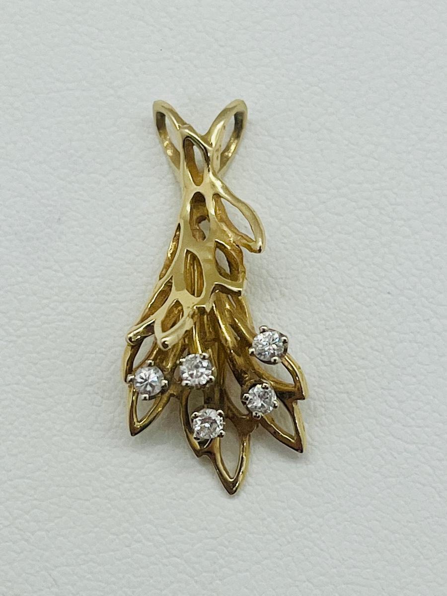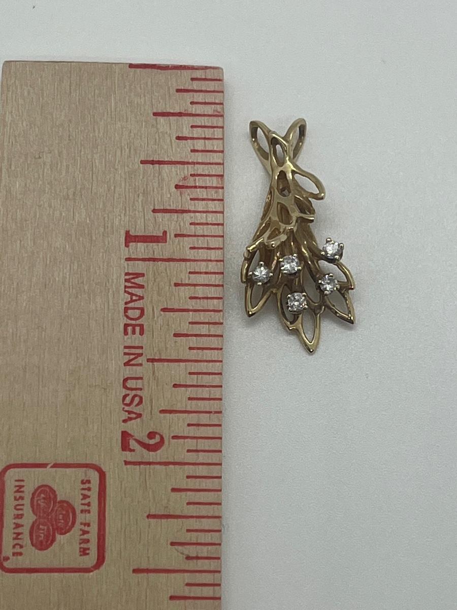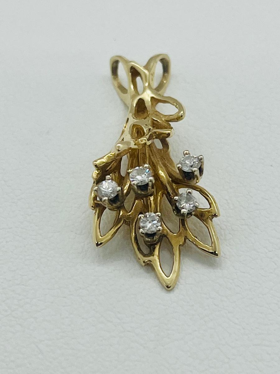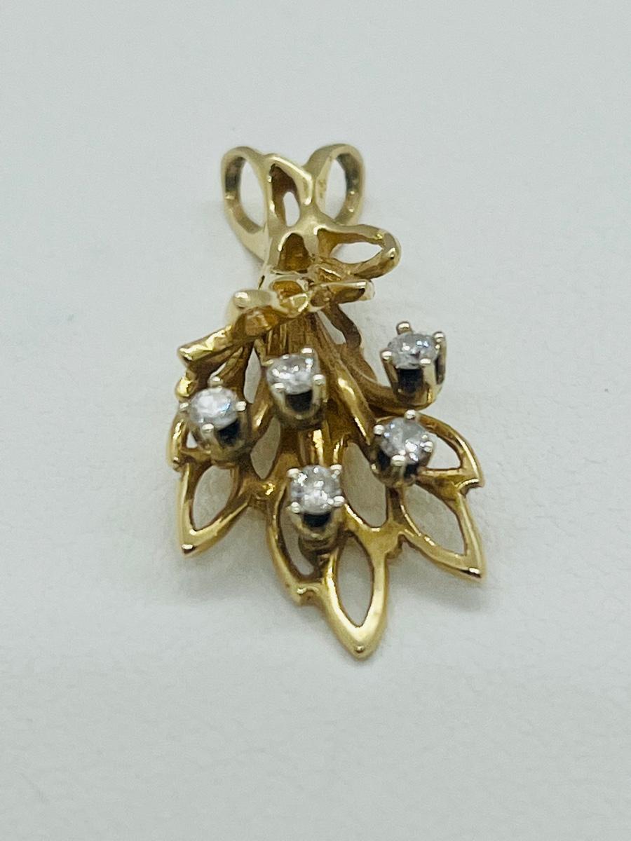 5 beautiful diamonds set in 14k yellow gold pendant. 3.5g. The pictures show condition, measurements if taken, and what is included in the lot. Due to the large amount that we photograph and the time frame, we are not always able to take measurements. All items unless noted, are pre-owned and have been used, and are untested. Thank you