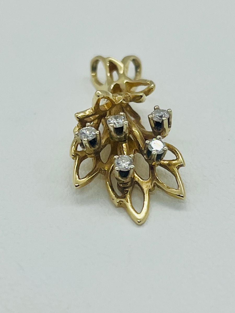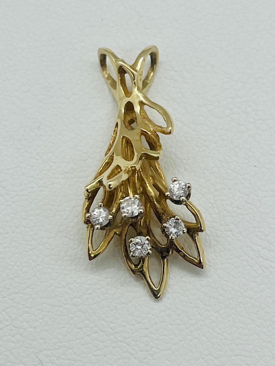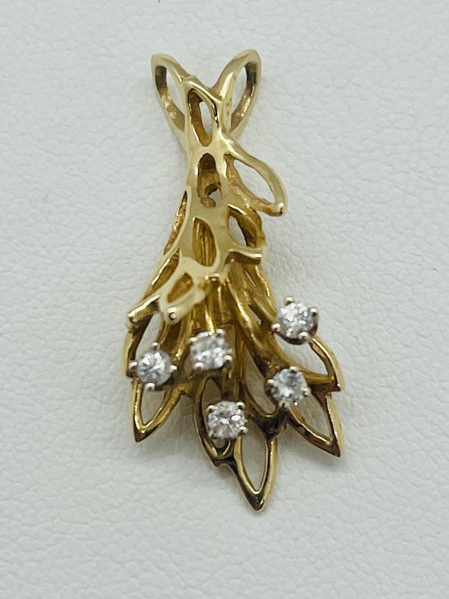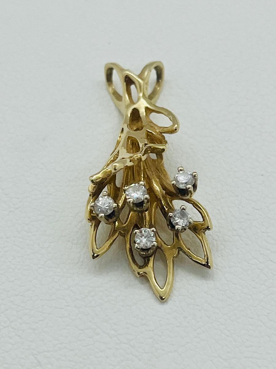 5 beautiful diamonds set in 14k yellow gold pendant. 3.5g. The pictures show condition, measurements if taken, and what is included in the lot. Due to the large amount that we photograph and the time frame, we are not always able to take measurements. All items unless noted, are pre-owned and have been used, and are untested. Thank you
