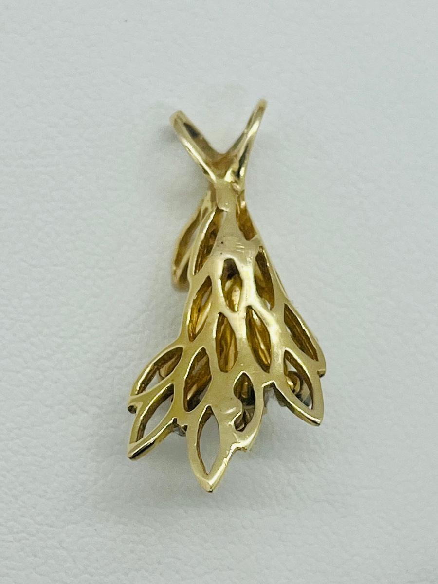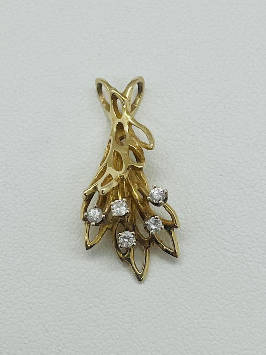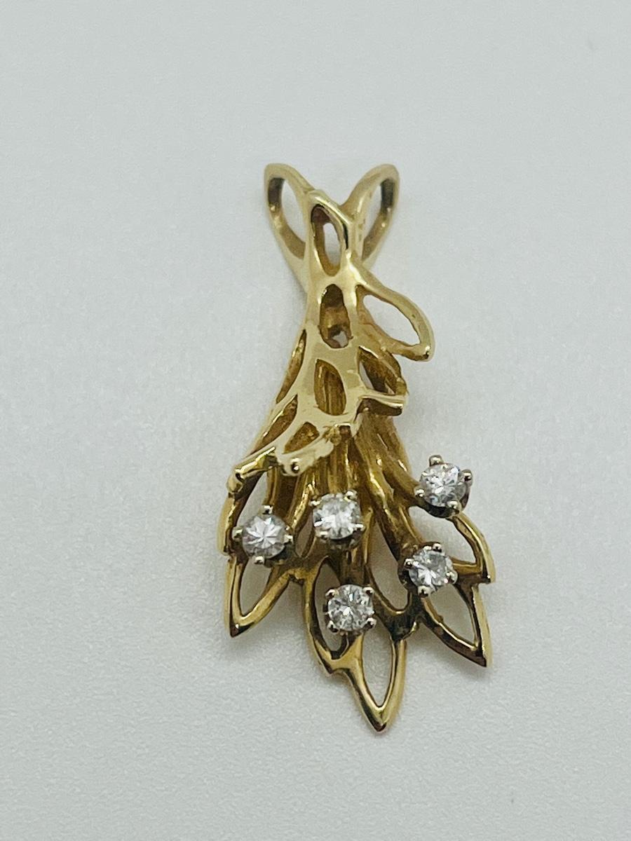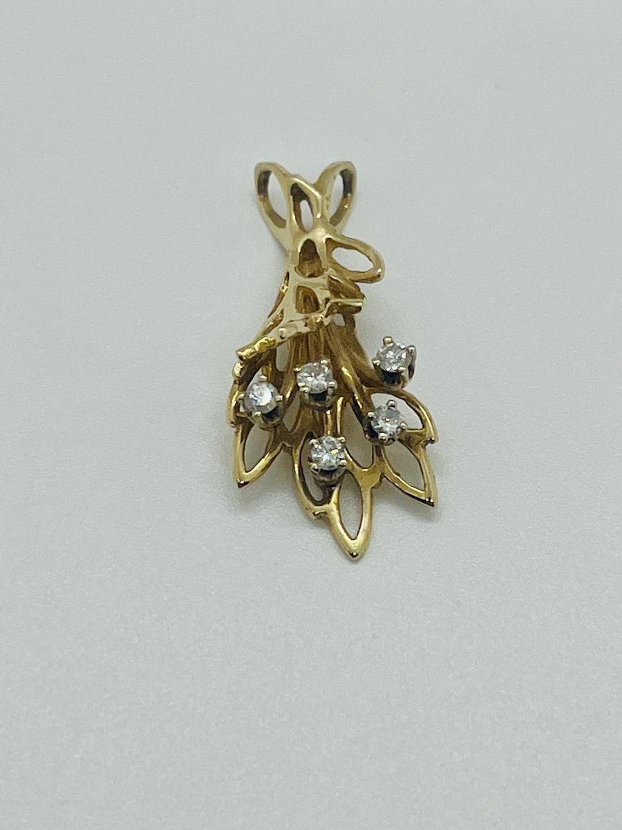 5 beautiful diamonds set in 14k yellow gold pendant. 3.5g. The pictures show condition, measurements if taken, and what is included in the lot. Due to the large amount that we photograph and the time frame, we are not always able to take measurements. All items unless noted, are pre-owned and have been used, and are untested. Thank you
