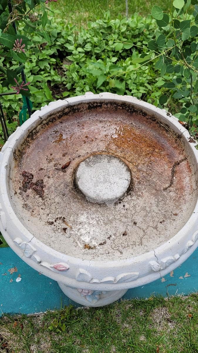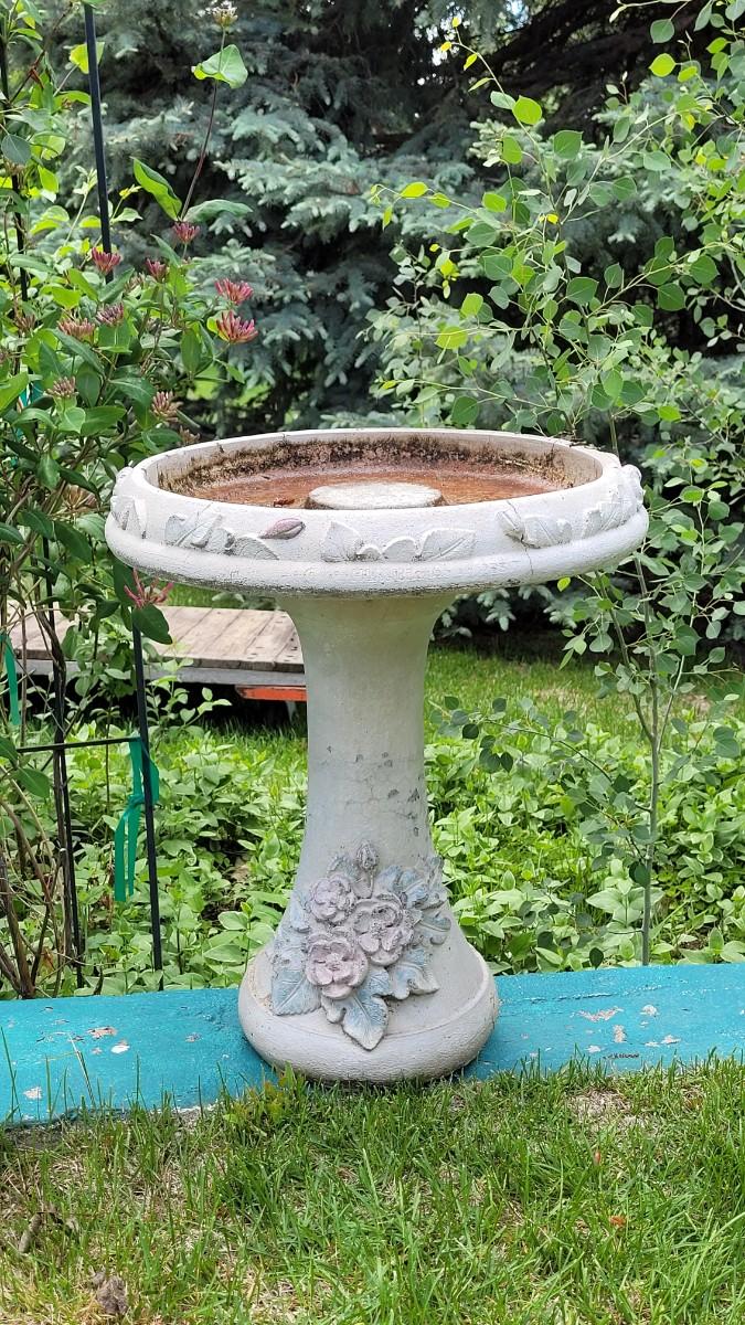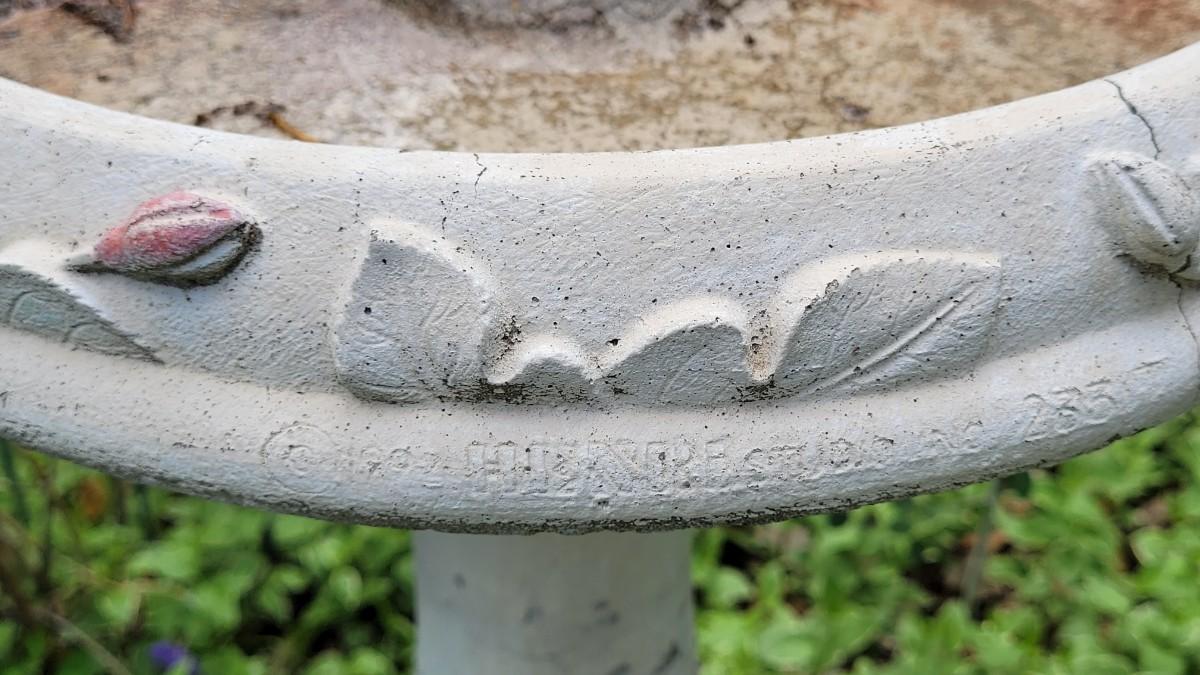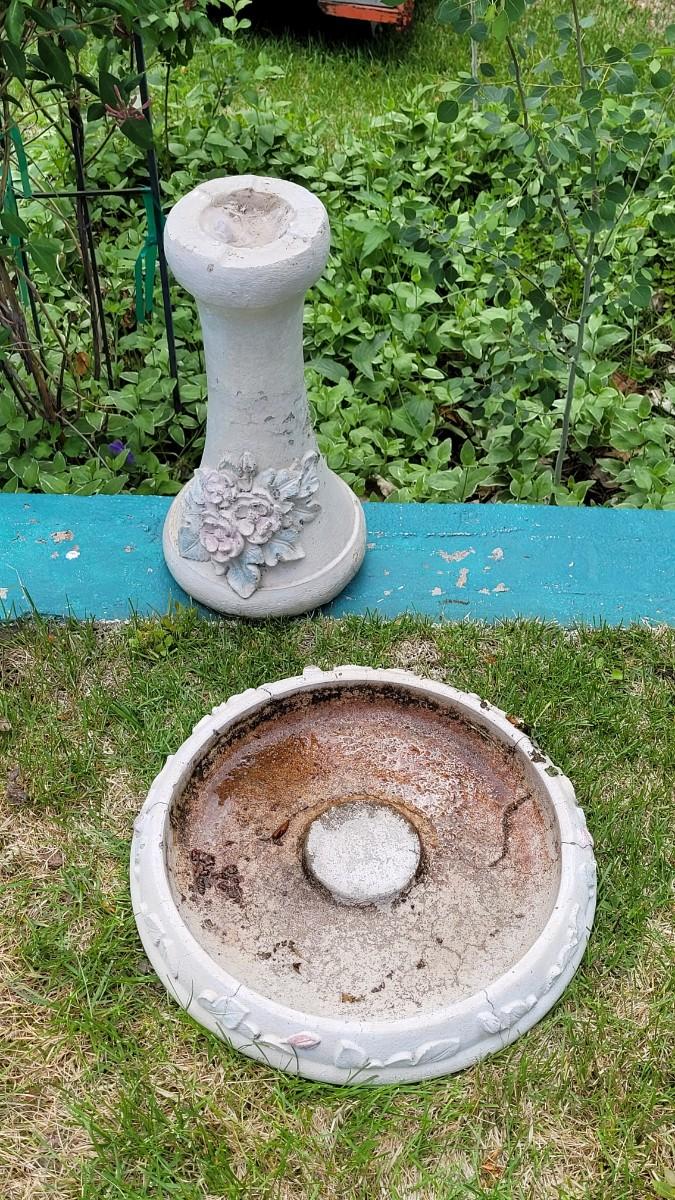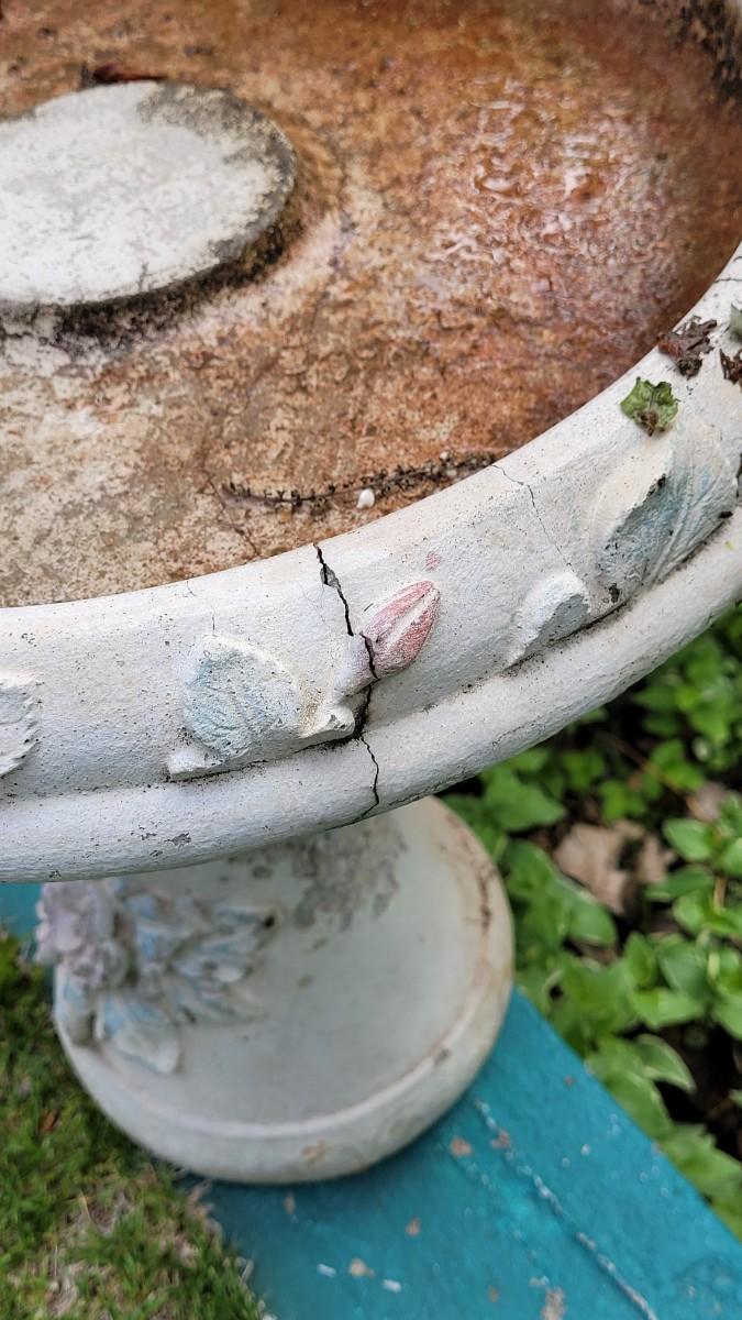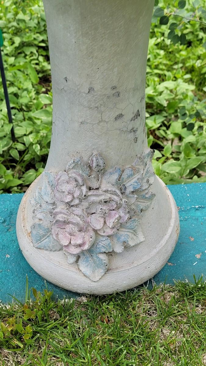 The bird bath is 2 pieces. The bowl has some cracks but holds water. The floral design still shows signs of original paint.